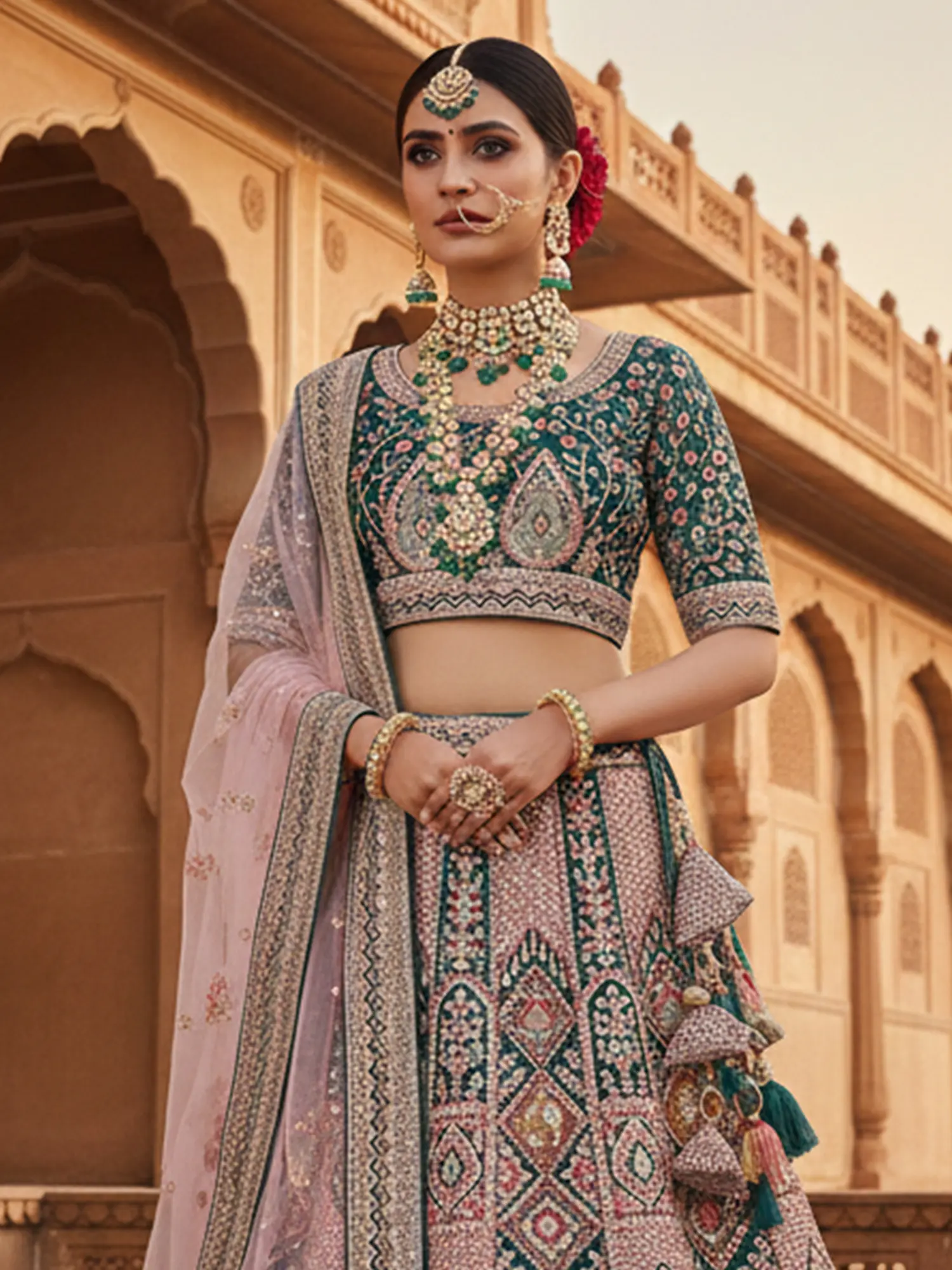 Luxurious velvet lehenga choli adorned with intricate Zardosi embroidery.