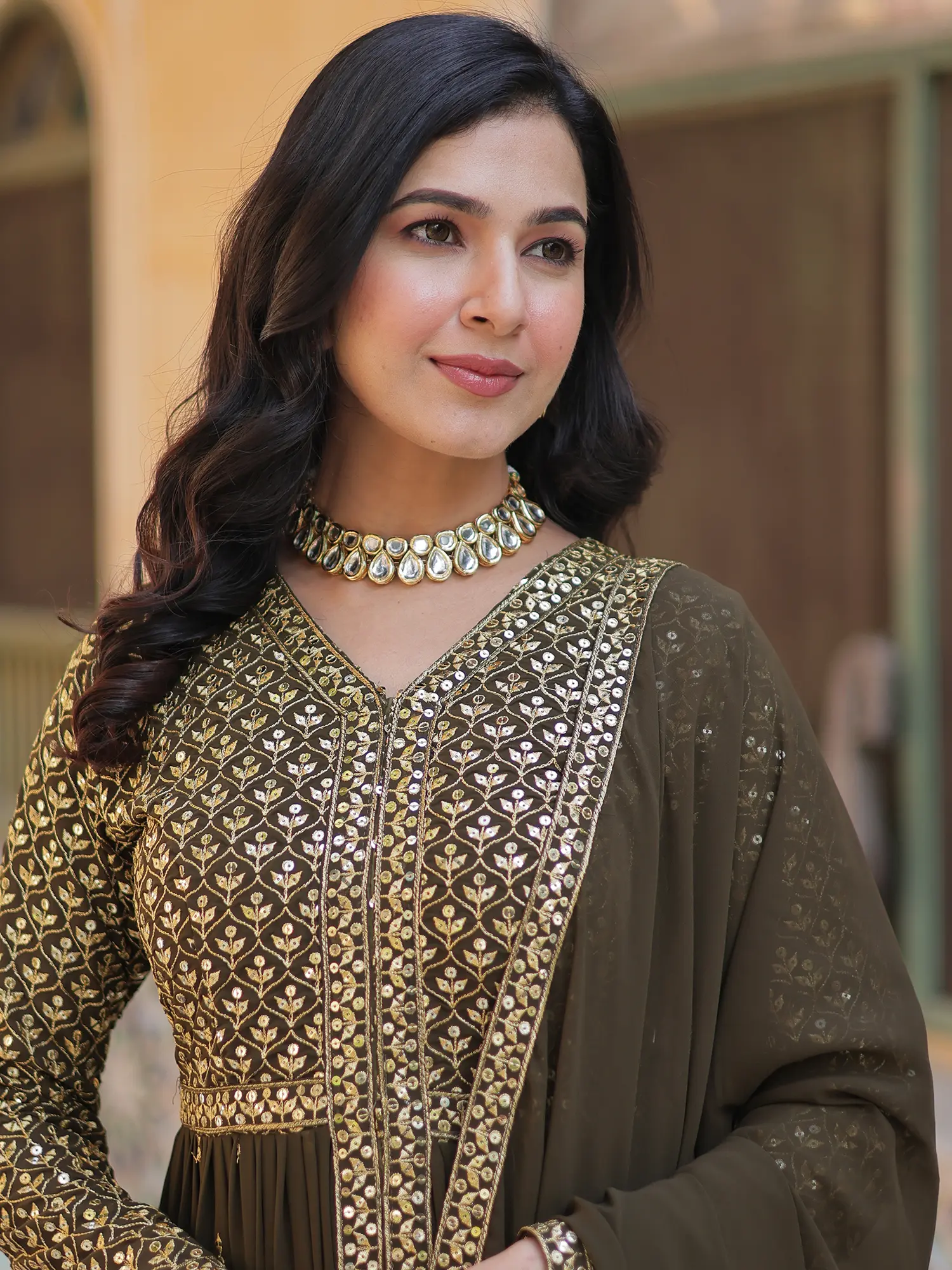 Gorgeous Floor Length Faux Georgette Gown Paired With Dupatta In Luxurious Heavy Sequins Embroidered Design