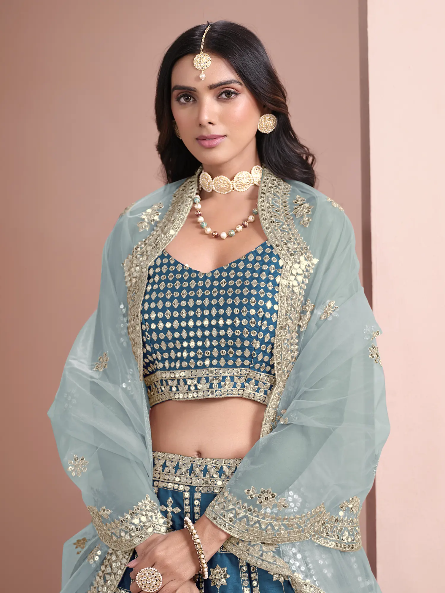 Teal Taffeta Silk Beautiful Floral Zari Embroidery Lehenga Choli with Beige Sheer Dupatta