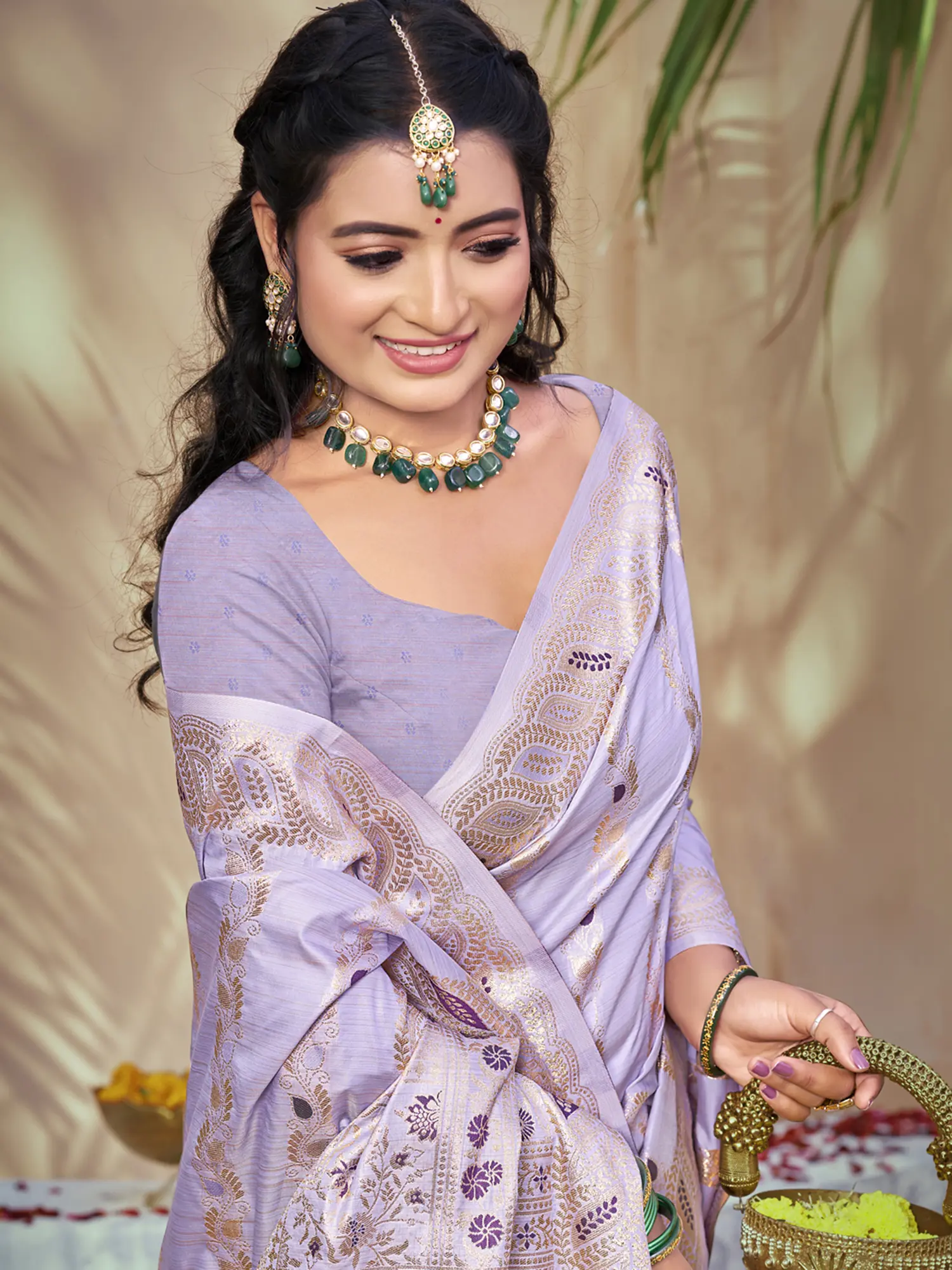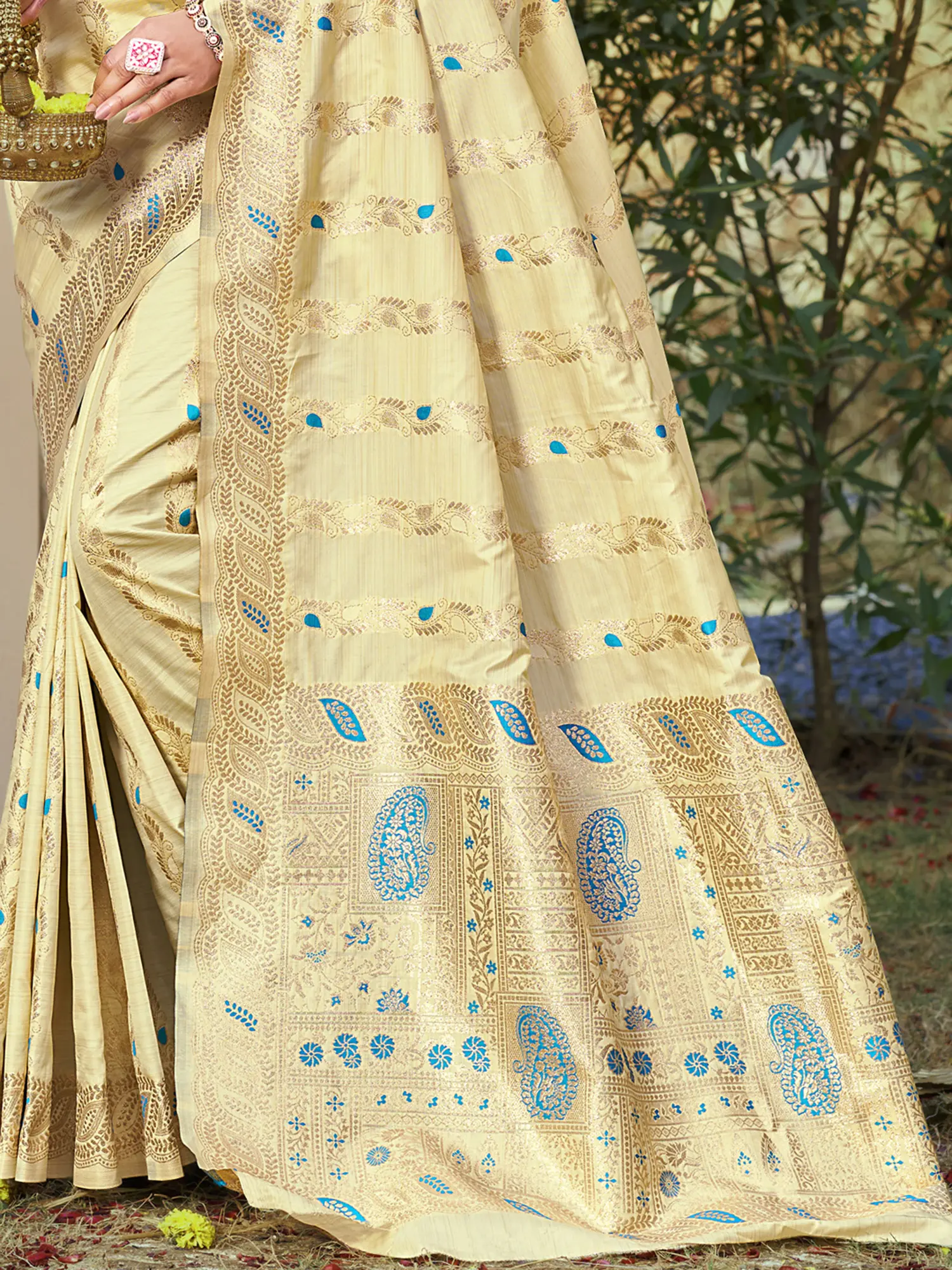 Woven Motifs All Over Soft Silk Elegant Festive Wear Saree With Contrast Tassels Pallu