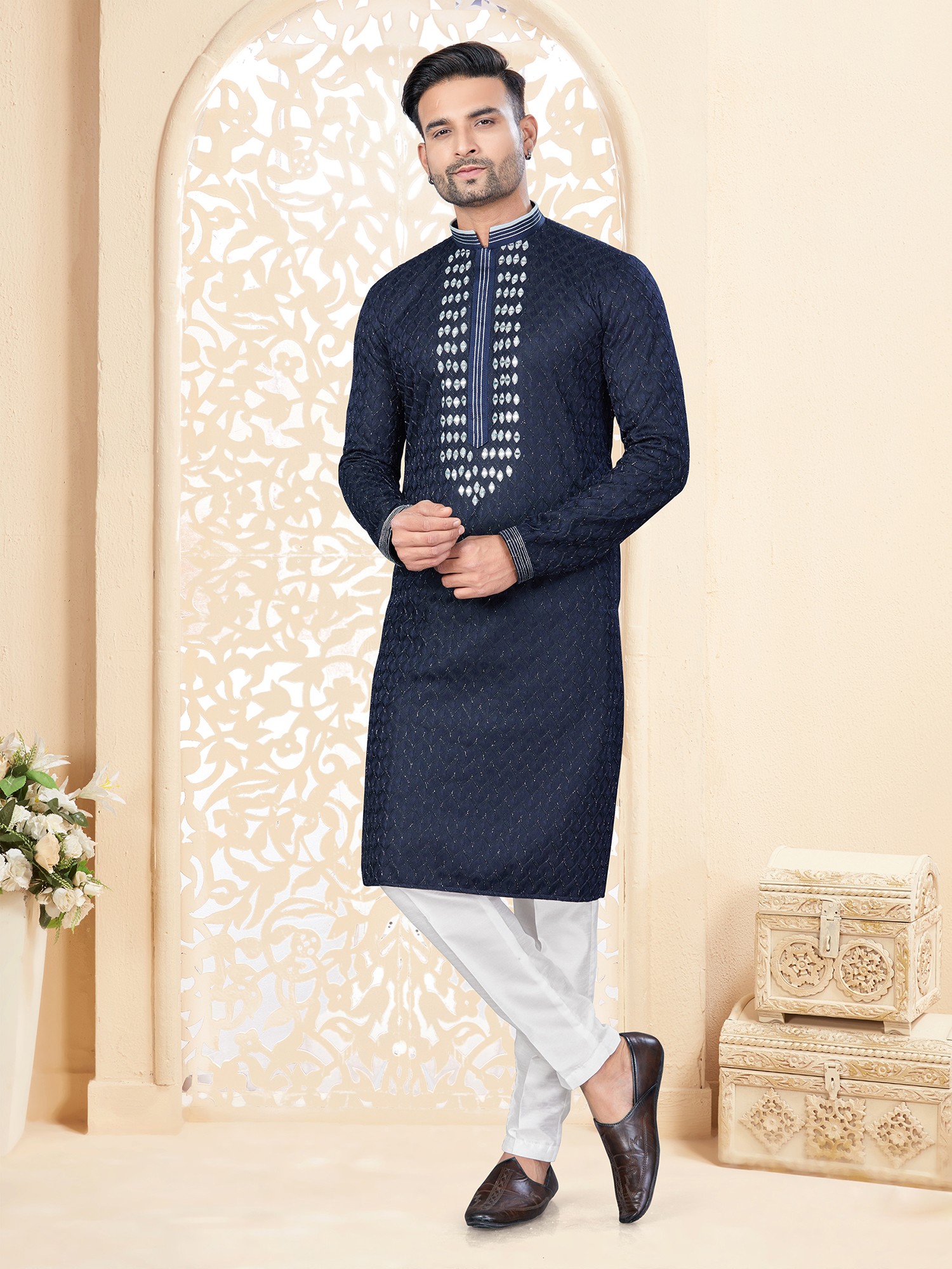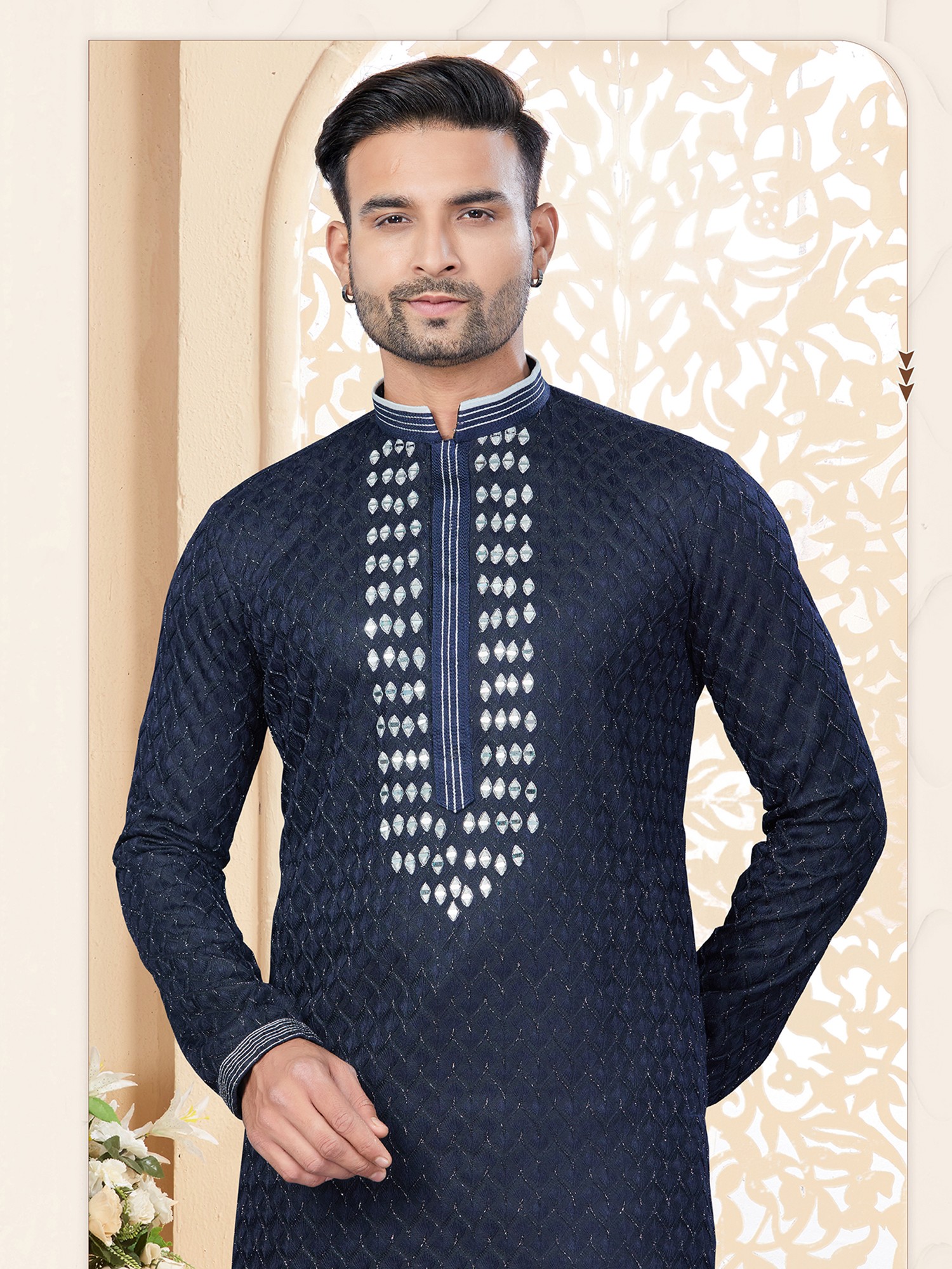 Crafted from art silk, this kurta pajama set offers a luxurious feel against the skin. The fabric is lightweight and breathable, making it comfortable to wear even in warmer climates. The art silk fabric drapes beautifully, enhancing the overall elegance of the ensemble. This kurta pajama set is a testament to timeless style and meticulous craftsmanship. It's an investment in your wardrobe that will continue to impress for years to come.