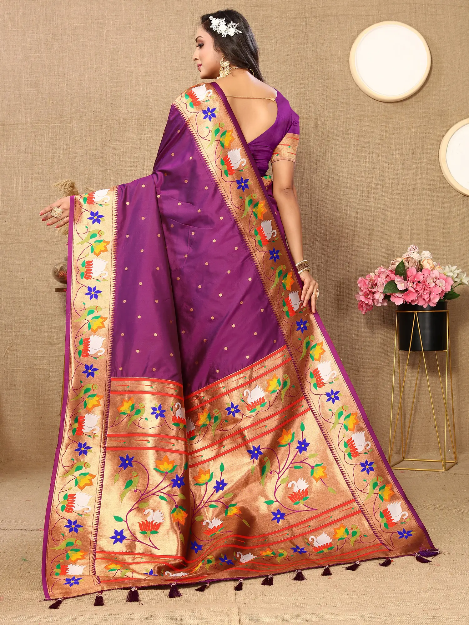 This Paithani silk saree is more than just an attire; it's an heirloom piece, perfect for gracing any festive occasion, wedding, or special celebration. The rich silk fabric ensures comfort and elegance, while the vibrant weaving makes a bold and memorable statement. The contrasting tassels on the pallu add a playful yet refined touch, enhancing the overall grandeur of the saree. Pair it with traditional gold jewelry and subtle makeup to complete a look that is both classic and contemporary. The accompanying blouse fabric allows for customization, ensuring a perfect fit and complementing the overall design of the saree. Embrace the opulence and heritage that this Paithani silk saree offers, and let it be the crowning jewel of your ethnic wardrobe.
