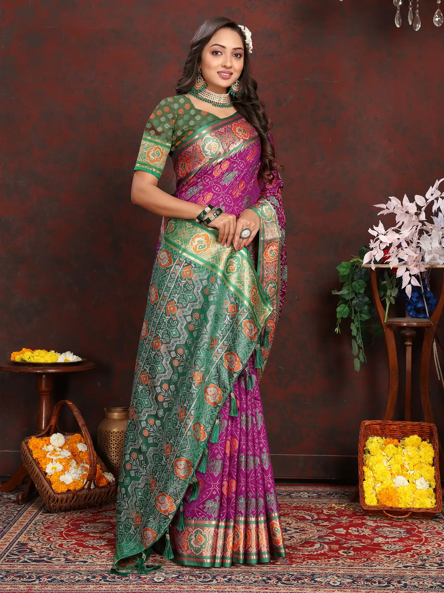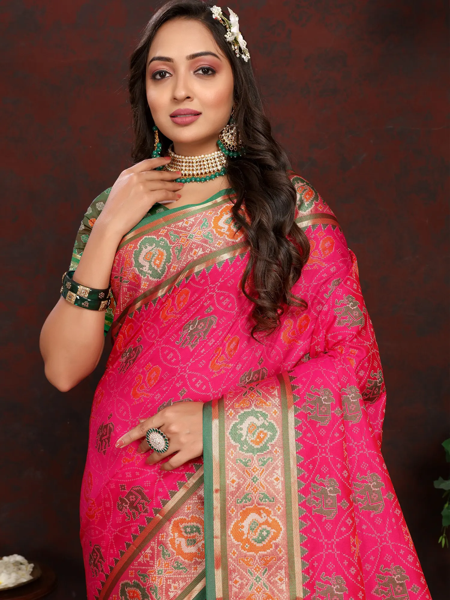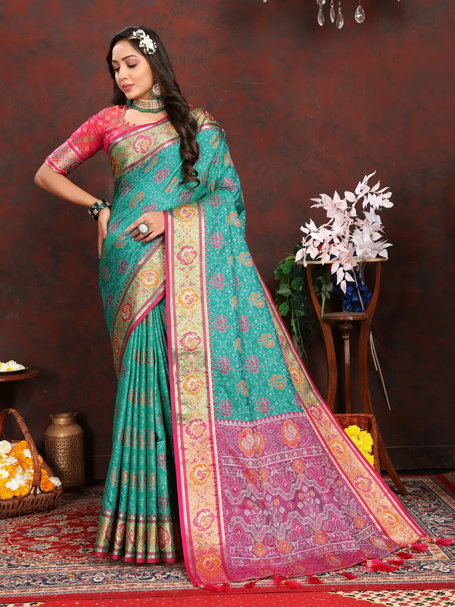 Elegant Patola Weaving Print Festive Wear Silk Saree With Contrast Tassels Pallu