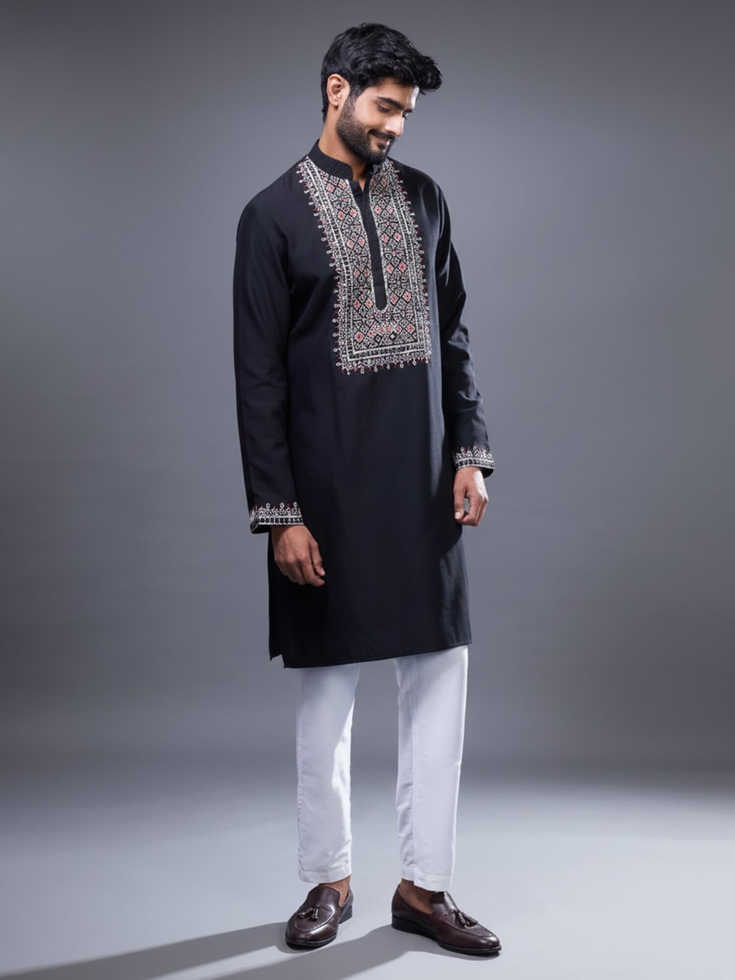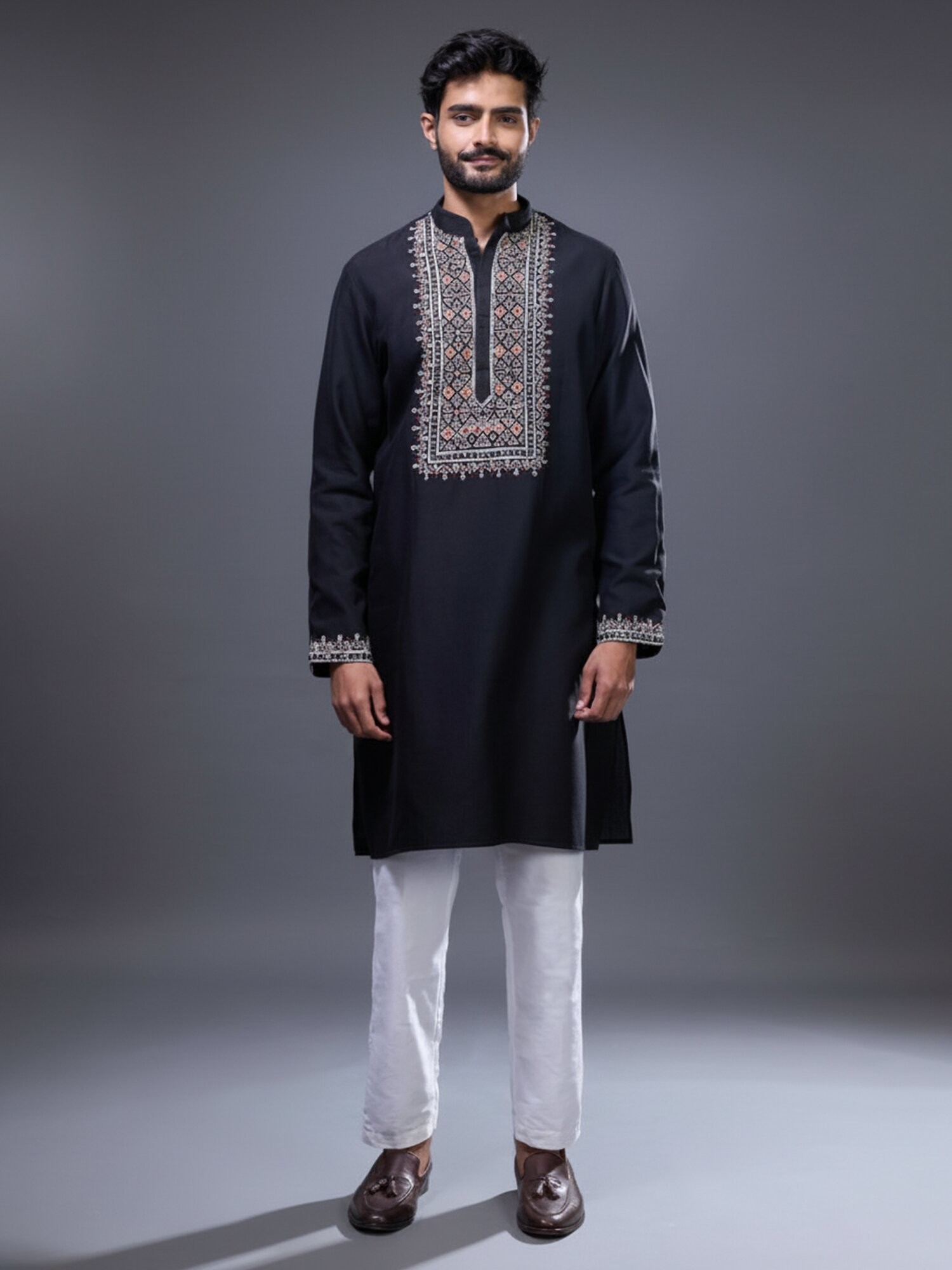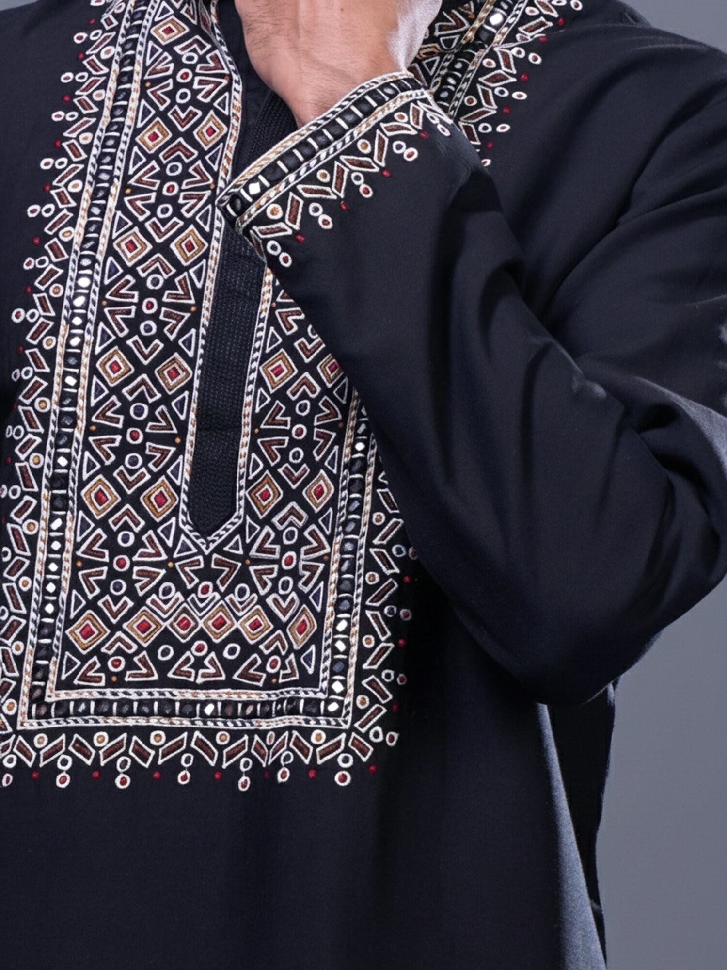 The rich, deep hue of the silk provides a distinguished canvas for the vibrant, geometric embroidery that captivates the eye. The relaxed yet tailored silhouette ensures supreme comfort without compromising on regal presentation. You'll feel the luxurious softness of the silk against your skin, a constant reminder of its superior quality.
