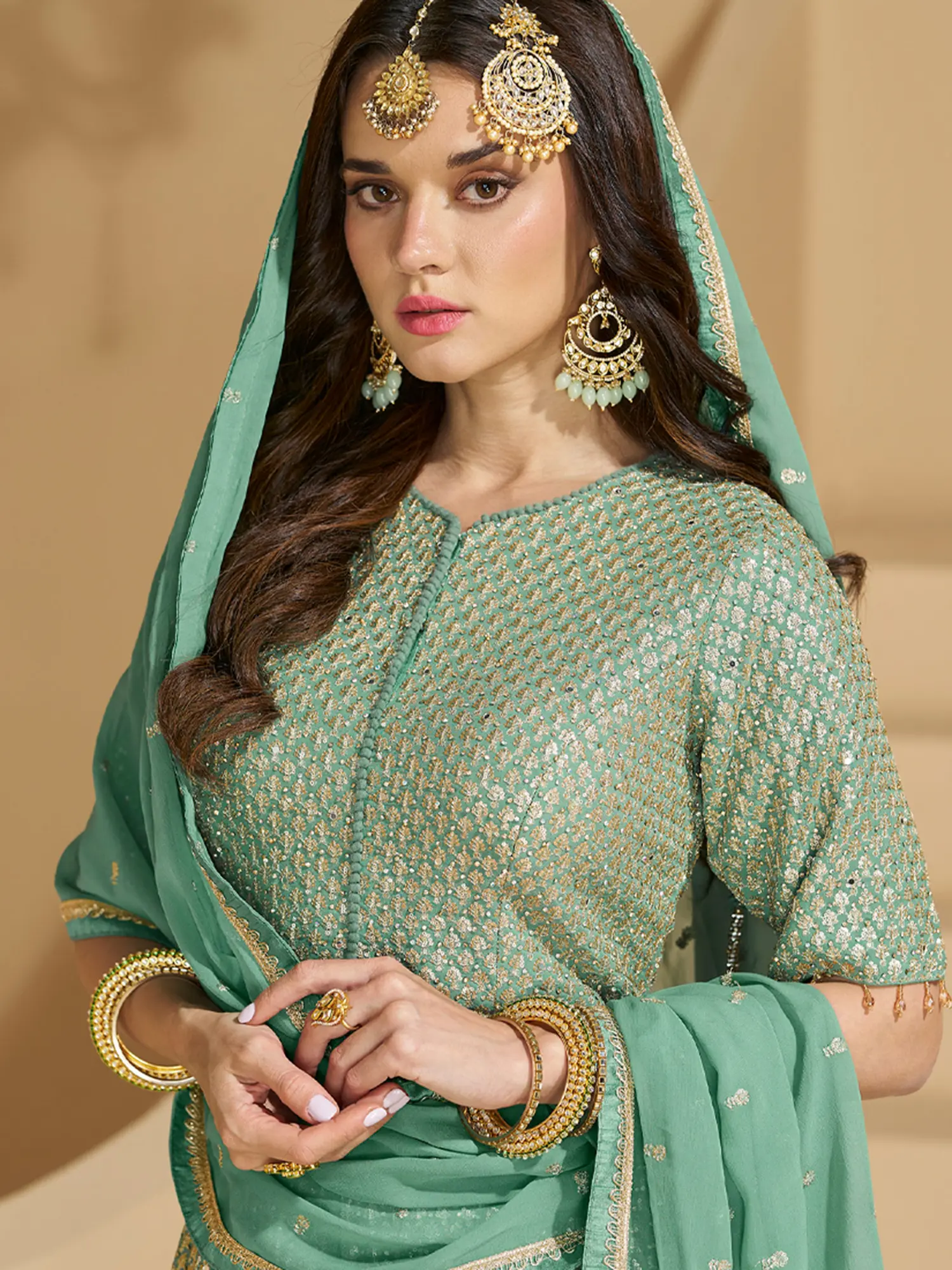 Light-Green Palazzo Salwar Suit Chinon Ethnic Wear Designer Outfit For Festival Party Wedding Ceremony