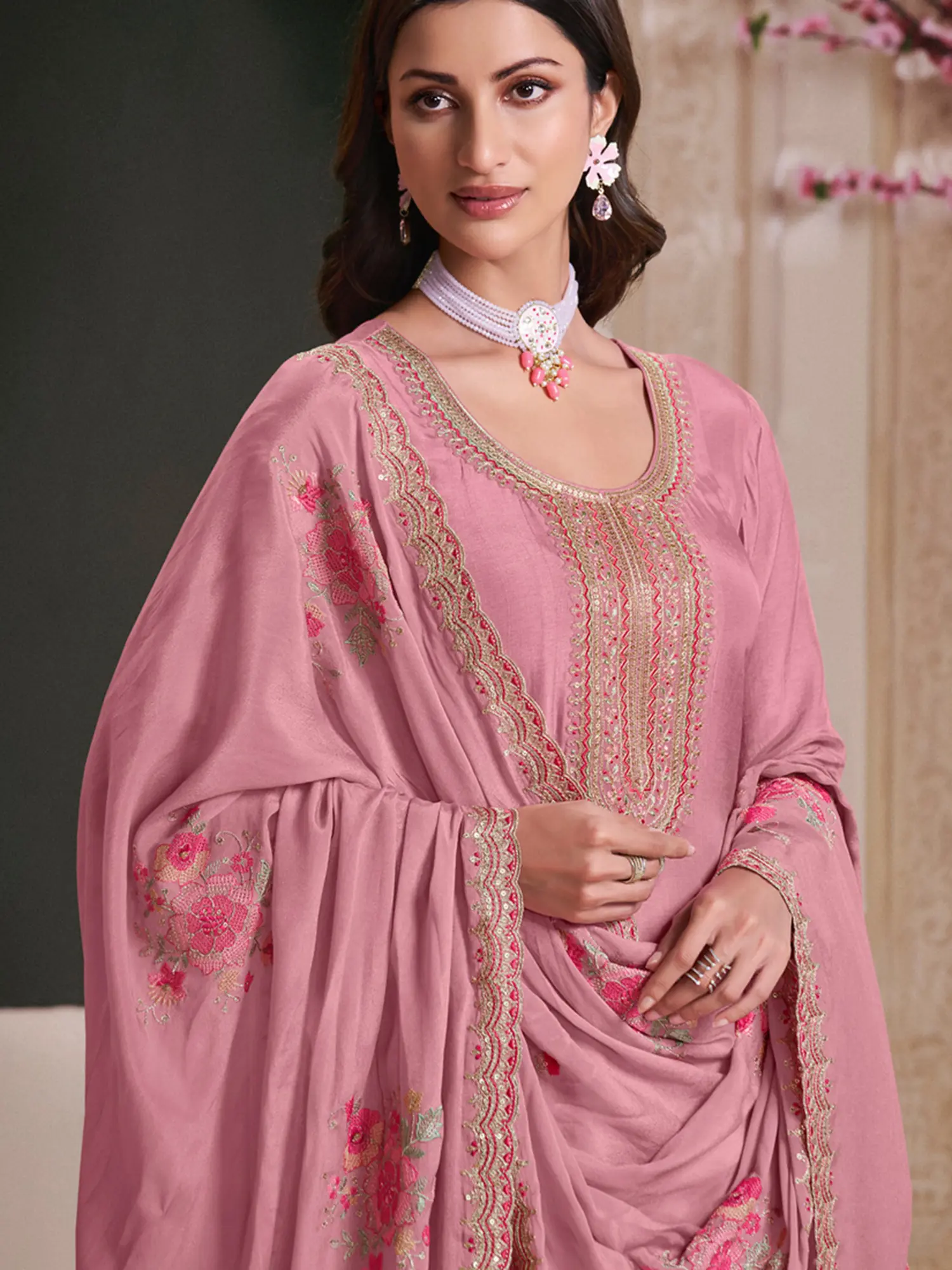 The beauty of this suit lies in its exquisite craftsmanship. Delicate threadwork and shimmering sequins are meticulously arranged to create patterns that catch the light and add a touch of sparkle. The neckline is adorned with detailed embroidery, adding a regal touch to the design. Similar embellishments accent the hem and sleeves, creating a cohesive and visually stunning effect. The matching dupatta is the perfect complement to the suit. Crafted from the same luxurious silk fabric, it features complementary embroidery and sequin work along the borders, allowing you to drape it in various styles and enhance the overall look.