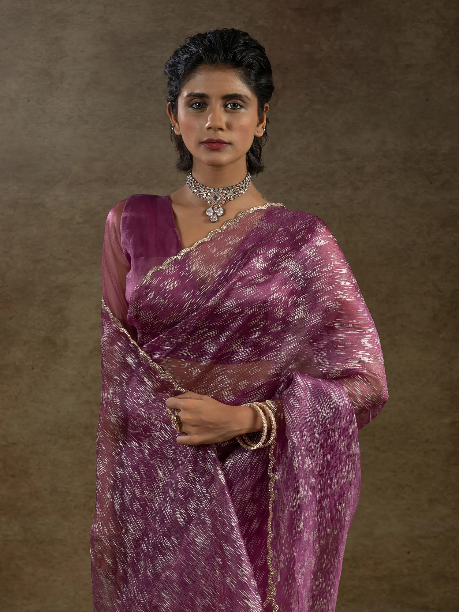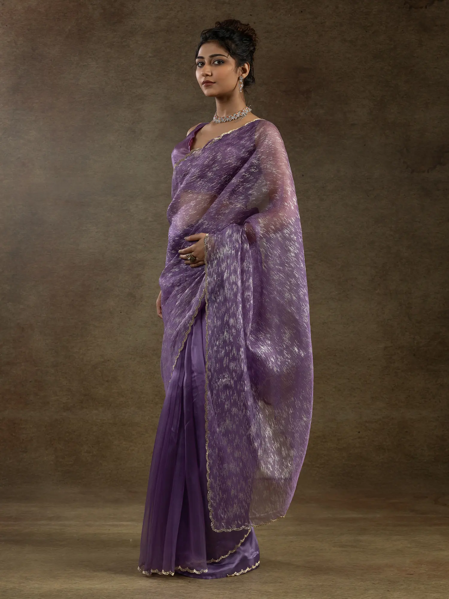 The luminous quality of the tissue silk is beautifully complemented by the foil print, which dances across the fabric in a captivating, abstract pattern. The border is finished with a delicate, scalloped edge, adding a touch of intricate detail that elevates the overall aesthetic. The accompanying blouse and underskirt are tailor-made to ensure a perfect fit, with flexible multiple hooks designed for effortless and graceful draping, allowing you to achieve a flawless silhouette.