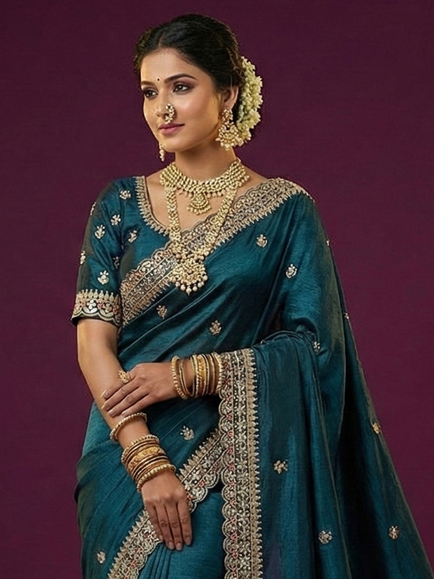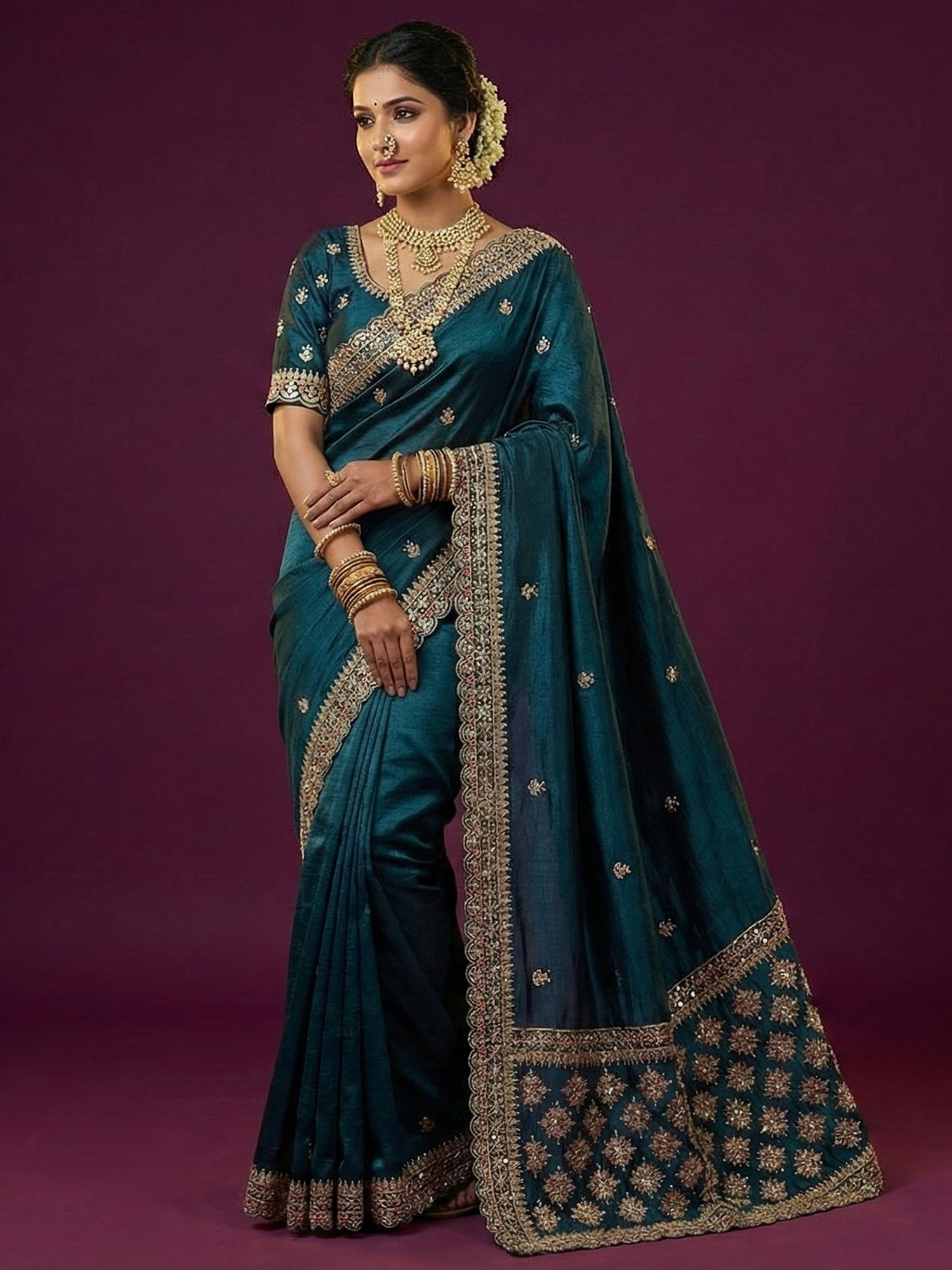 Elegant Traditional Saree in Zari Tissue Silk with Jaipuri Work and Stone Embellishment for Party Wear and Festive Occasions