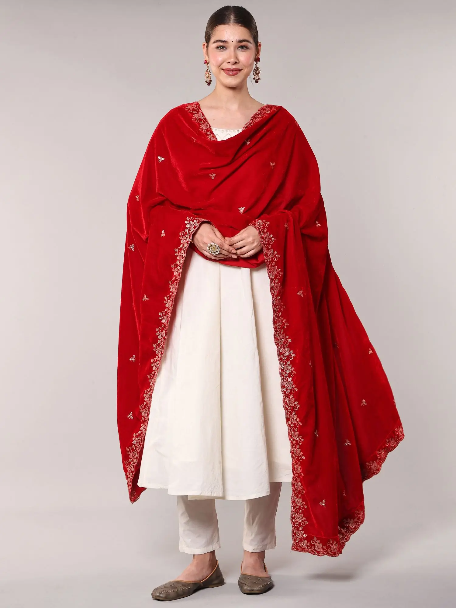 Embroidered Velvet Dupatta with Golden Bootis and Scalloped Edge