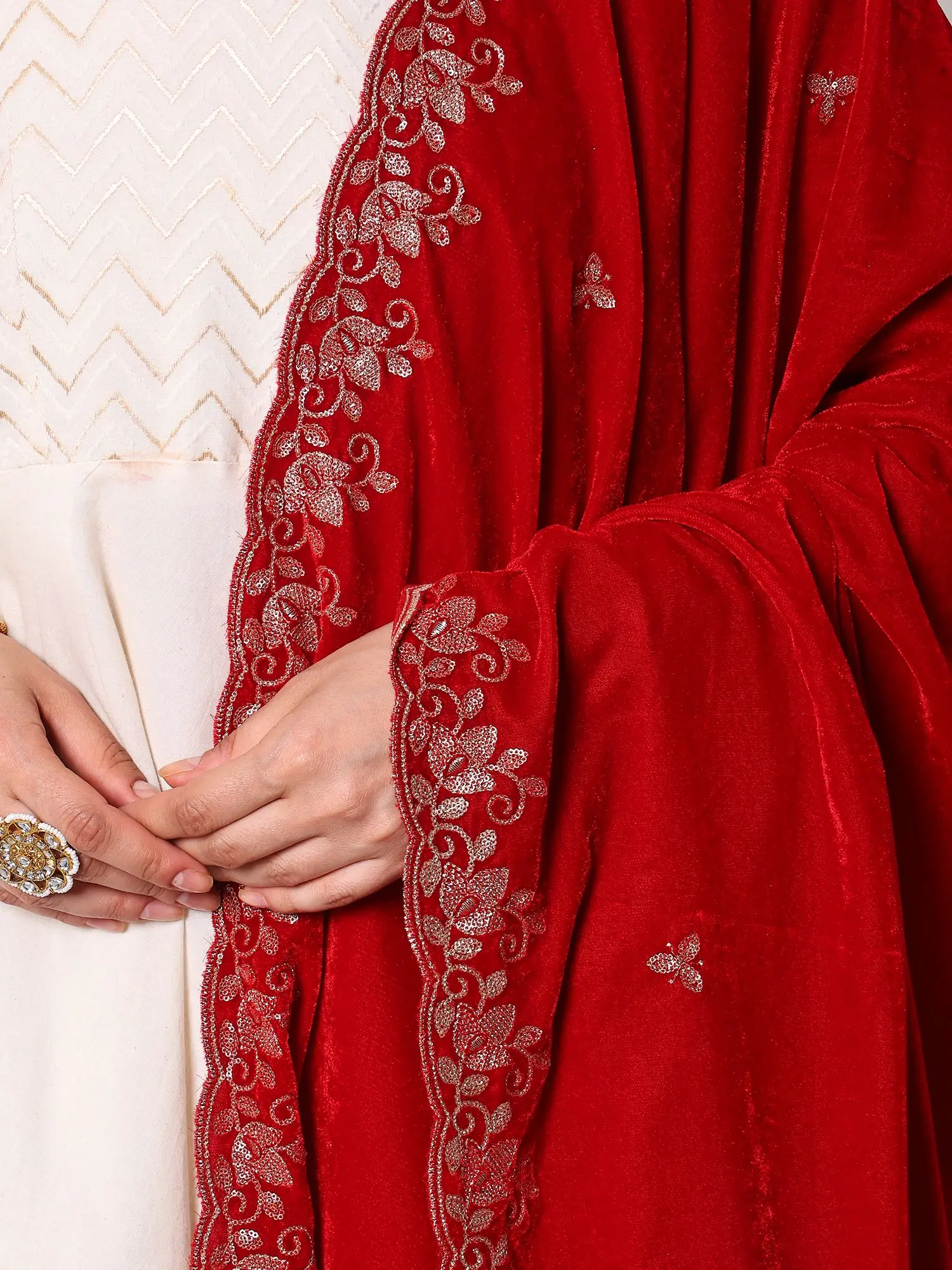 Maroon-Banner Velvet Dupatta with Zari Embroidered Floral Leaves Vine and Scalloped Border