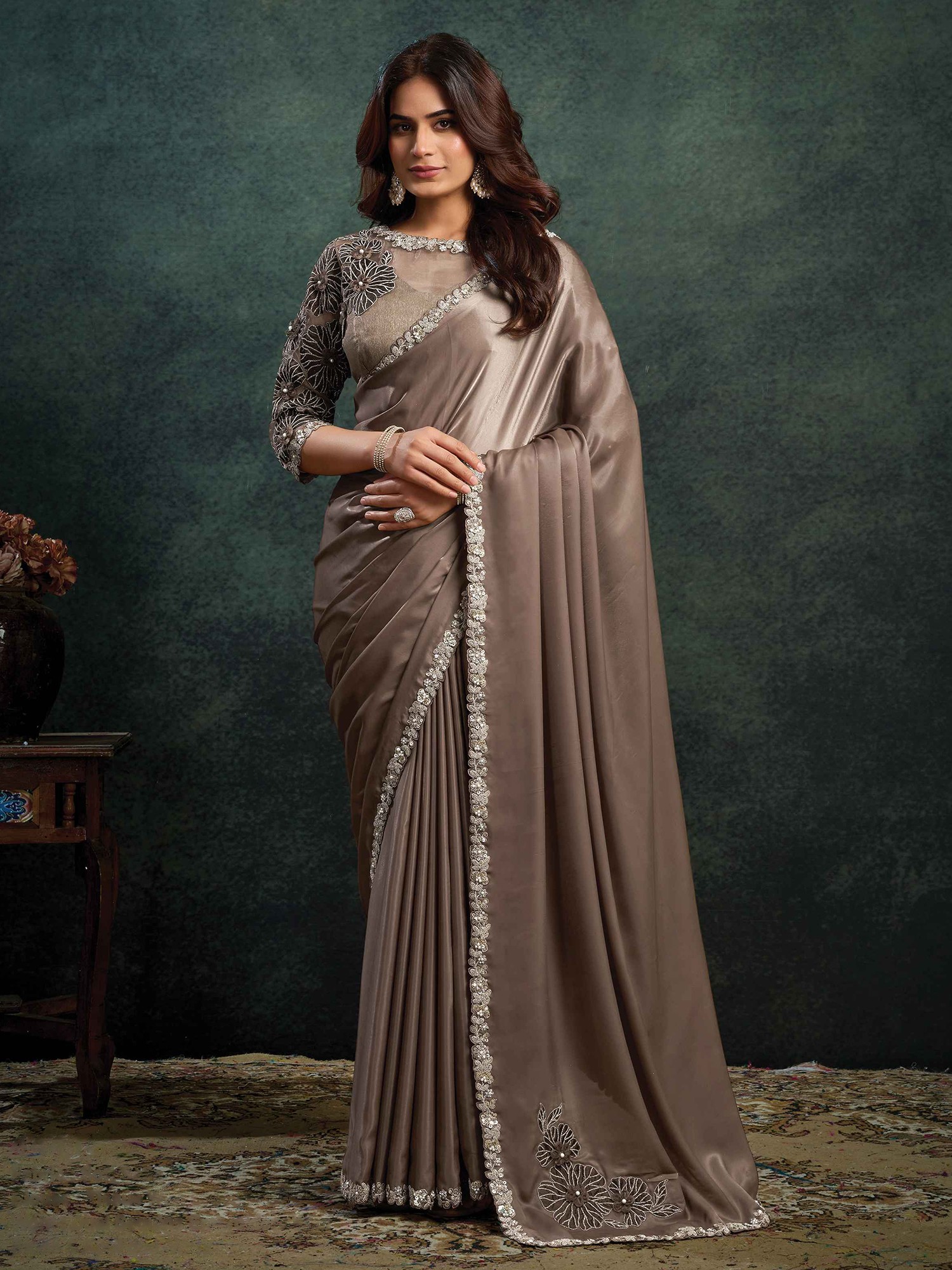 Elegant Wedding Soft Satin Saree With Dual Sequins Embroidery Stone And Applique Work Premium Designer Saree For Women