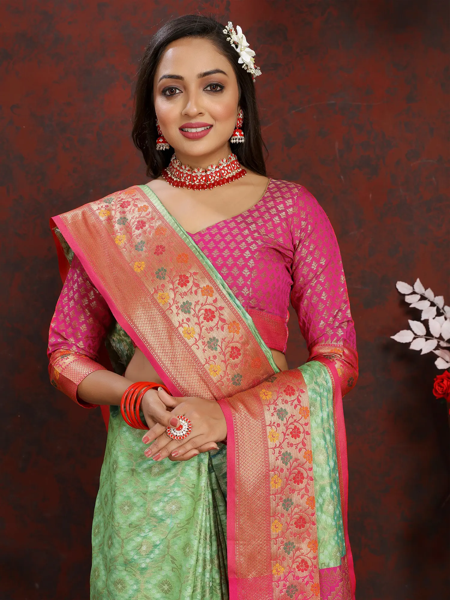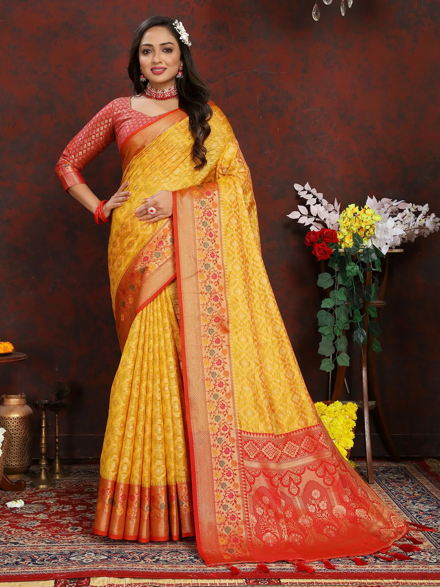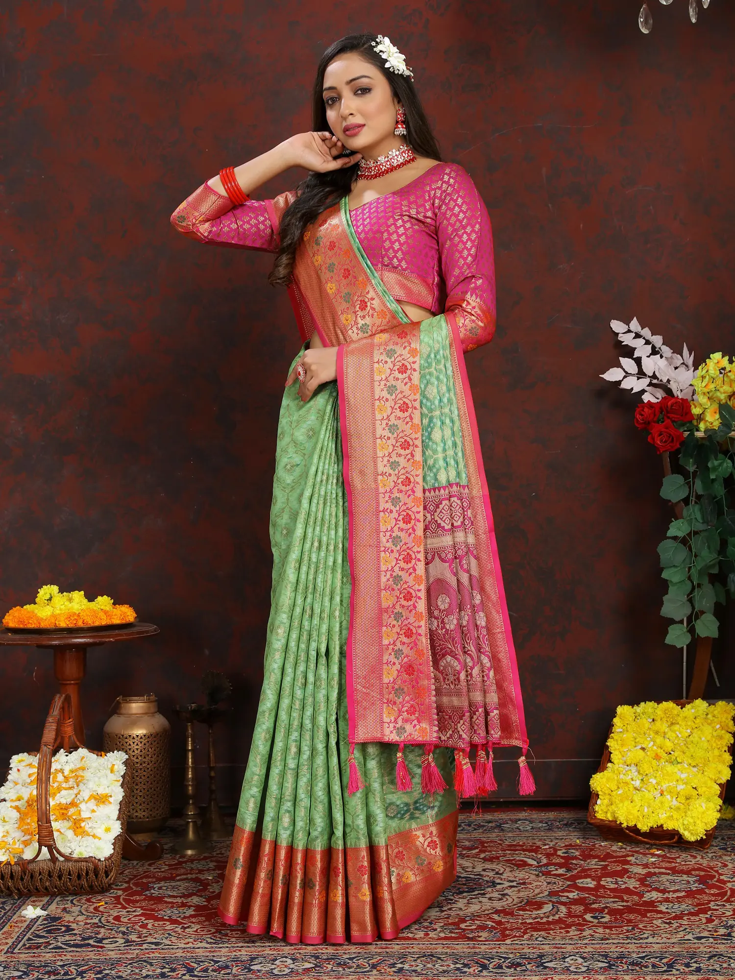 Traditional Banarasi Silk Wide Border Attractive Festive Wear Saree With Contrast Tassels Pallu
