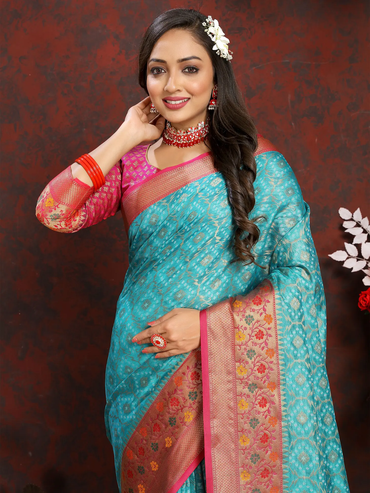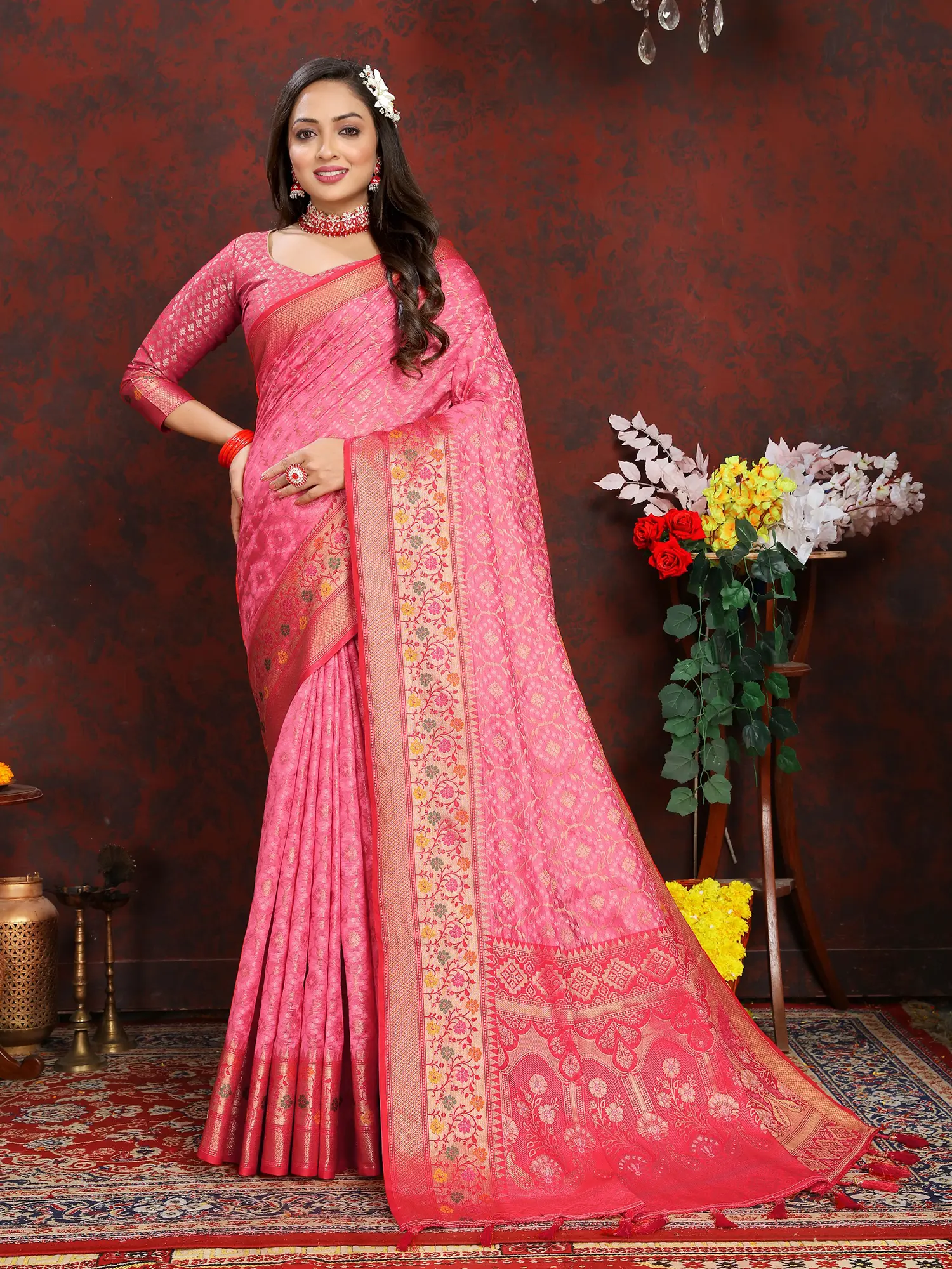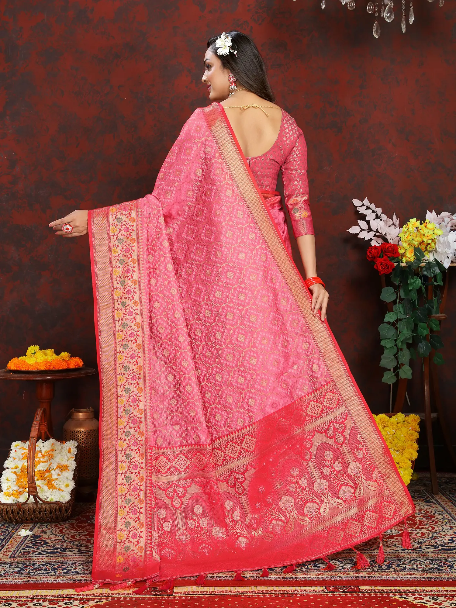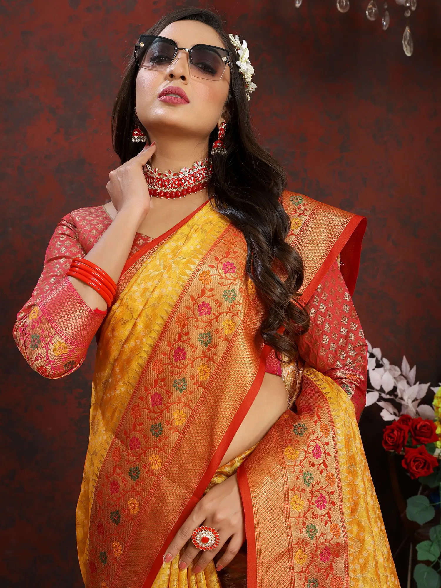 Traditional Banarasi Silk Wide Border Attractive Festive Wear Saree With Contrast Tassels Pallu