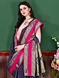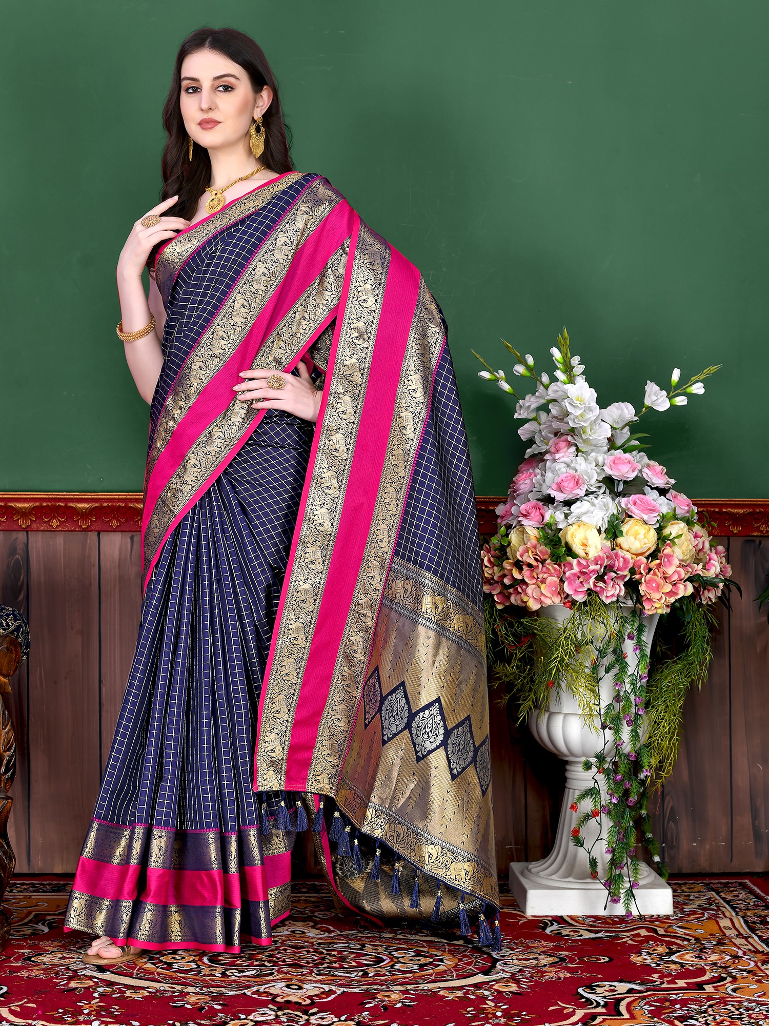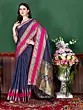 Bachelor-Blue Pure Silk Kanjivaram Handloom Saree with Zari woven Floral Bootis and Extra Wide Chevron Border from Bangalore