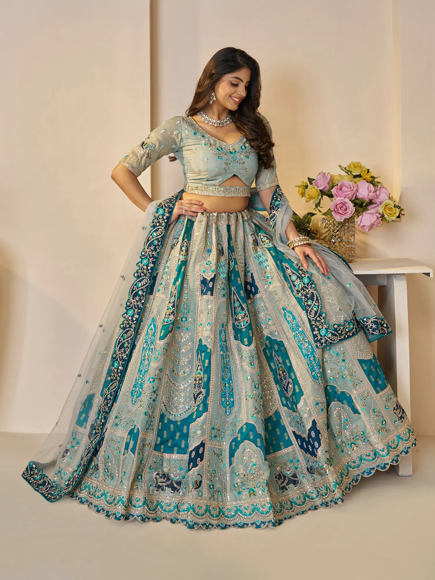 Complemented by a fitted choli that accentuates the waist.