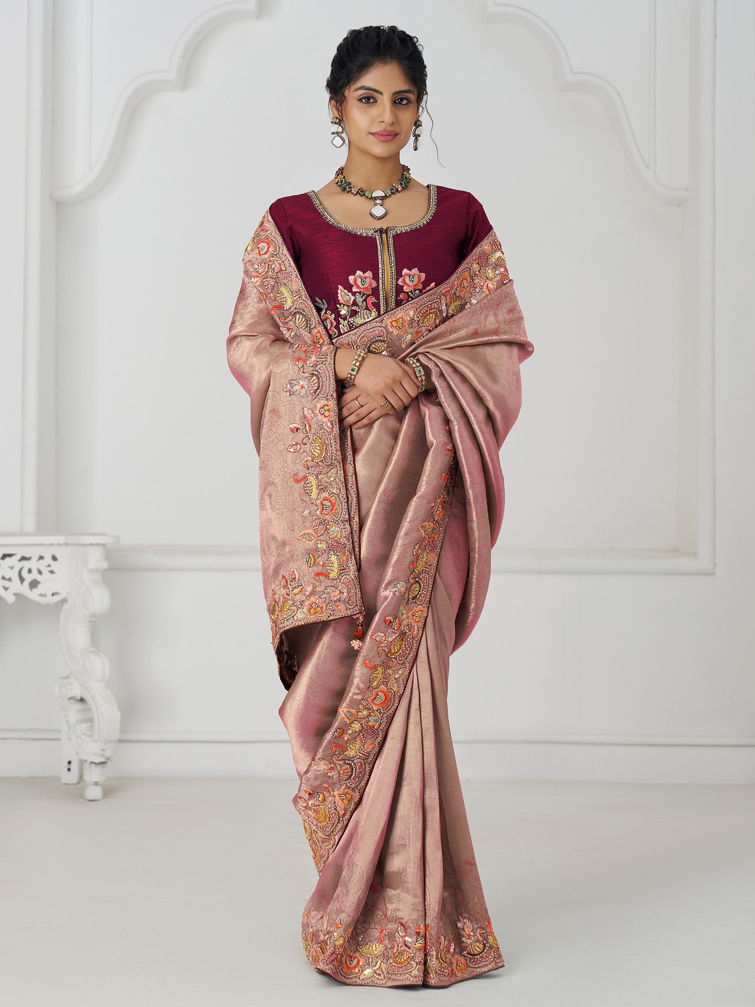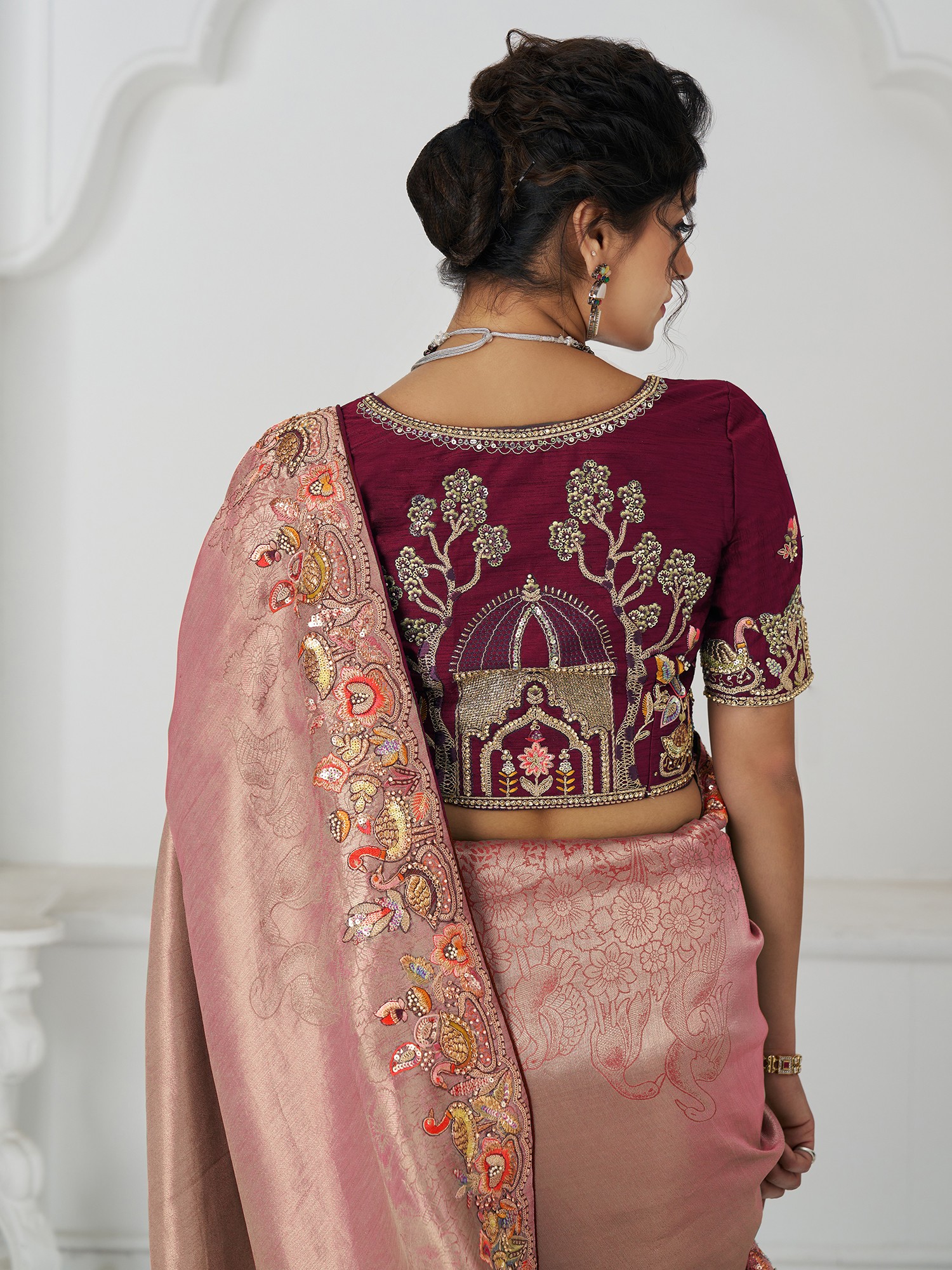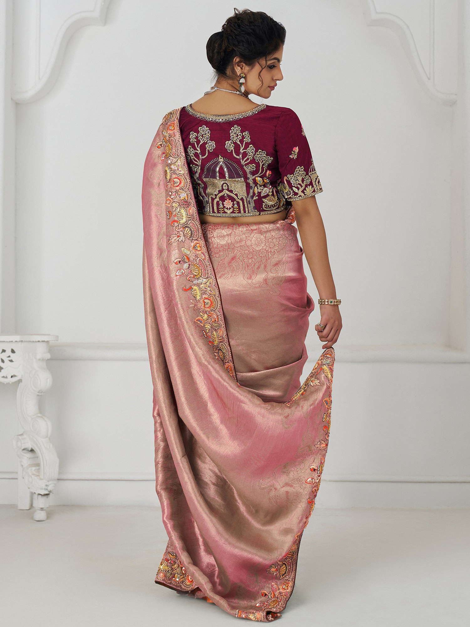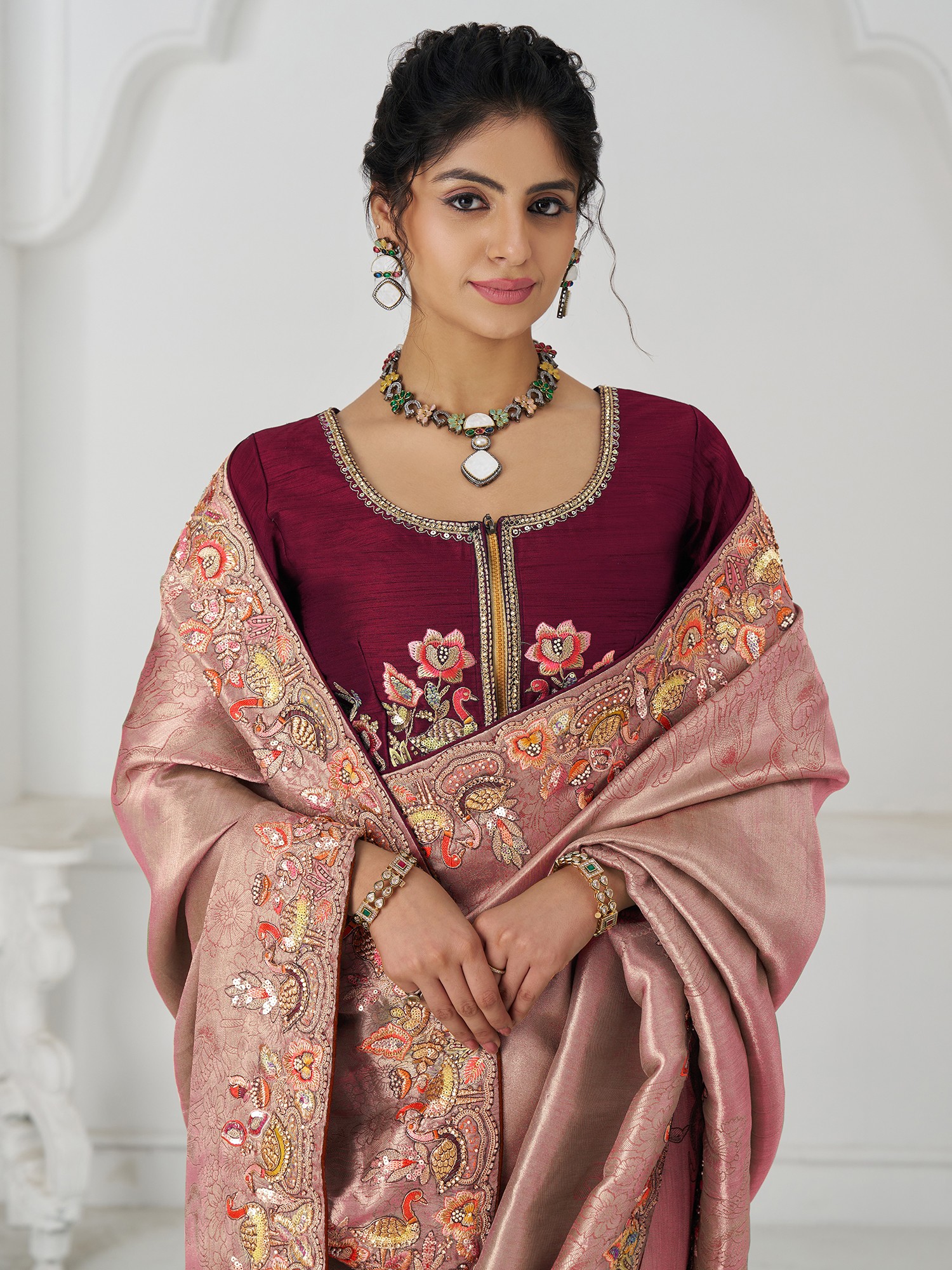 Summer-Melon Flared-Palazzo Salwar Kameez Suit with Zari-Woven Florals and Motifs