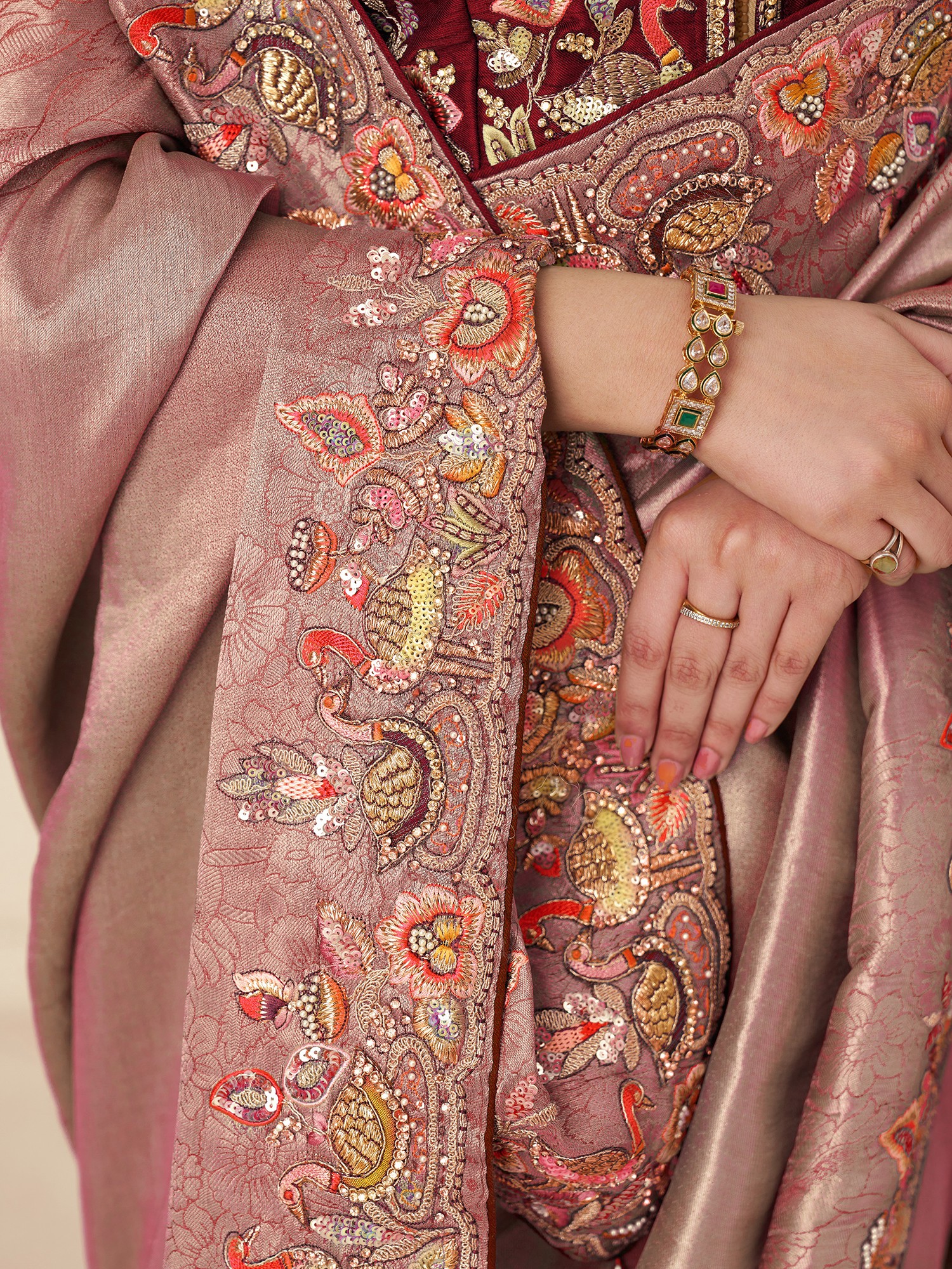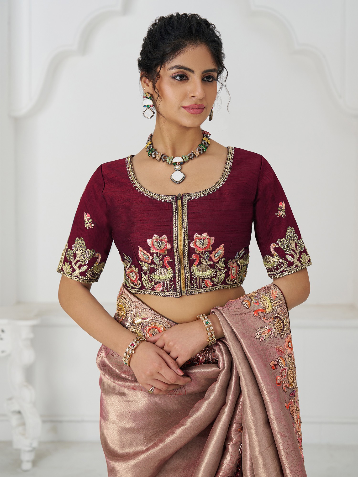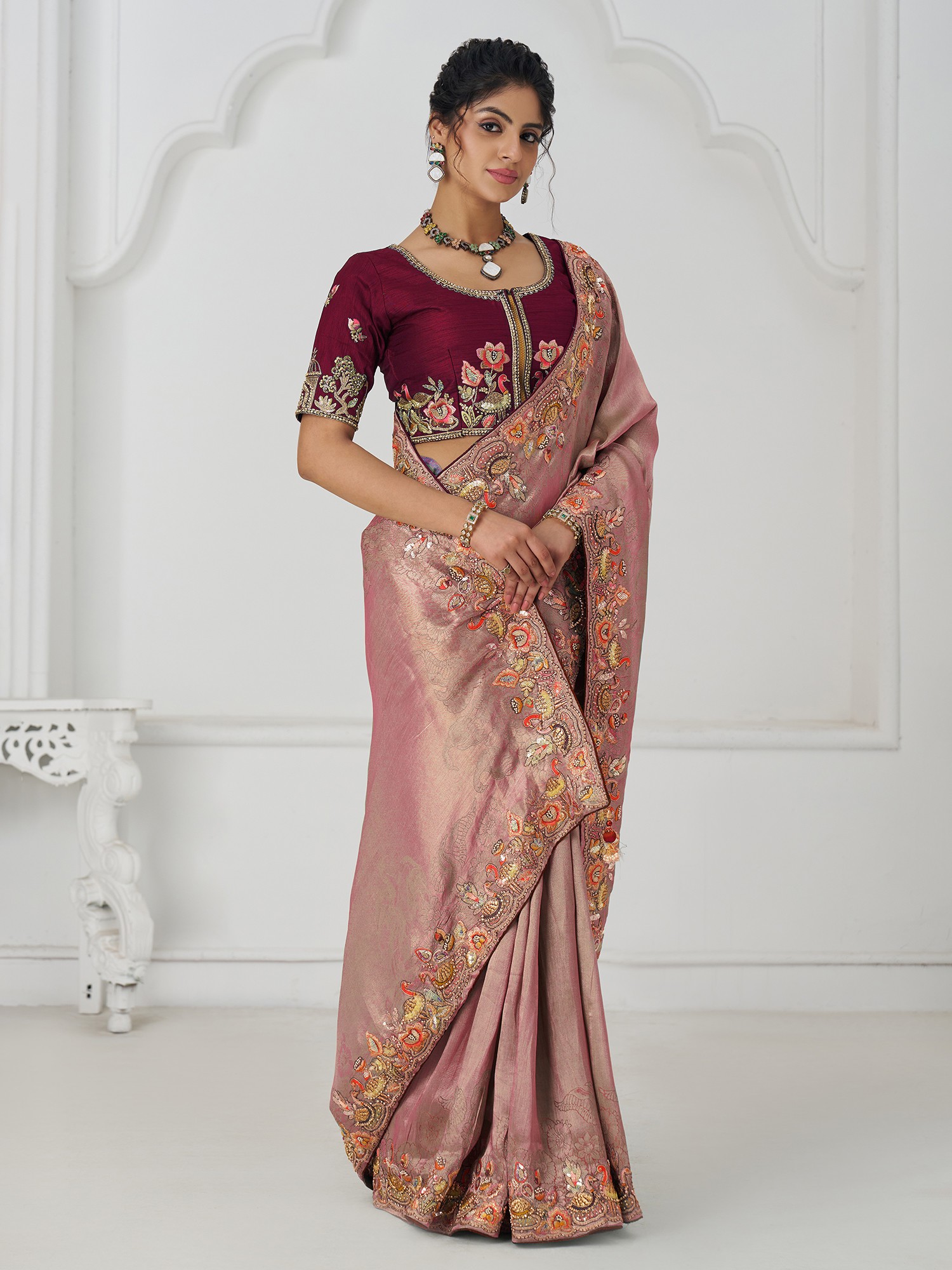 Summer-Melon Flared-Palazzo Salwar Kameez Suit with Zari-Woven Florals and Motifs