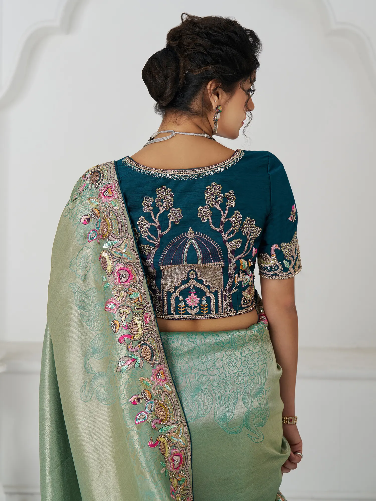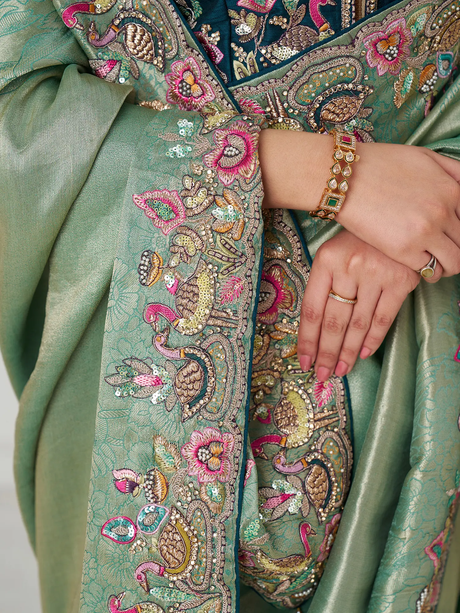 Embellished Sequins And Embroidery Work Contrast Border Pure Dola Viscose Silk Saree