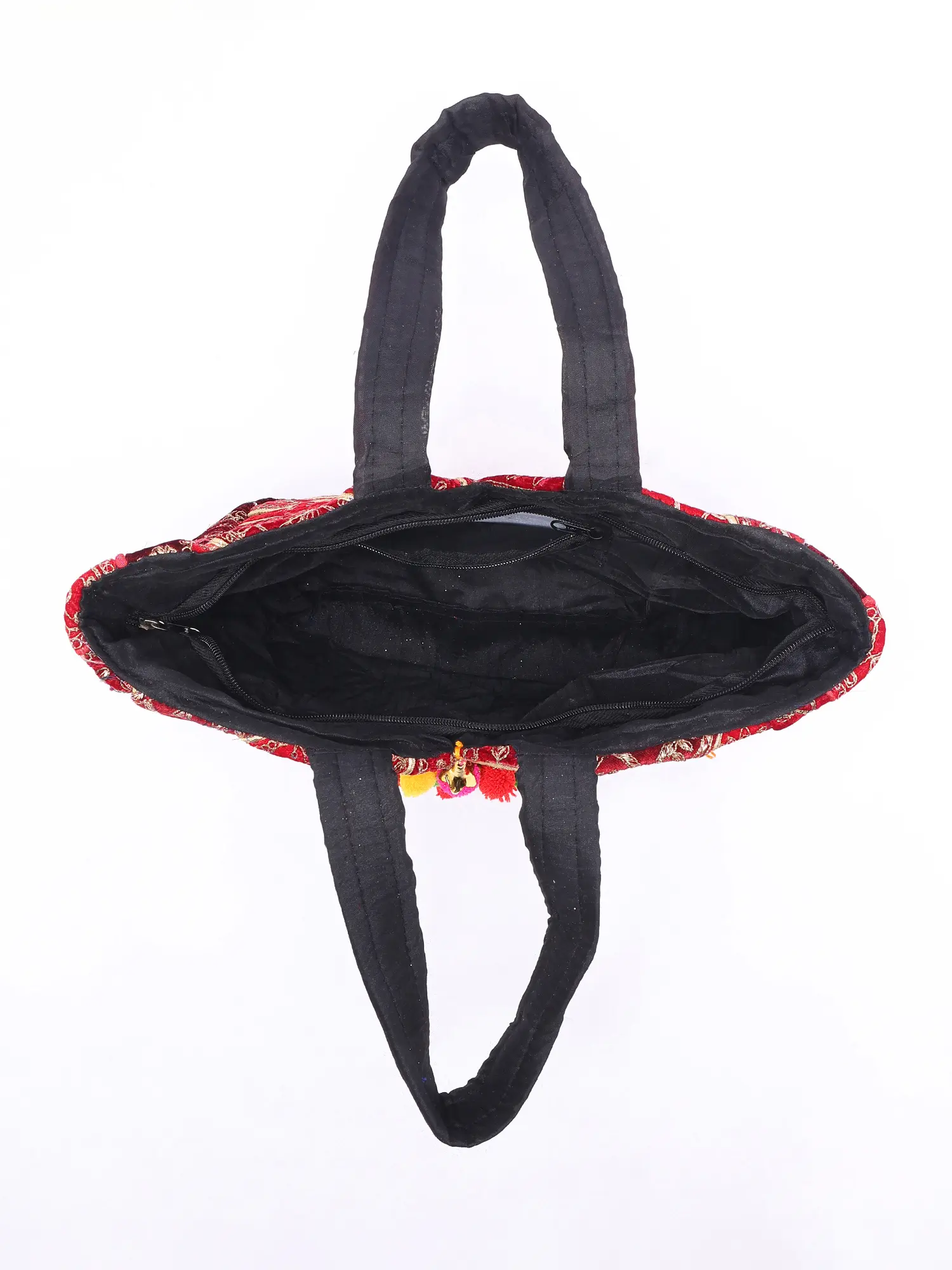 Durable black handles with embroidered detailing for comfortable carrying.