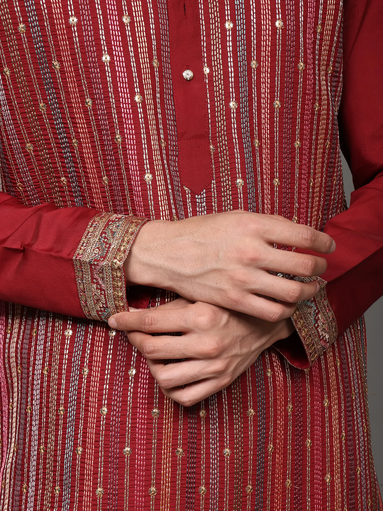 Step into the spotlight with this meticulously crafted kurta pajama set, designed to make a lasting impression. The rich, deep red hue of the kurta instantly commands attention, exuding a sense of regal charm and sophistication. Perfect for weddings, festive occasions, or any event where you want to radiate confidence and style. The straight-cut silhouette offers a flattering fit, ensuring you look your best from every angle.
