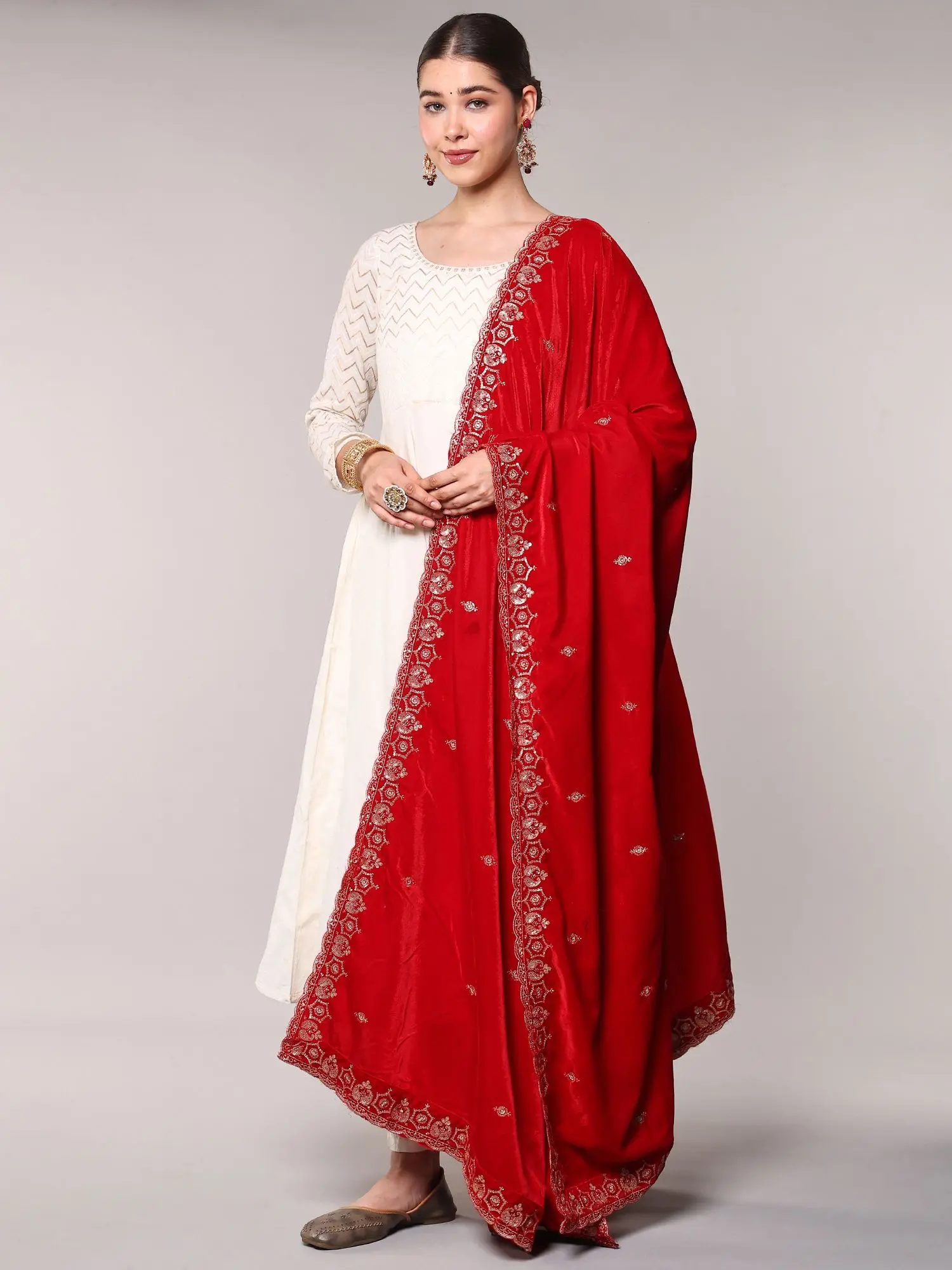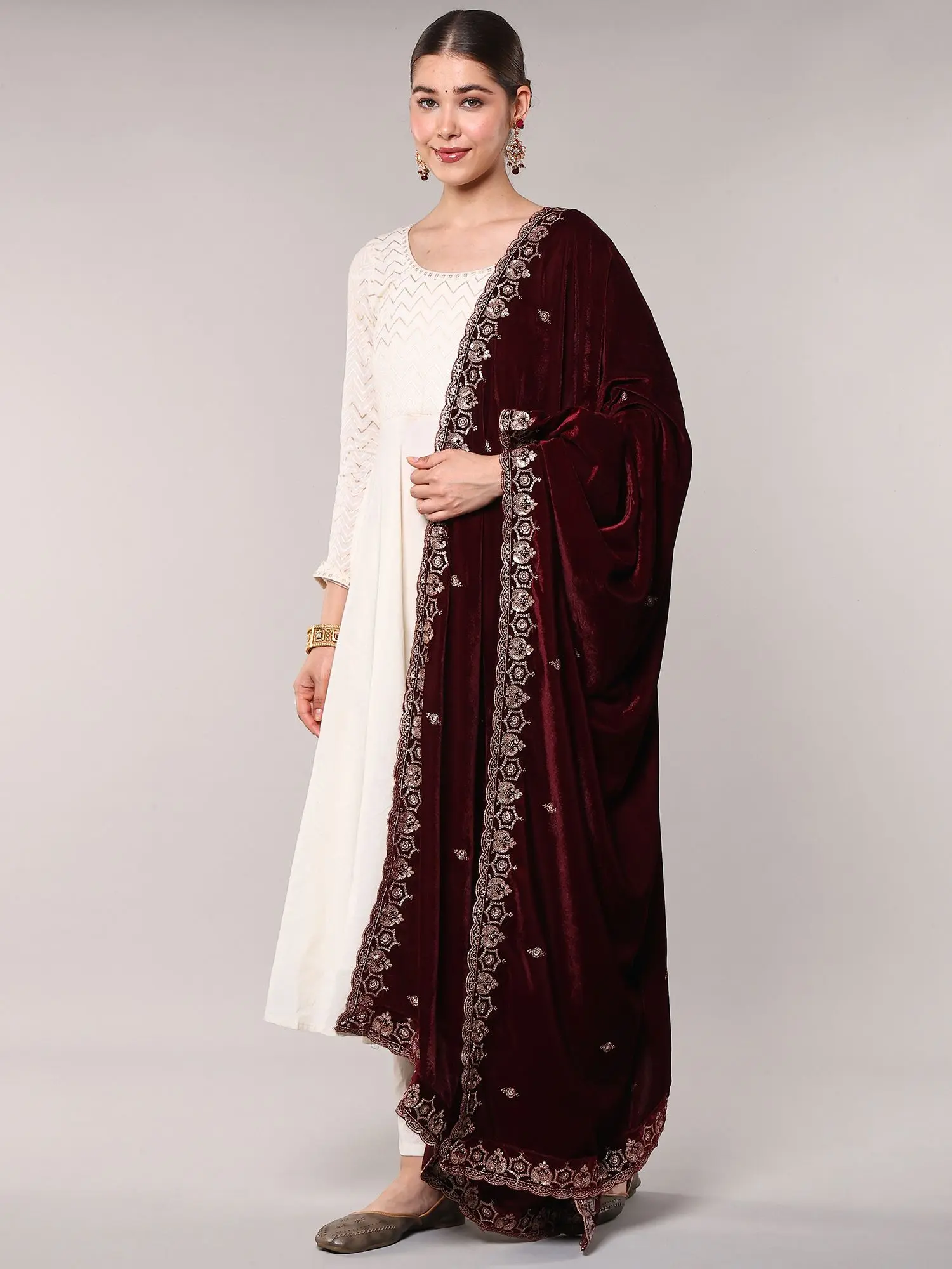 Maroon-Banner Velvet Dupatta with Zari Embroidered Floral Leaves Vine and Scalloped Border