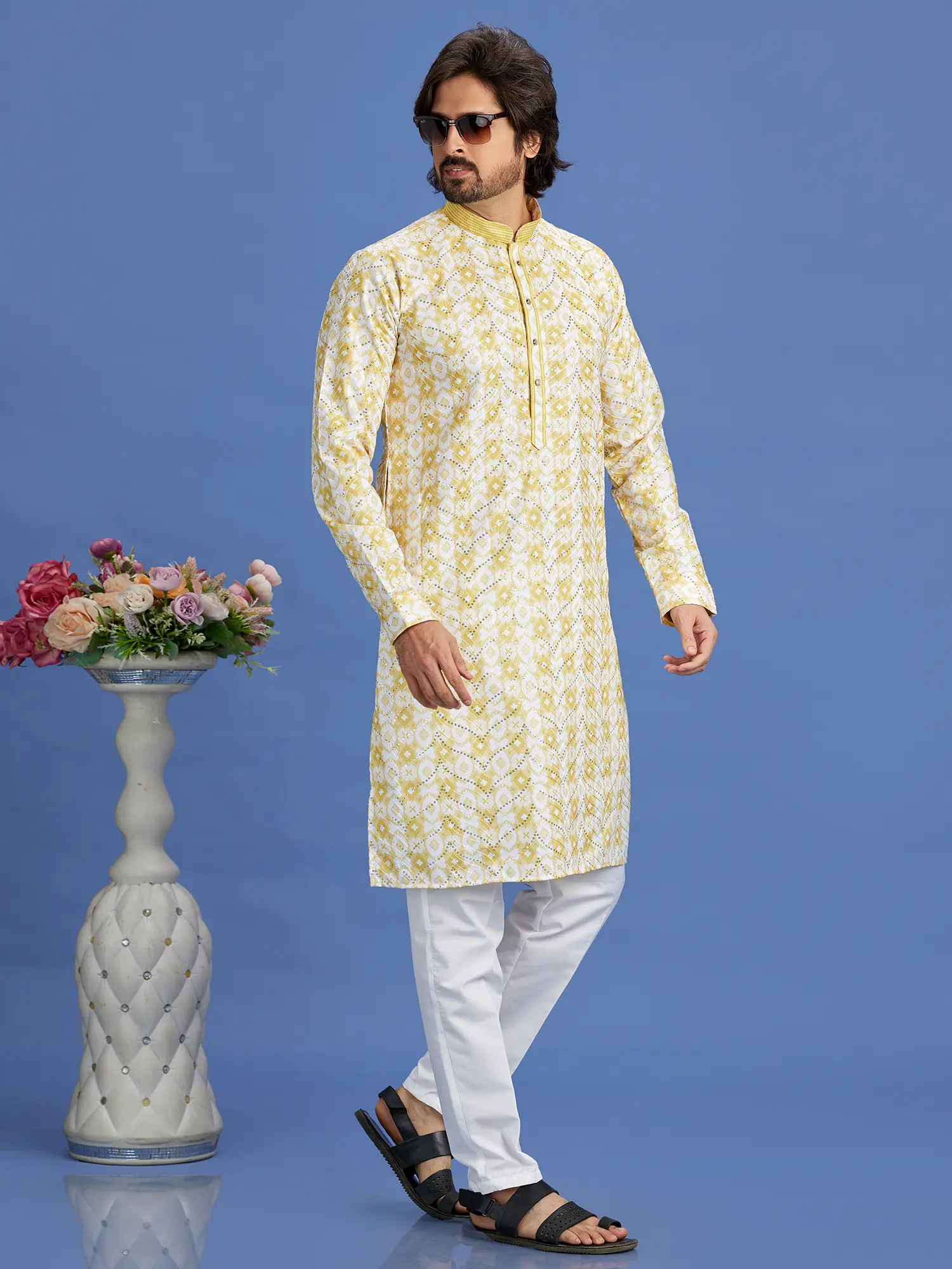 This kurta pajama set is incredibly versatile. The soothing color palette and elegant print make it suitable for a wide range of events. Pair it with the crisp white pajama bottoms for a complete and cohesive look that exudes understated elegance. The pajama bottoms are designed for a relaxed fit, ensuring ease of movement and all-day comfort. Whether you're attending a wedding, a religious ceremony, or simply want to add a touch of ethnic flair to your everyday wardrobe, this set is a perfect choice. It can also be styled in various ways, allowing you to adapt it to your personal style and the specific occasion.