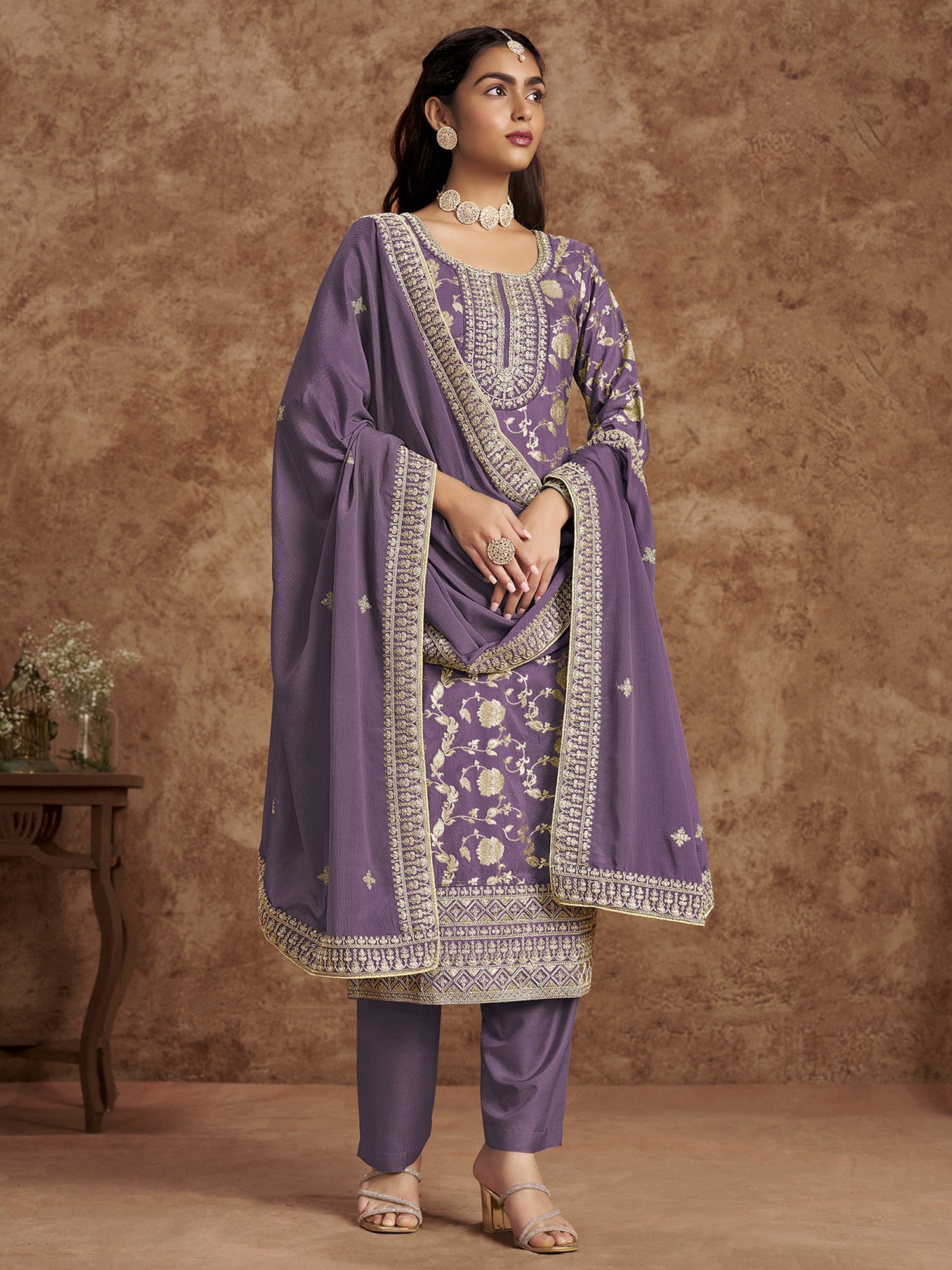 Straight Salwar Suit Set and Intricate Chain Stitch Embroidery from Kashmir