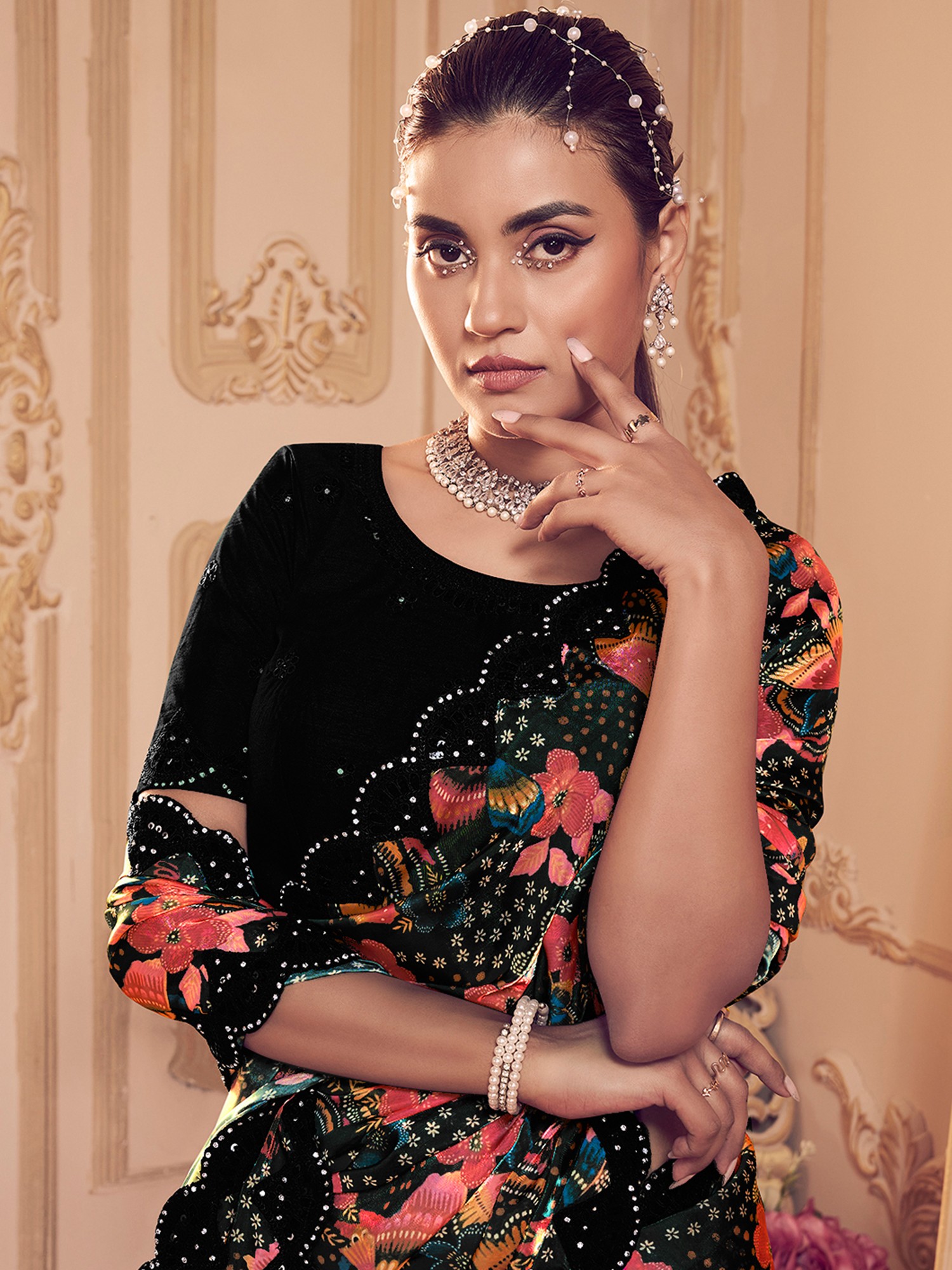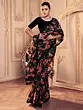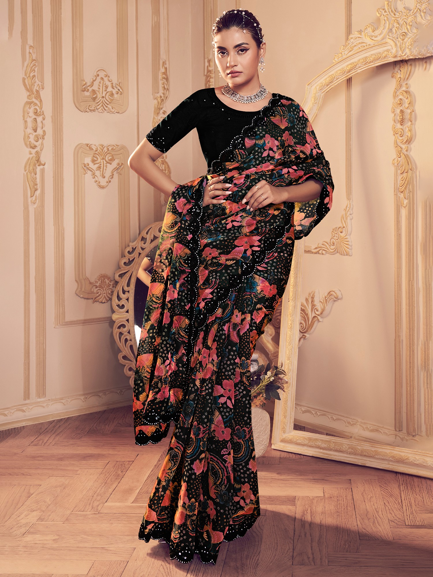 Embroidery And Sequins Work Border Floral Print Designer Jimmy Choo Saree With Blouse