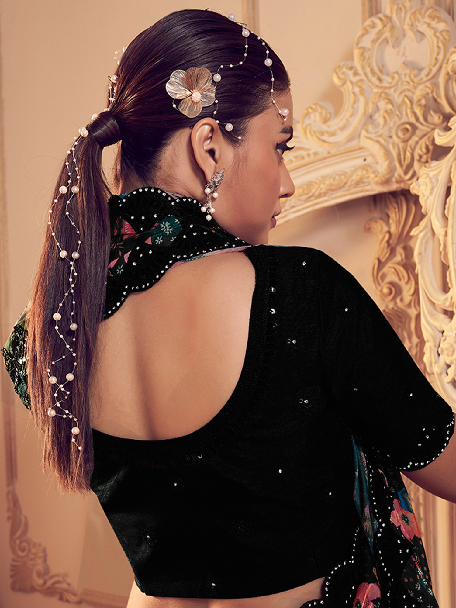 Indulge in the timeless elegance of this saree, a captivating blend of traditional artistry and contemporary style. This masterpiece is crafted with meticulous attention to detail, featuring delicate embroidery and shimmering sequins work that elevate the floral print. The elaborate border adds a touch of regality, making it a perfect choice for special occasions and celebrations.