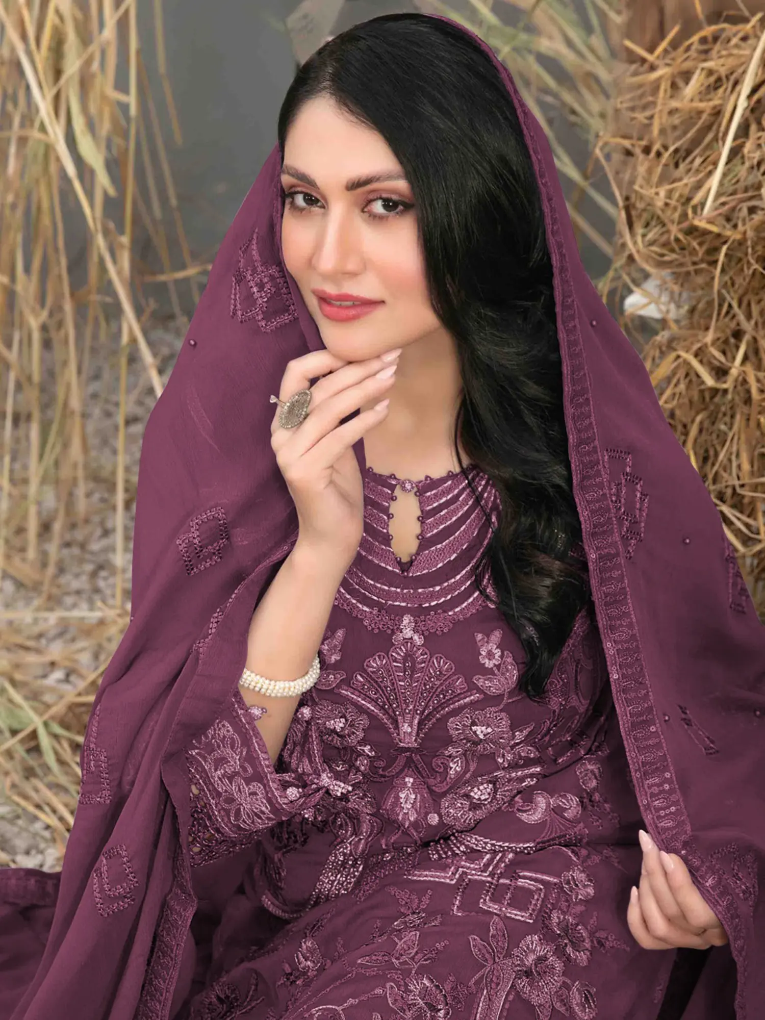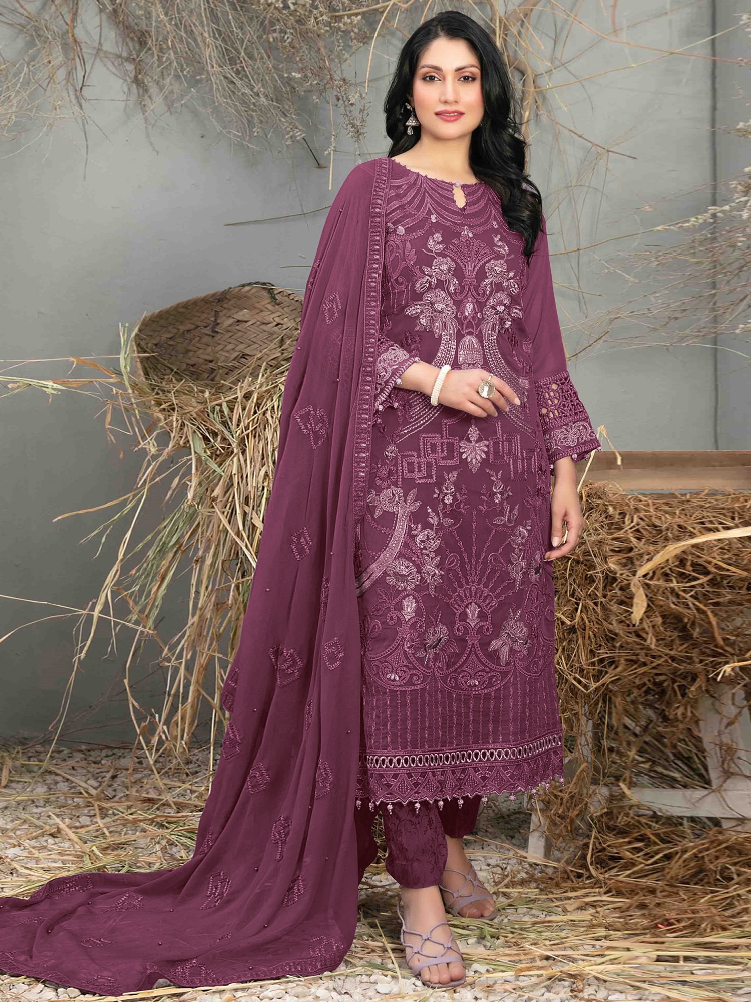 The entire outfit is fashioned from premium georgette, a fabric known for its fluidity, lightweight feel, and elegant drape. The choice of georgette lends the salwar kameez a graceful movement, ensuring you feel comfortable and confident, making it perfect for any special occasion. The matching bottom perfectly complements the kurta, maintaining the overall aesthetic of refined elegance. The dupatta, also made of georgette, completes the look.