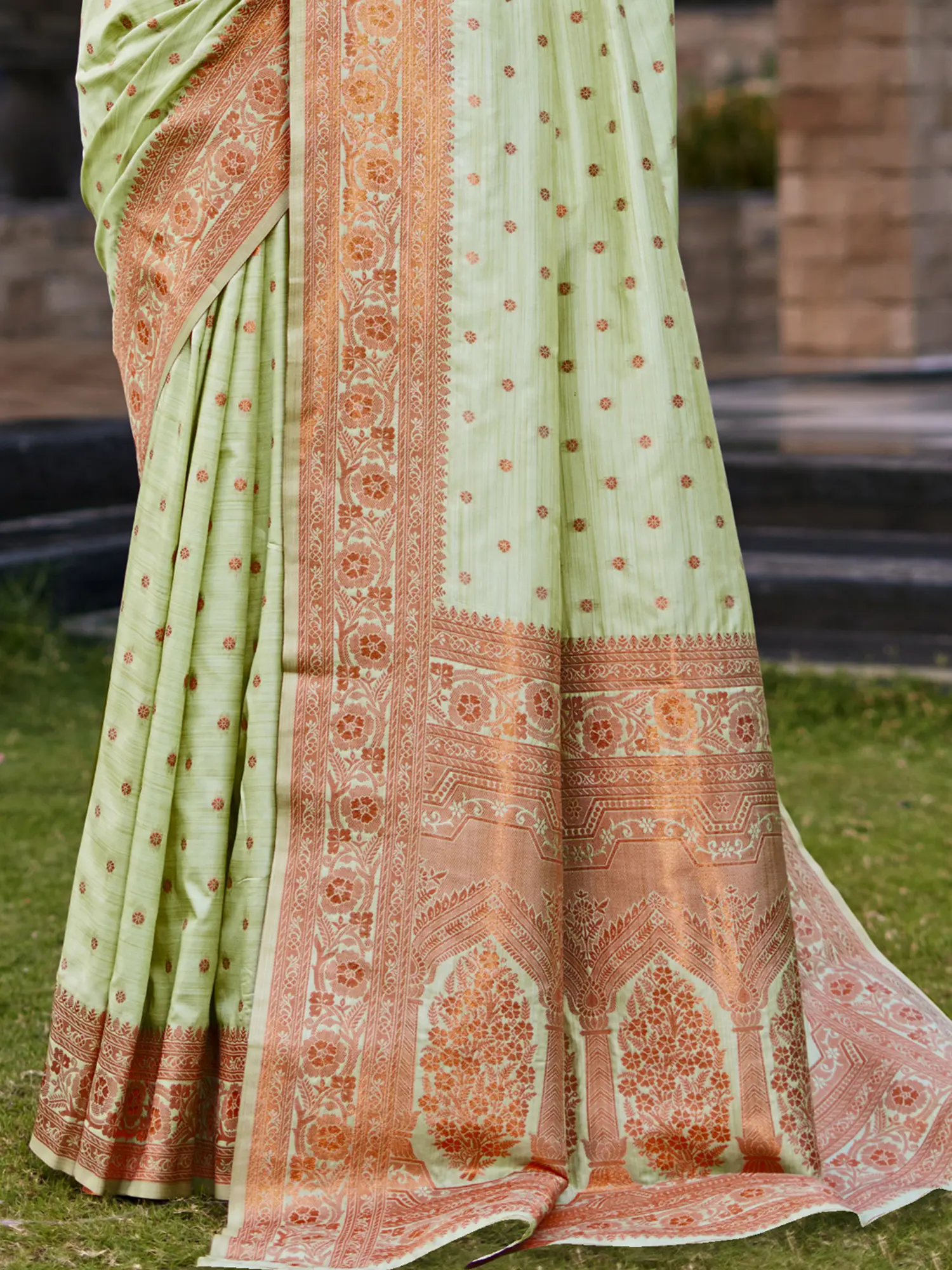 The saree showcases exquisite weaving work, a testament to the skill and artistry of the weavers. The intricate patterns, inspired by ethnic motifs, add depth and character to the overall design. The border, adorned with meticulous detail, frames the saree with a touch of opulence. The meticulous weaving showcases a dedication to detail, making this saree a true work of art. The design is both classic and contemporary, ensuring that you will look effortlessly stylish.