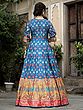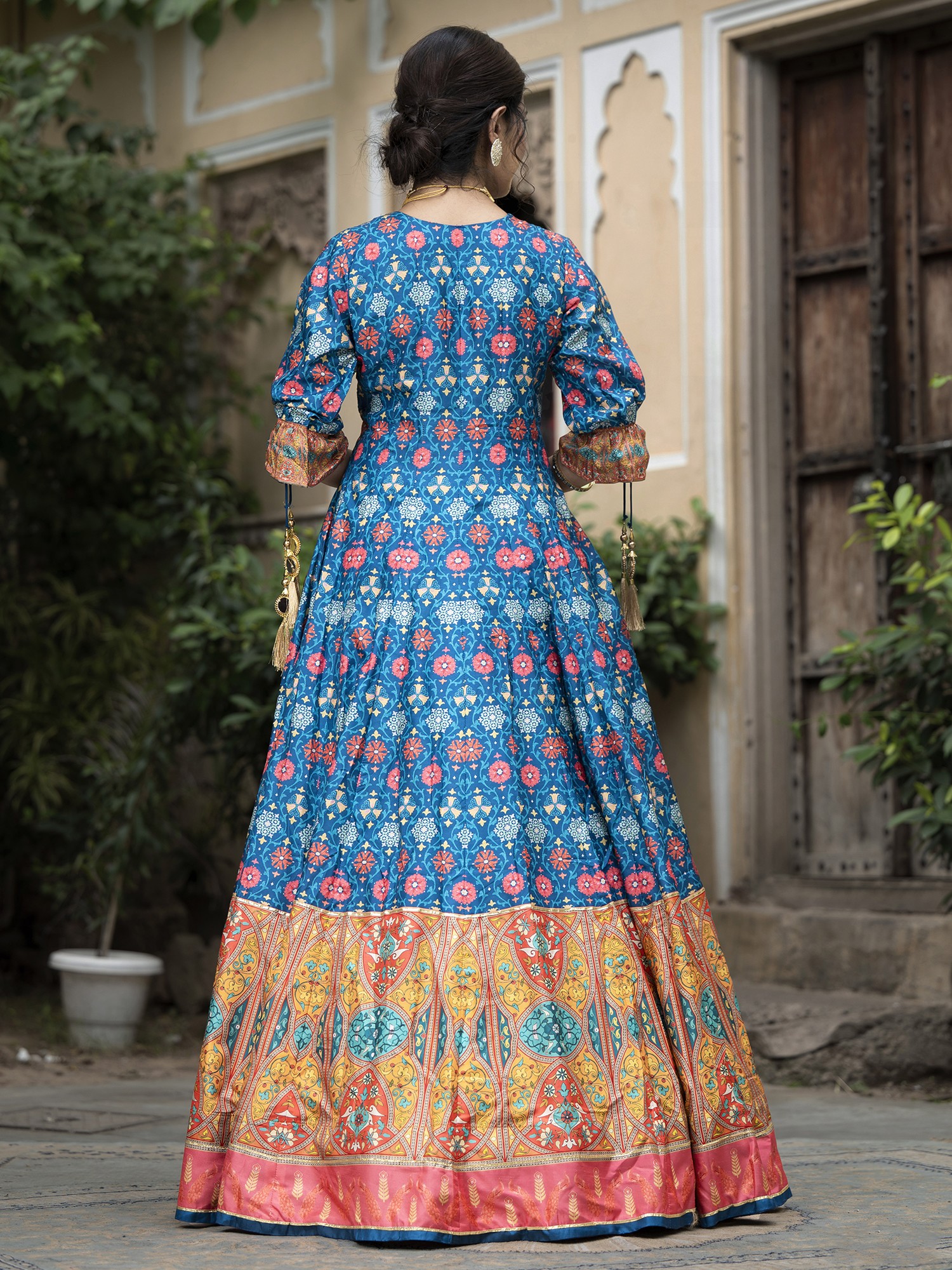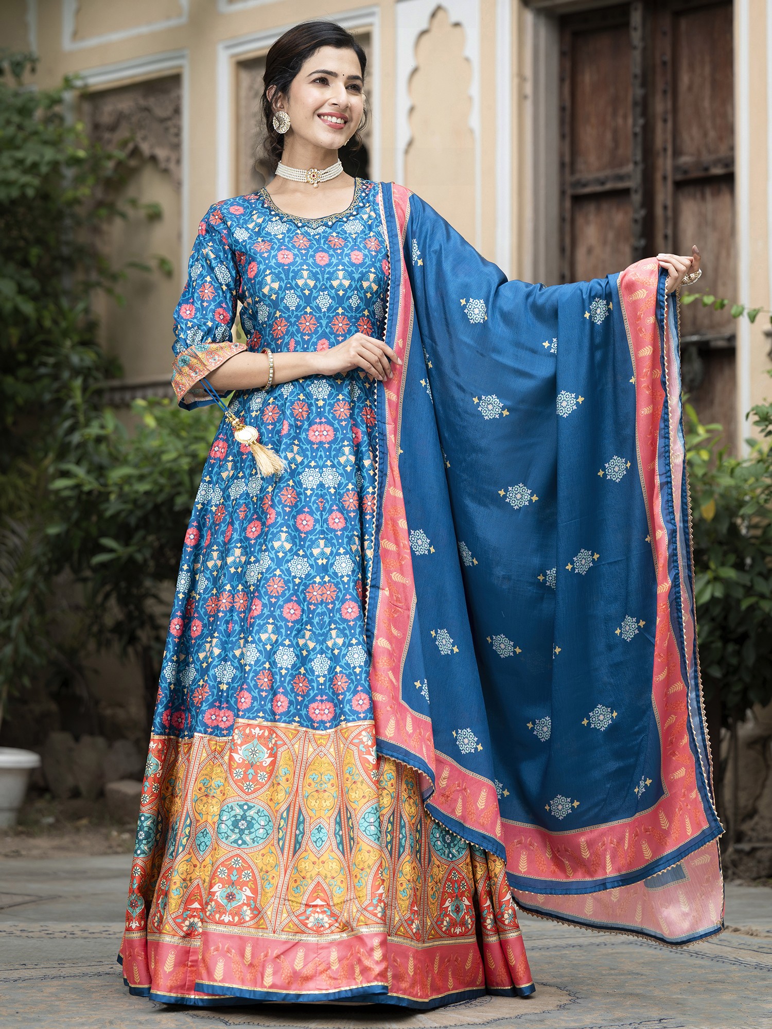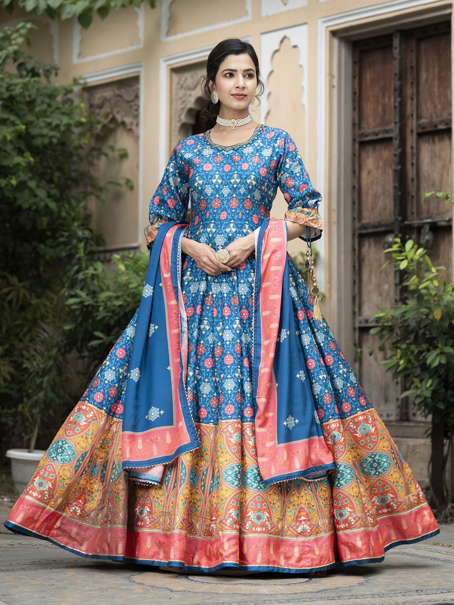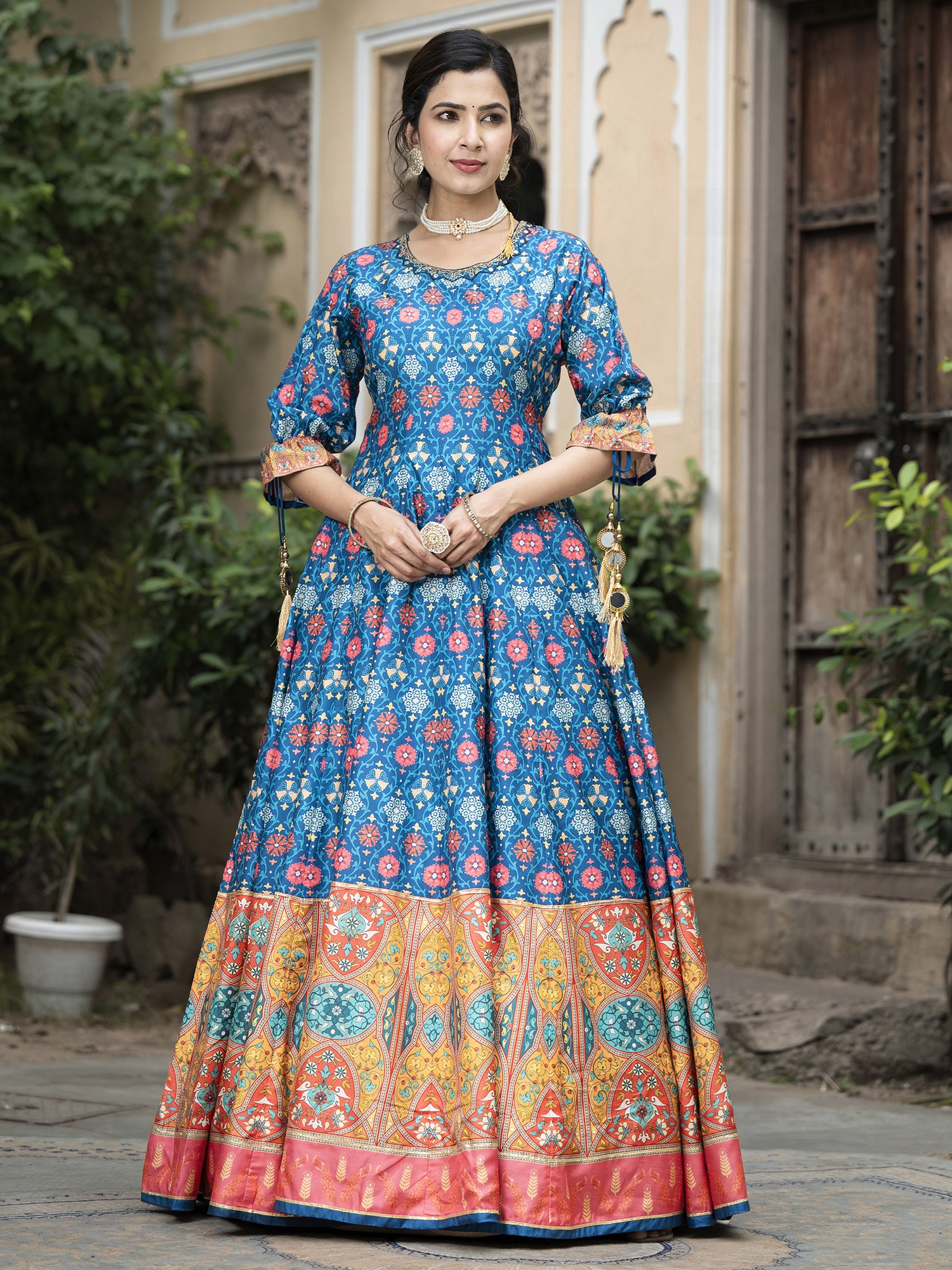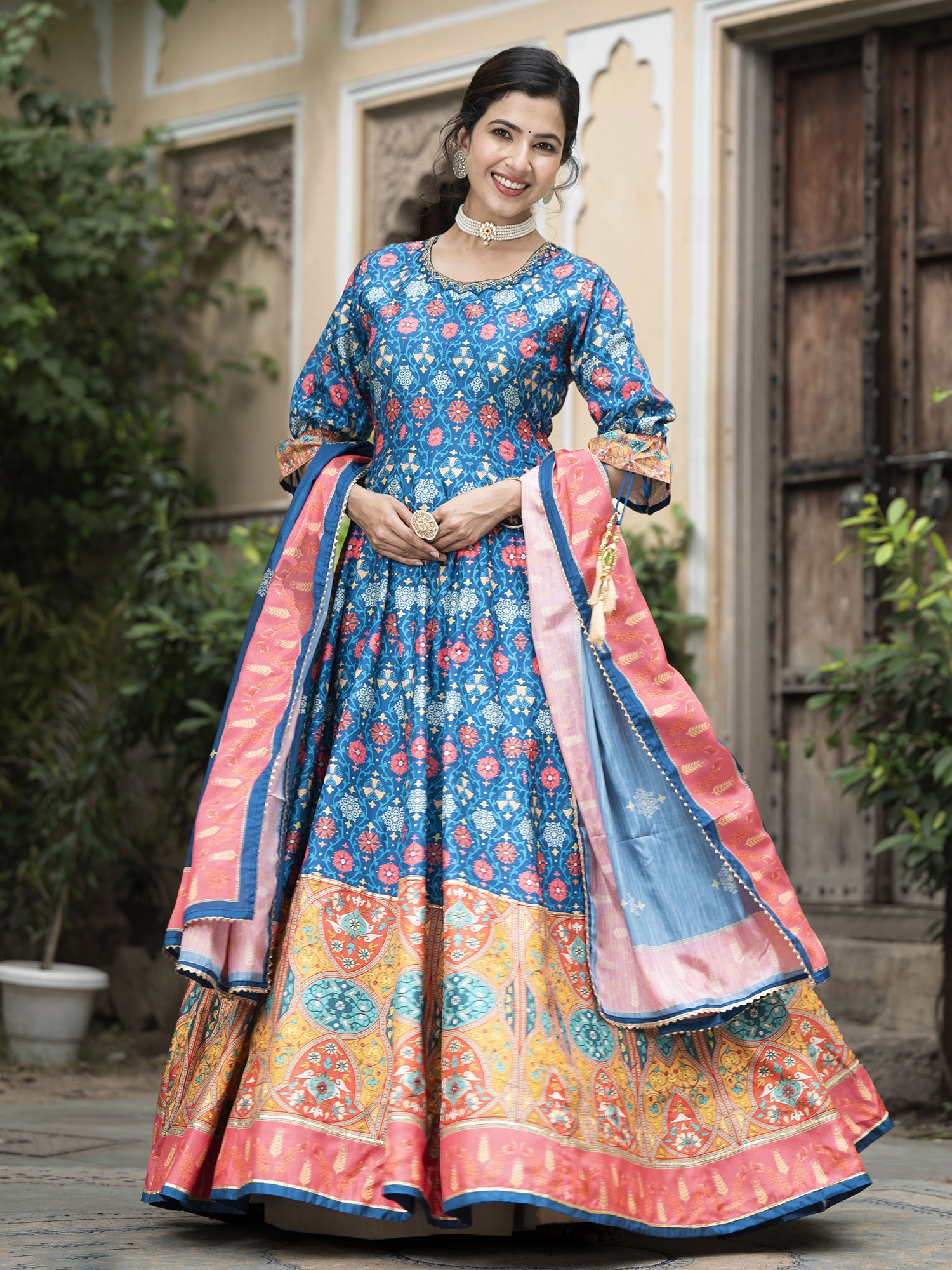Step into a world of timeless beauty with this captivating Anarkali gown. Designed for the modern woman who cherishes tradition, this ensemble is a perfect blend of heritage and contemporary style. The intricate digital print showcases a mesmerizing array of ethnic motifs, creating a visual symphony that is both striking and sophisticated. The rich color palette evokes a sense of opulence, making it ideal for weddings and festive occasions. The gown's flared silhouette exudes grace and femininity, allowing you to move with effortless poise. Whether you're twirling on the dance floor or greeting guests, this Anarkali ensures you make a memorable statement. The comfortable yet luxurious fabric drapes beautifully, enhancing your natural curves and creating a flattering fit.