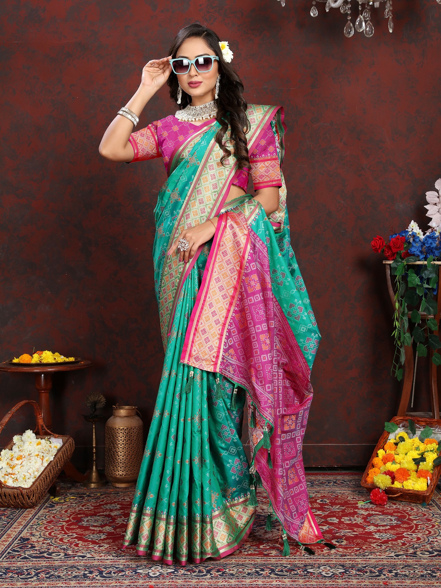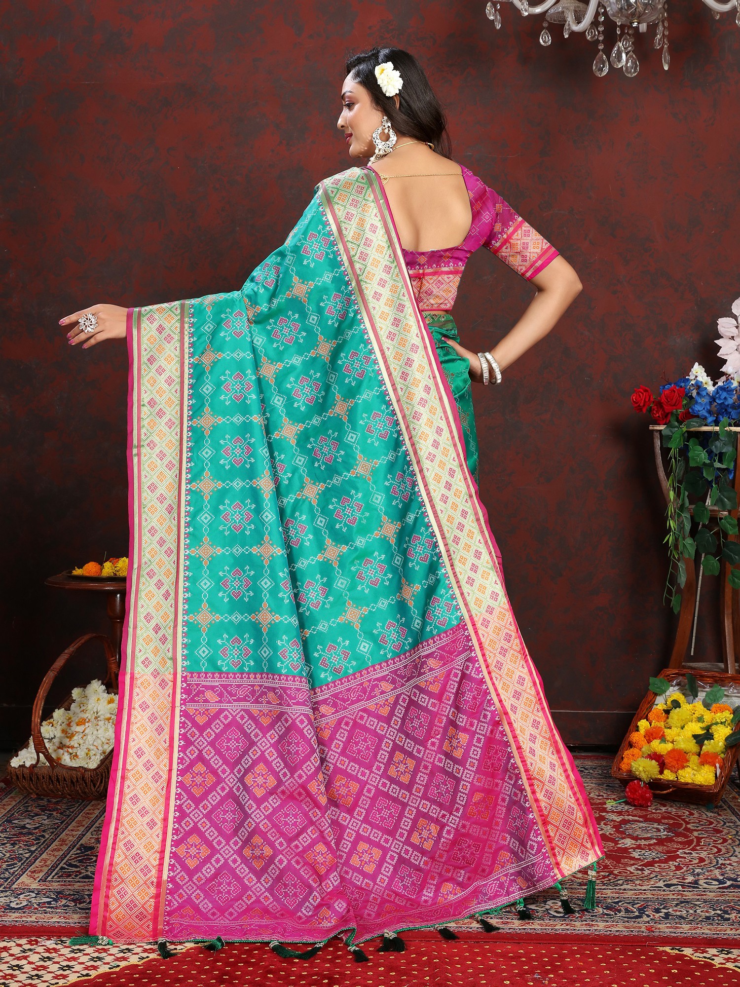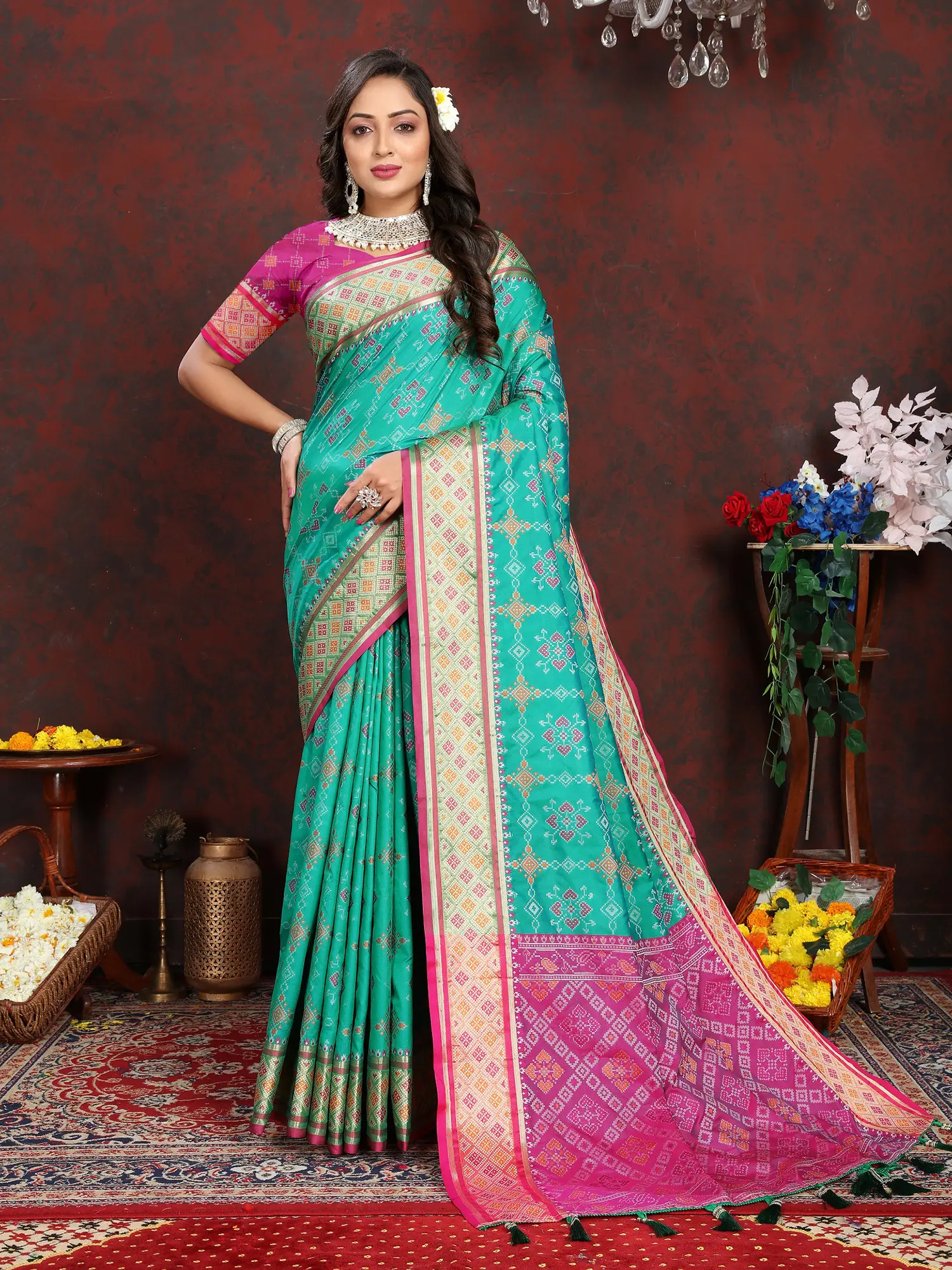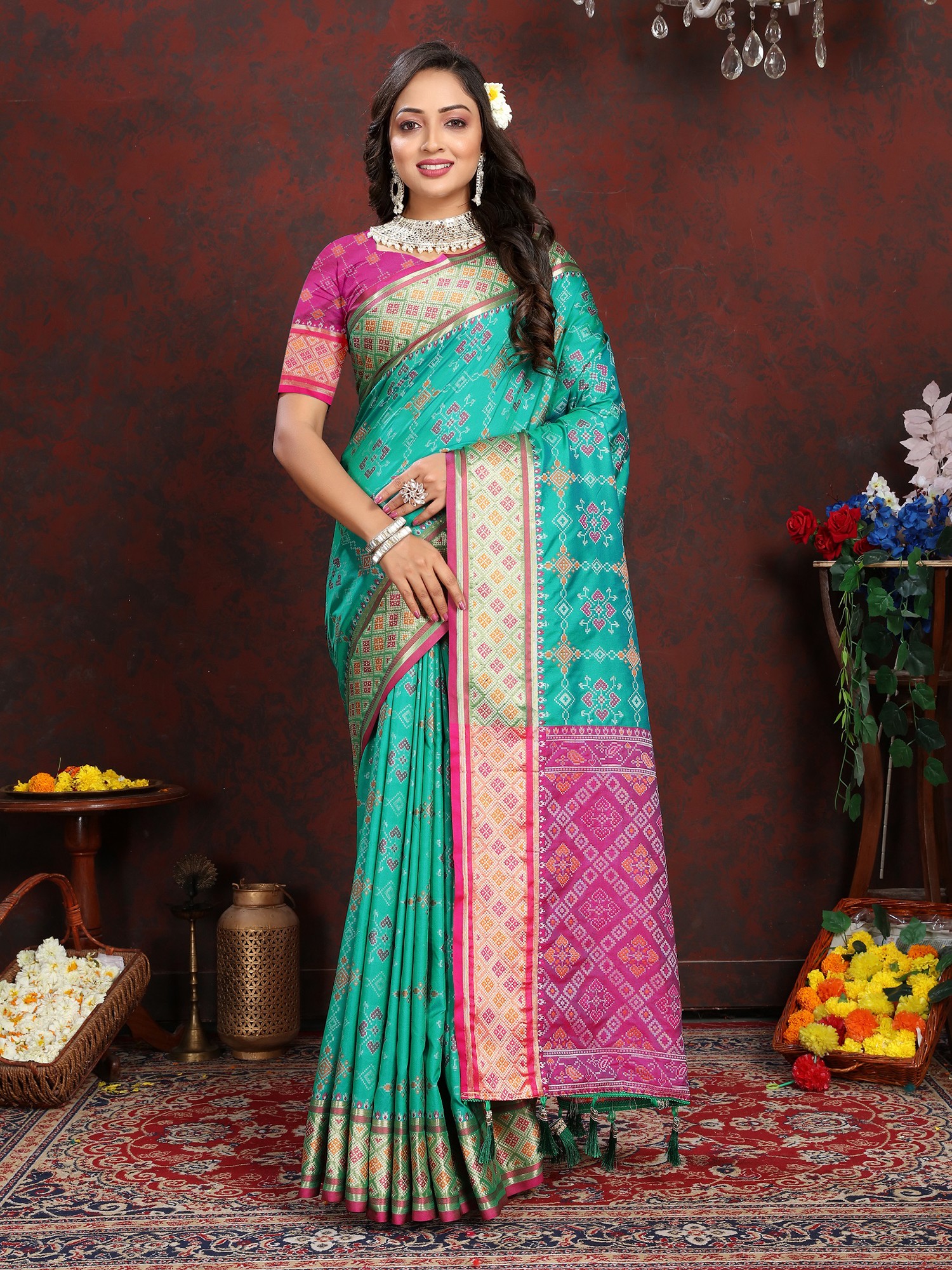 The true artistry of this saree lies in its detailed weaving. Each motif is rendered with precision, showcasing a remarkable interplay of colors and geometric designs that add depth and dimension to the fabric. The pallu, a significant element of the saree, is adorned with charming tassels, lending a playful yet refined finish. These delicate additions not only enhance the aesthetic appeal but also add a graceful sway with every movement, making you the center of attention at any event. The contrasting border further accentuates the richness of the silk, framing the elaborate patterns with a touch of opulence.