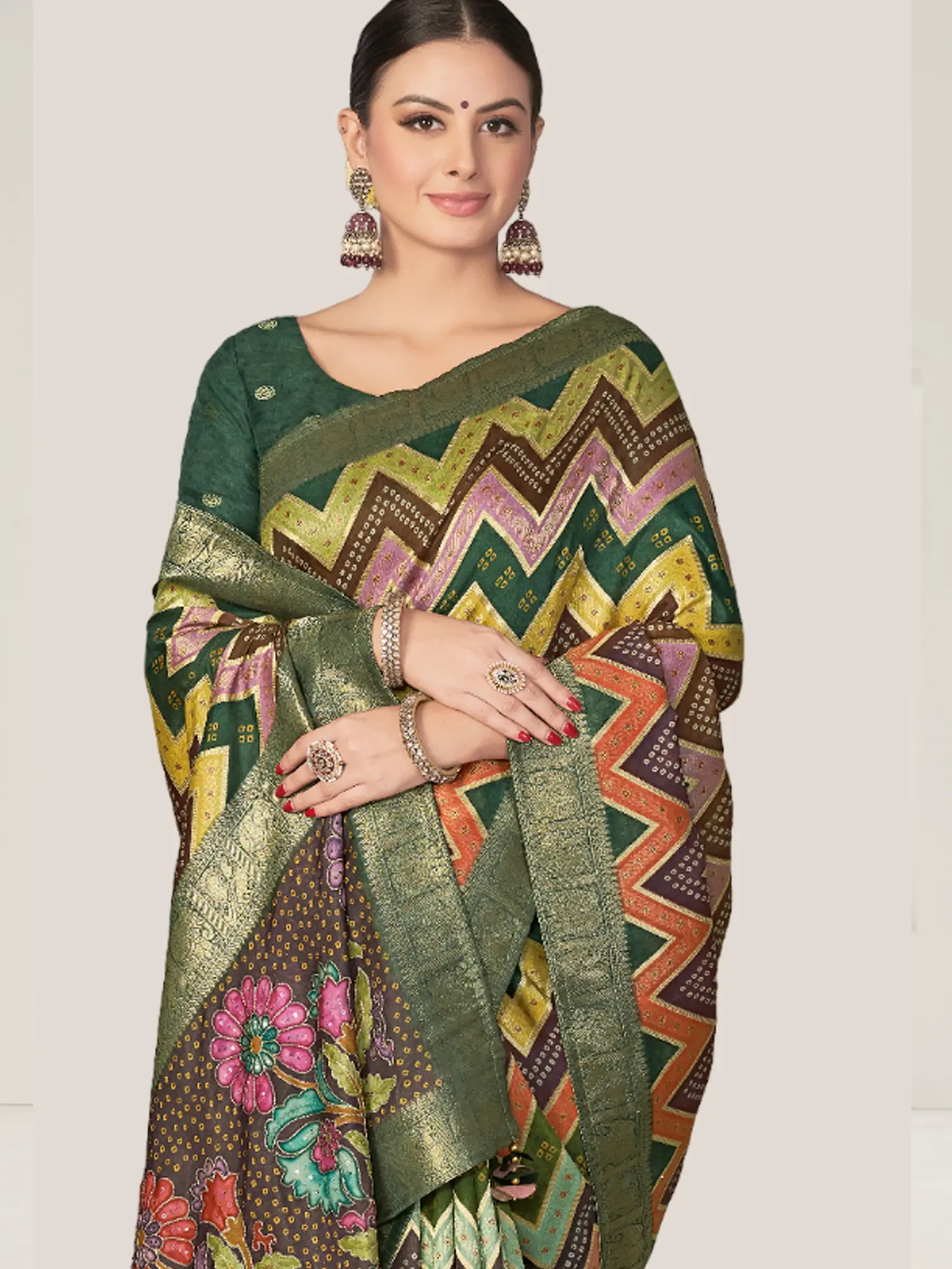 The visual narrative of this saree is captivating, merging bold geometric patterns with delicate natural motifs. The body of the saree is adorned with a vibrant chevron design, rendered in a harmonious medley of earthy greens, rich browns, pops of vibrant orange, soft lavender, and sunny yellow. This striking zigzag pattern creates a sense of movement and modern flair, while the intricate woven details within each chevron add a layer of artisanal craftsmanship. Transitioning from the dynamic chevron, the pallu and border introduce a contrasting yet complementary element: a beautifully woven floral design. This section bursts with life, featuring intricately rendered blooms in shades of fuchsia, teal, coral, and violet, set against a deep, grounding base. The juxtaposition of sharp geometric lines and soft, organic forms creates a truly unique and eye-catching aesthetic, ensuring you stand out in any gathering.