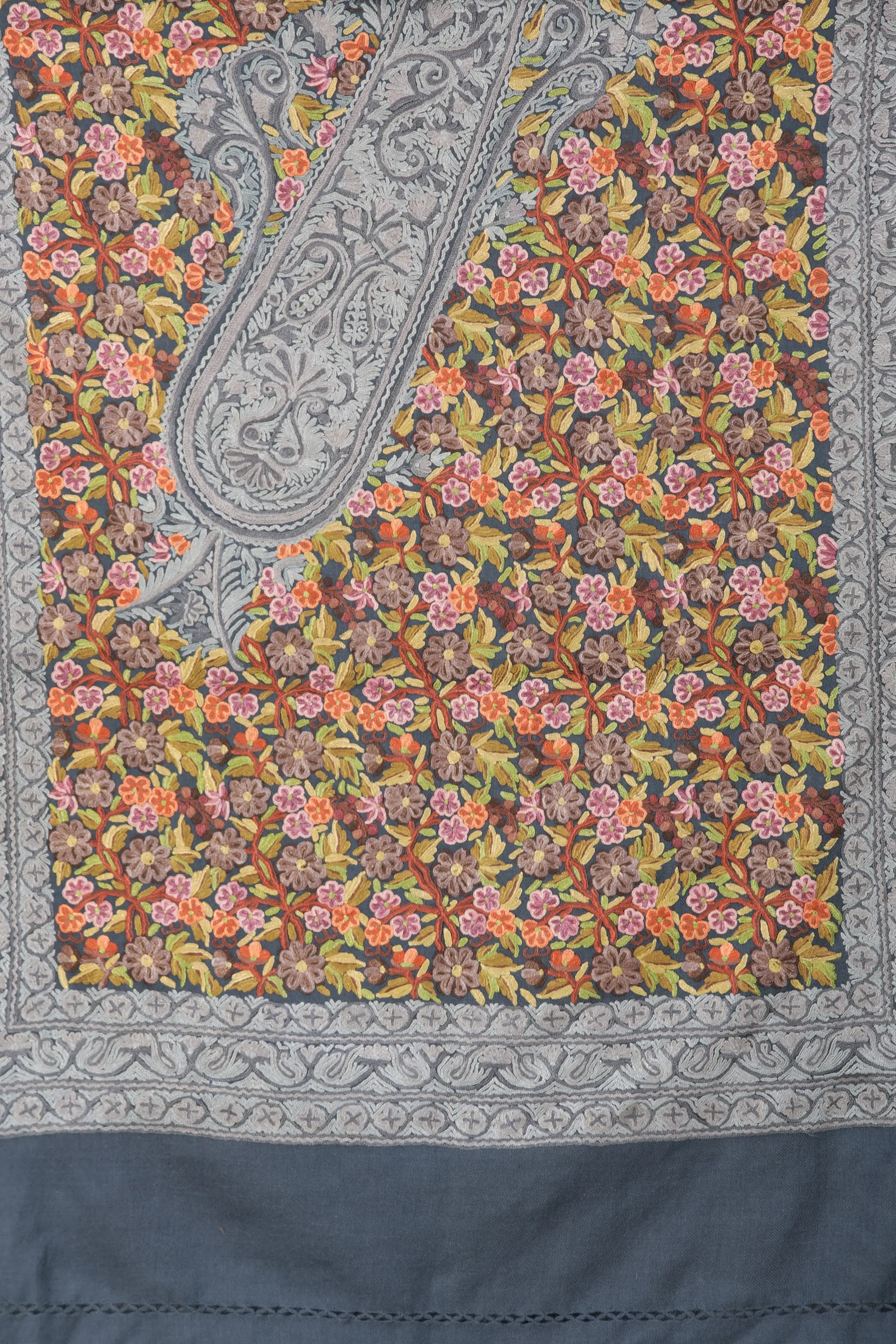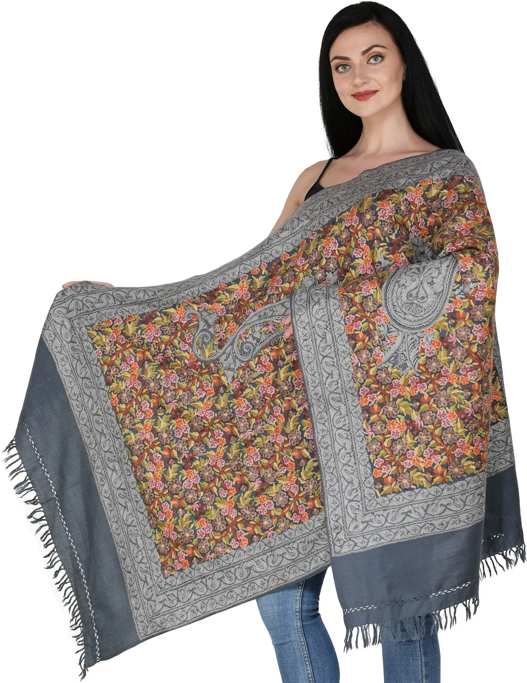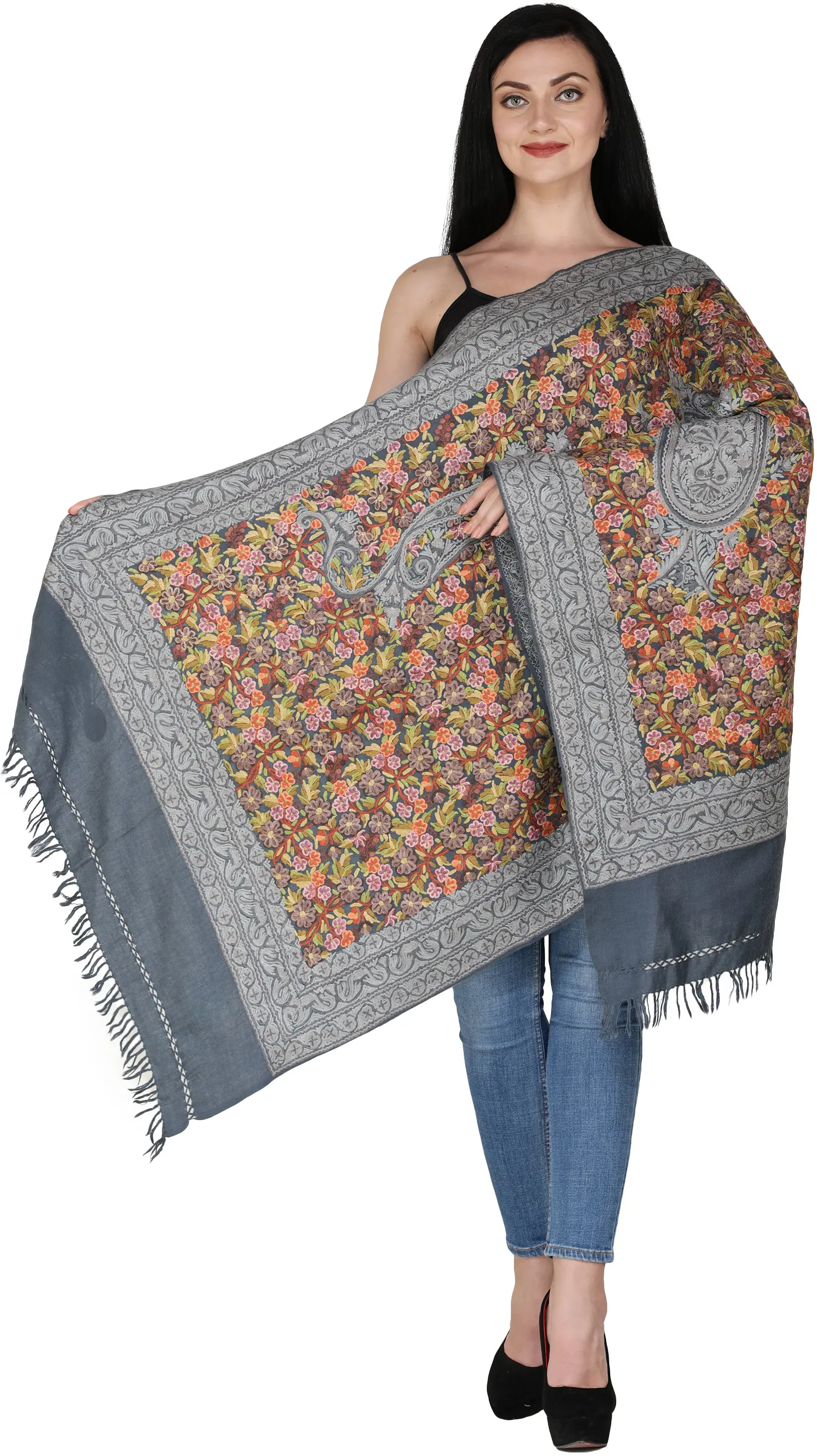 Pure Wool Stole with Aari Hand-Embroidered Butterflies and Floral Vines from Kashmir