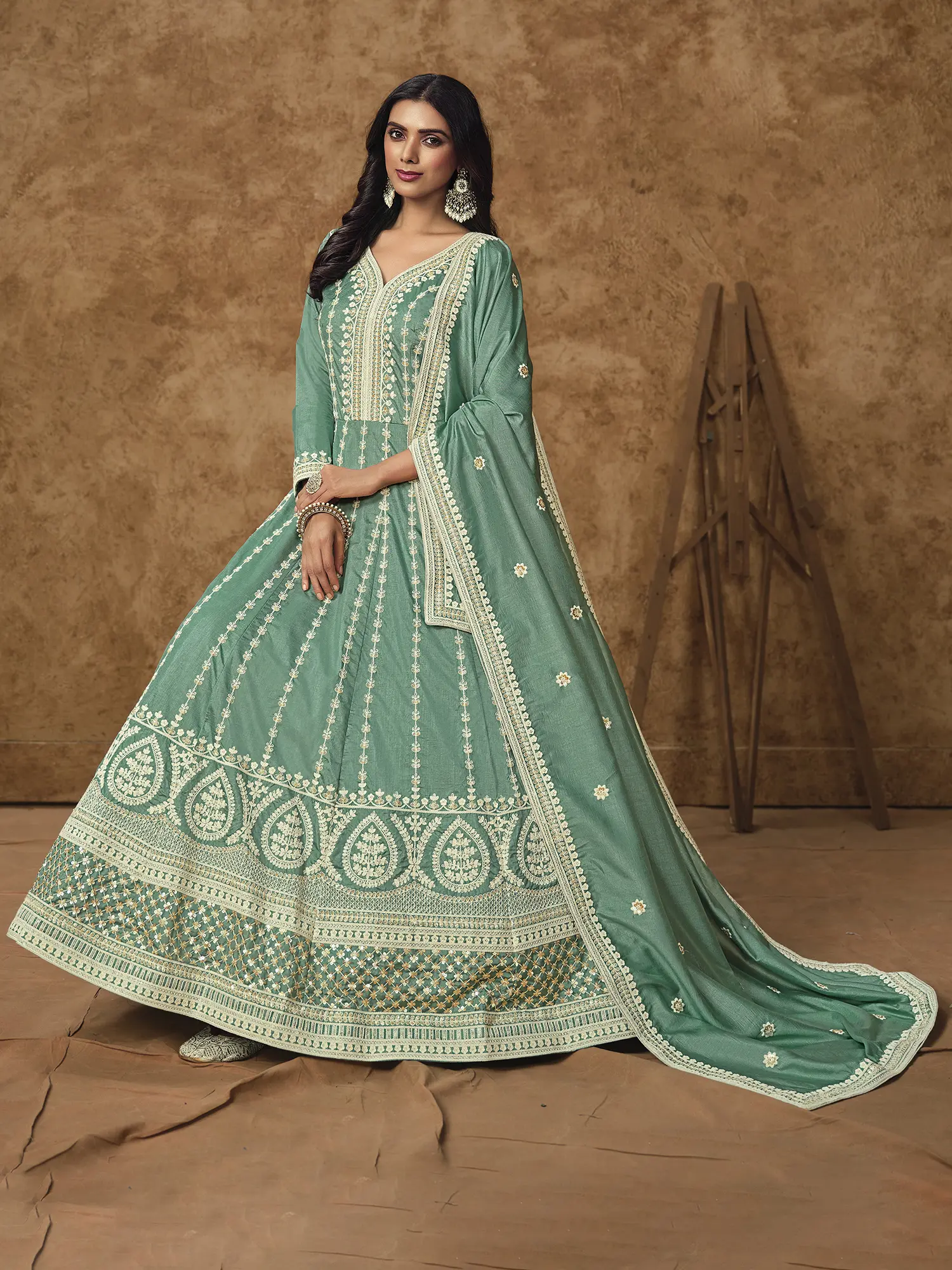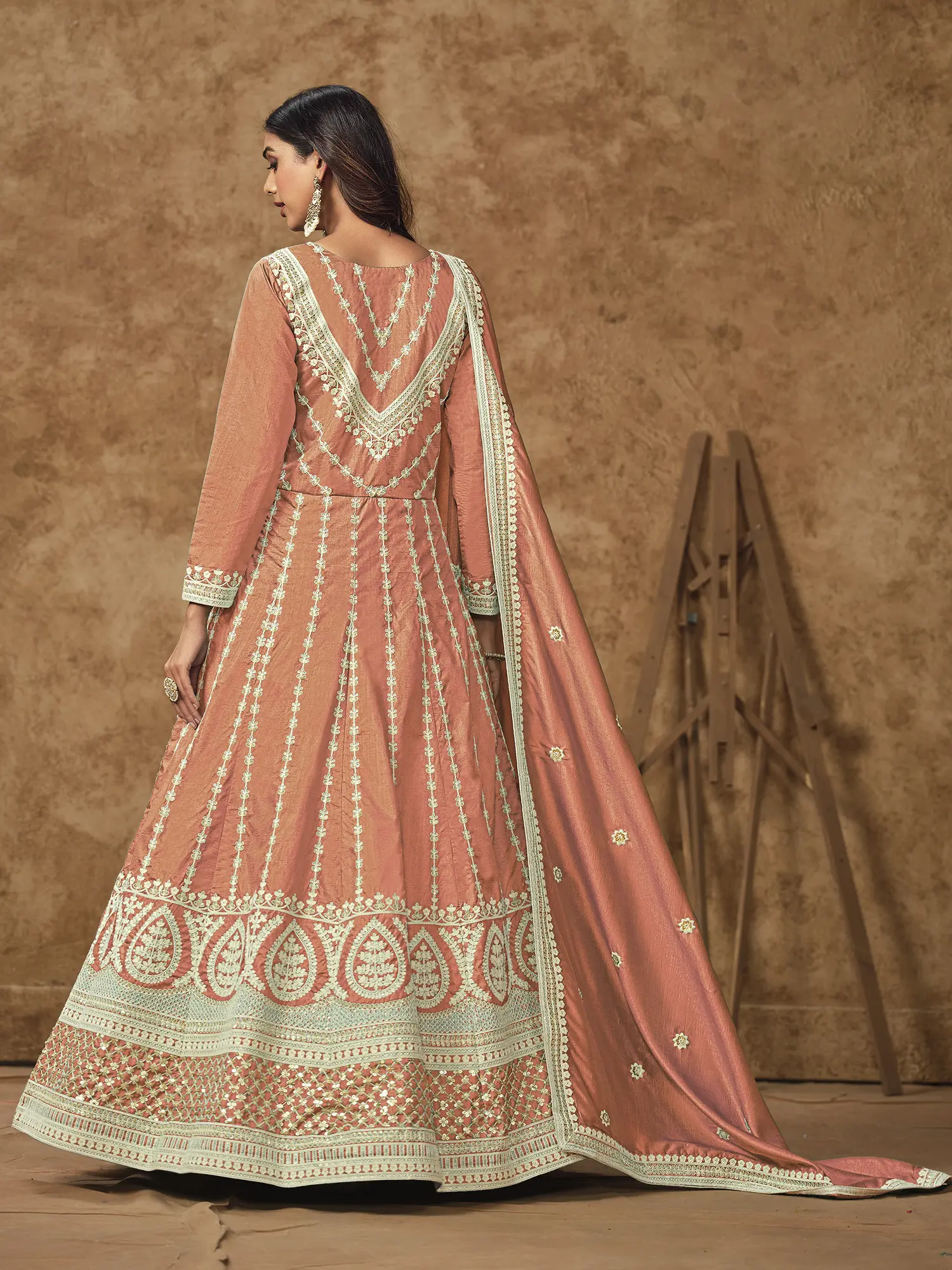 This design draws inspiration from traditional Indian ethnic wear, reimagined for the modern connoisseur. The Anarkali silhouette, historically associated with royalty and grandeur, is here presented with contemporary flair. It embodies a rich cultural narrative, a testament to enduring style and celebratory traditions that transcend time.