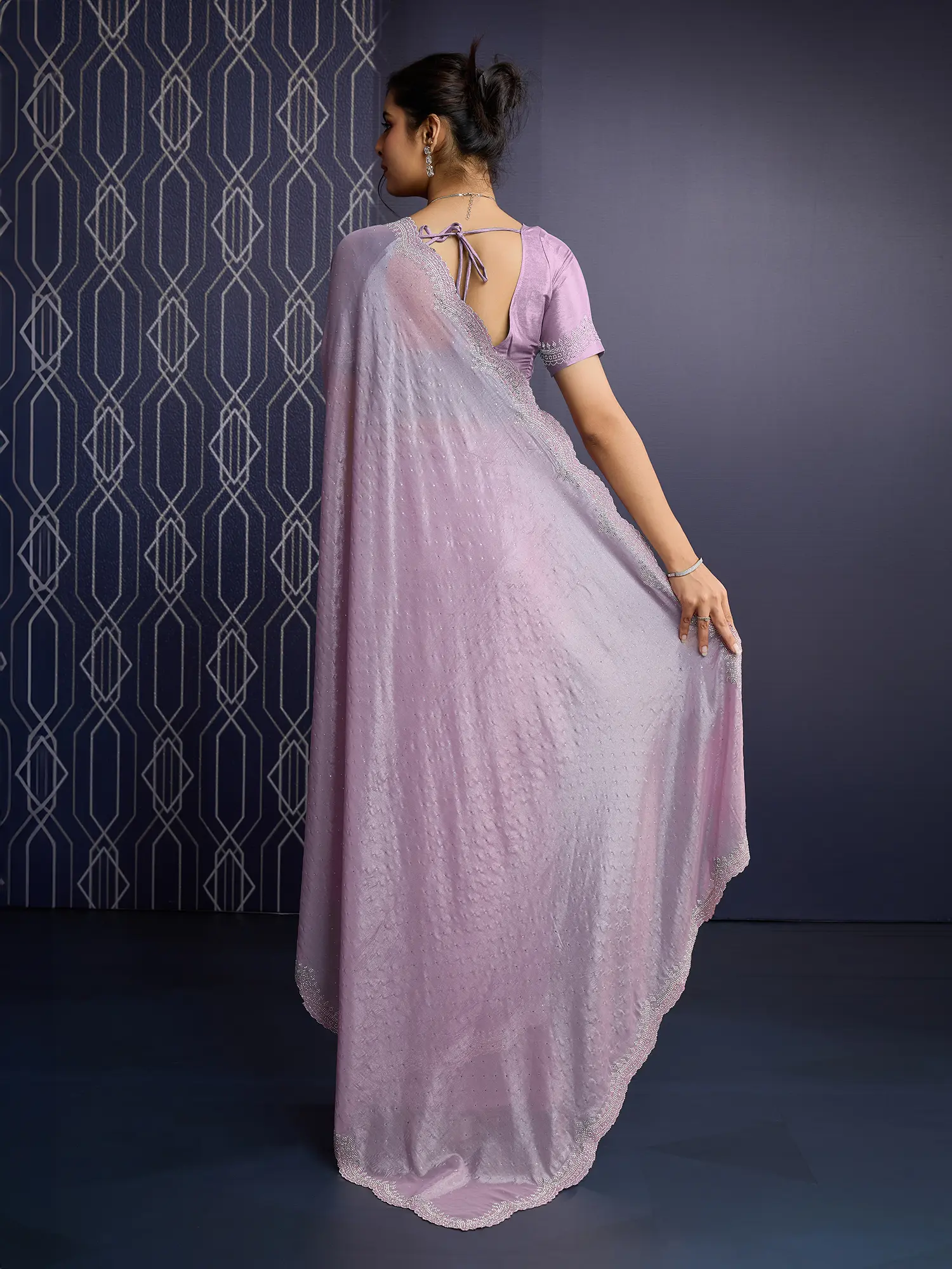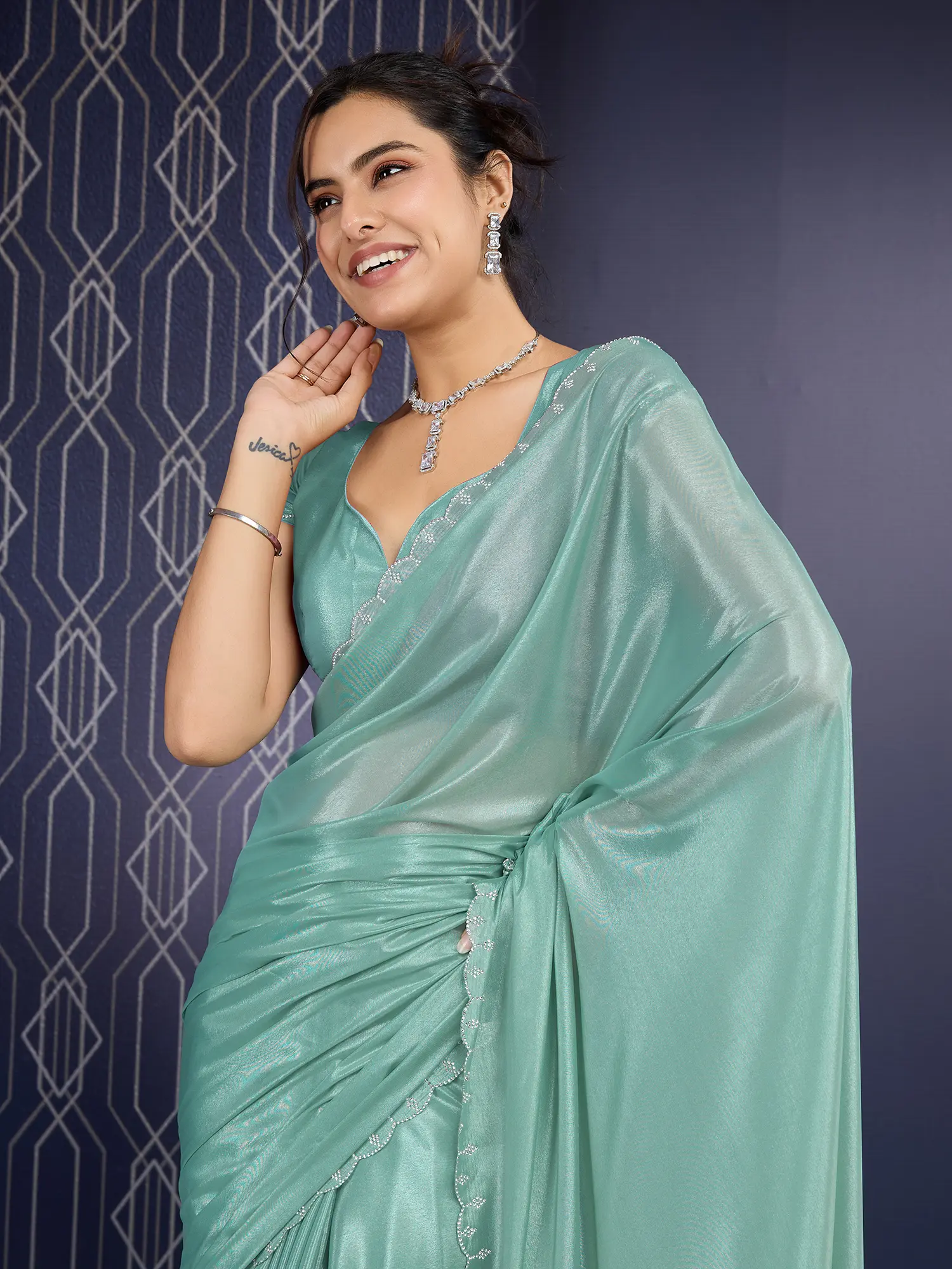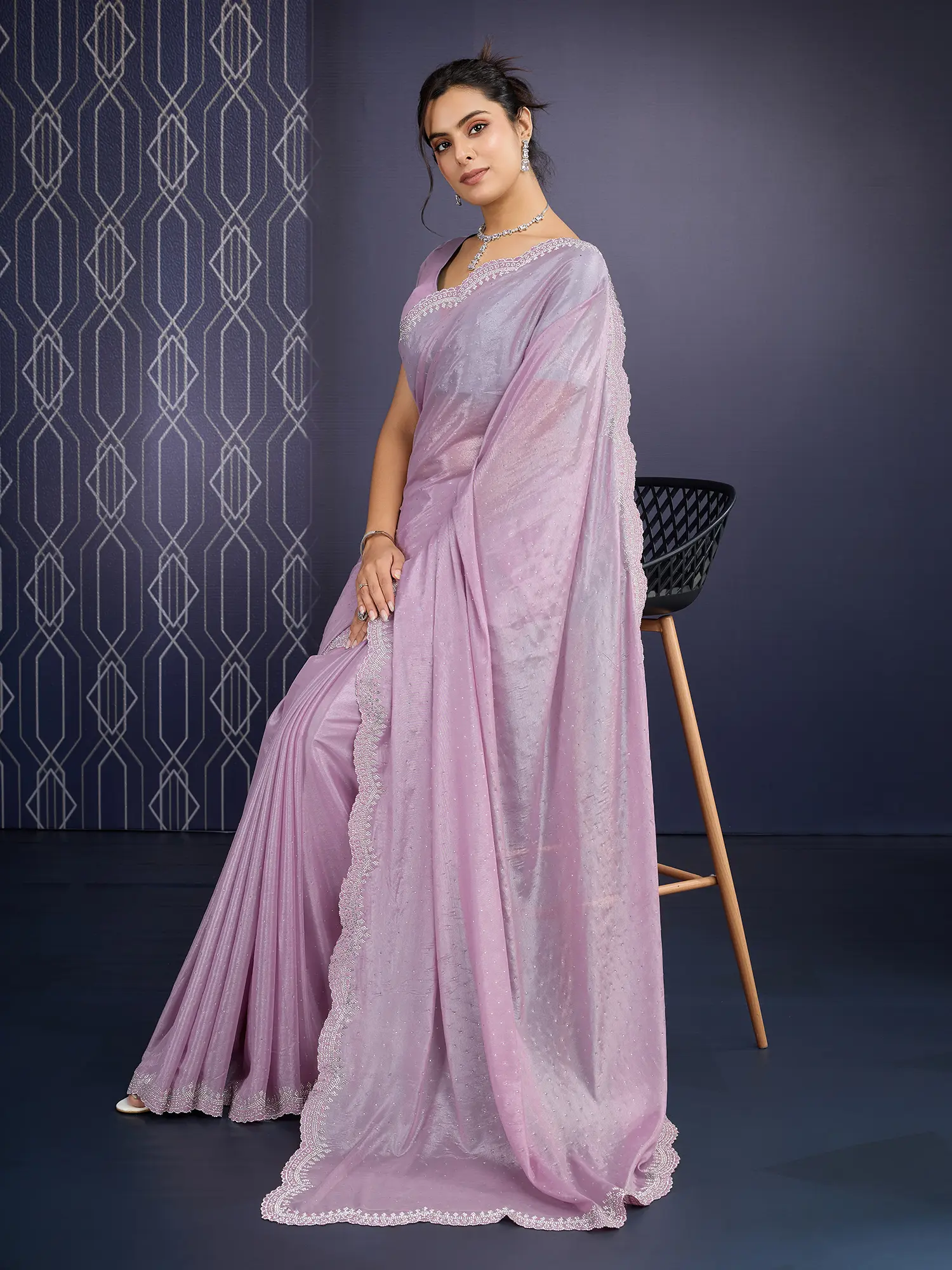 Radiant Glass Tissue Saree Adorned With Sparkling Sequence And Glamorous Moti Work Embellished Border Design