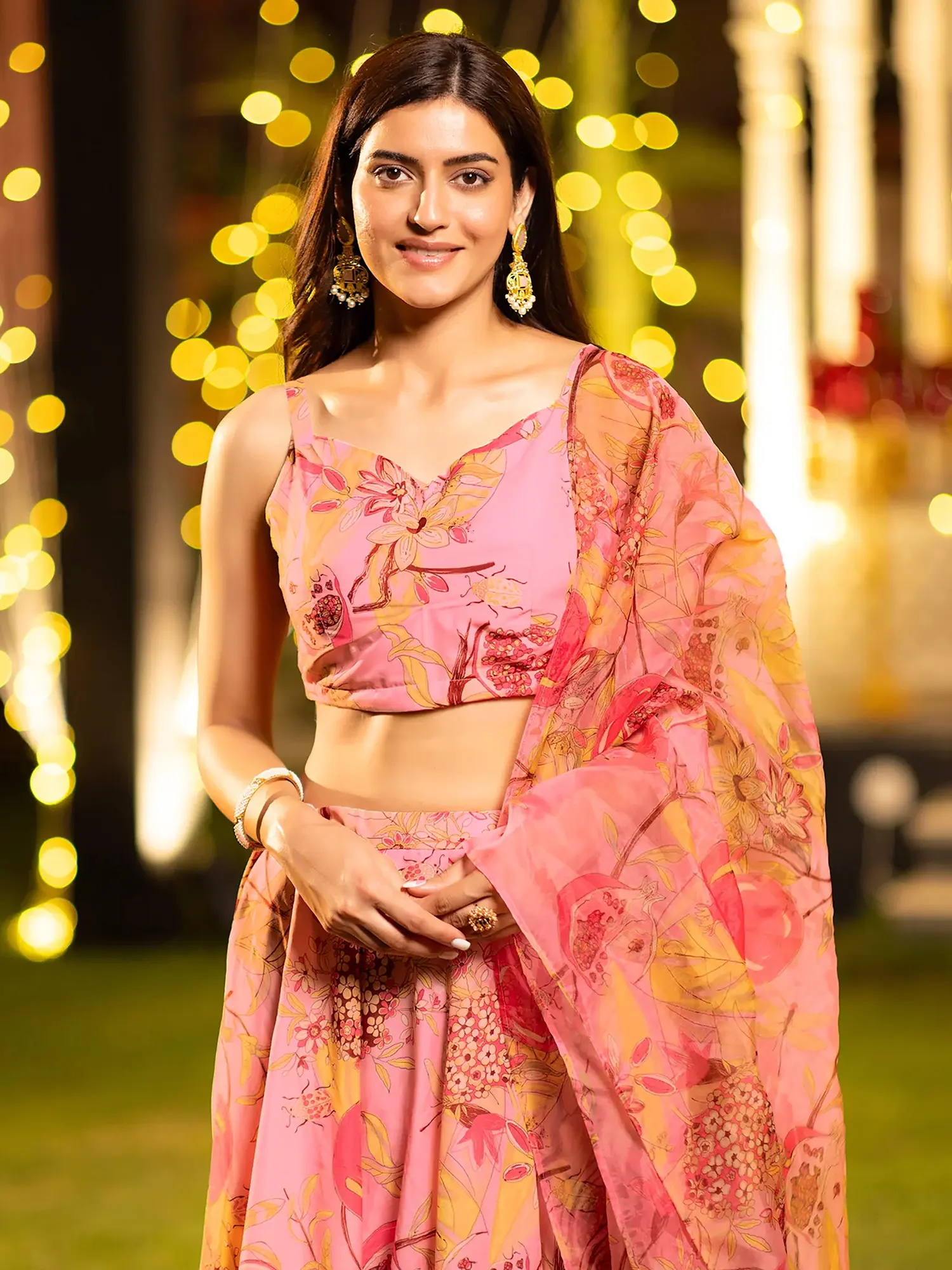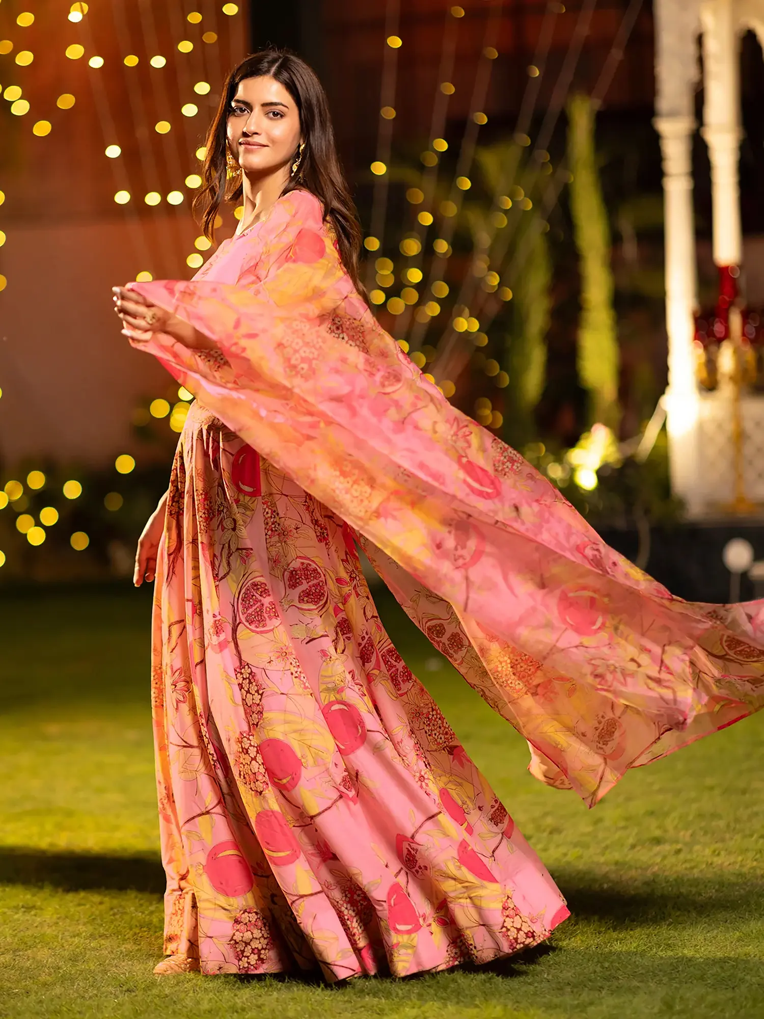 Prepare to be captivated by the stunning digital print adorning this set. A vibrant tableau of pink floral motifs, interspersed with playful pomegranate designs, creates a visually arresting spectacle. This intricate pattern is rendered with remarkable clarity, bringing the artwork to life with every fold and swirl. The generous drape of the accompanying dupatta further enhances the visual narrative, creating a truly unforgettable silhouette.