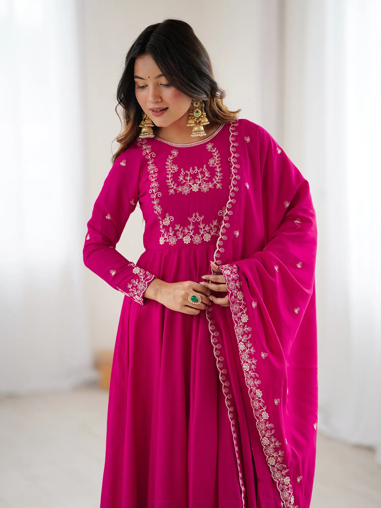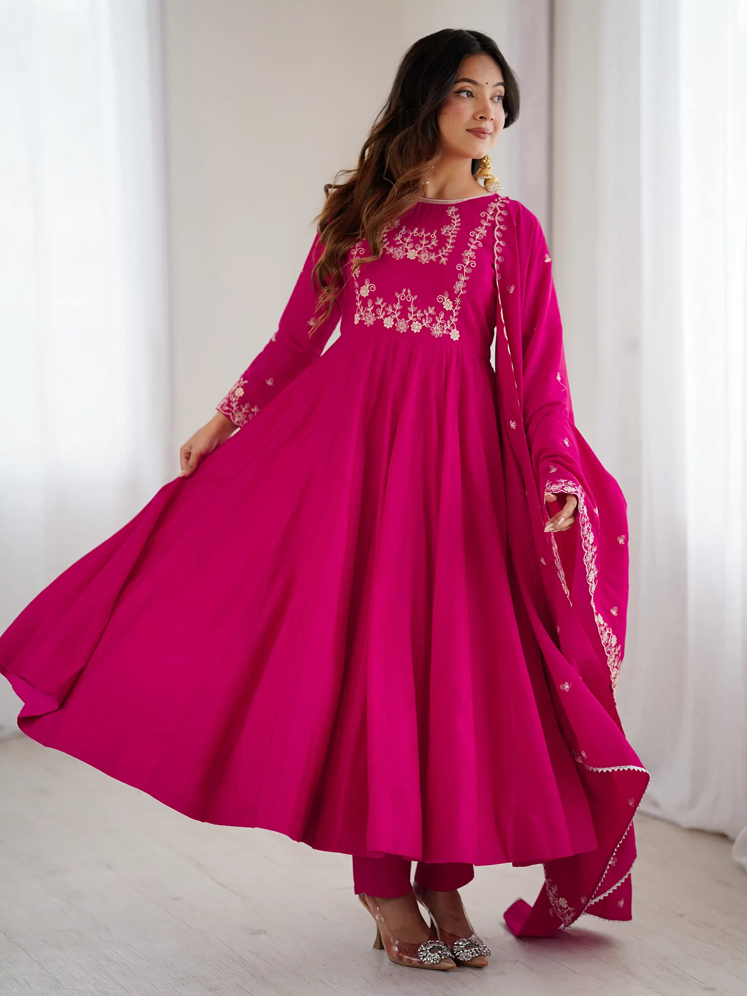 The generously flared silhouette of the Anarkali is designed to create a mesmerizing flow with every movement. Delicate embroidery graces the neckline and sleeves, mirroring the intricate beadwork on the yoke, adding a touch of refined opulence. The accompanying dupatta features a beautifully detailed border, completing the ensemble with a flourish of elegant symmetry, allowing the rich silk to cascade with every step you take.
