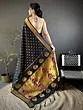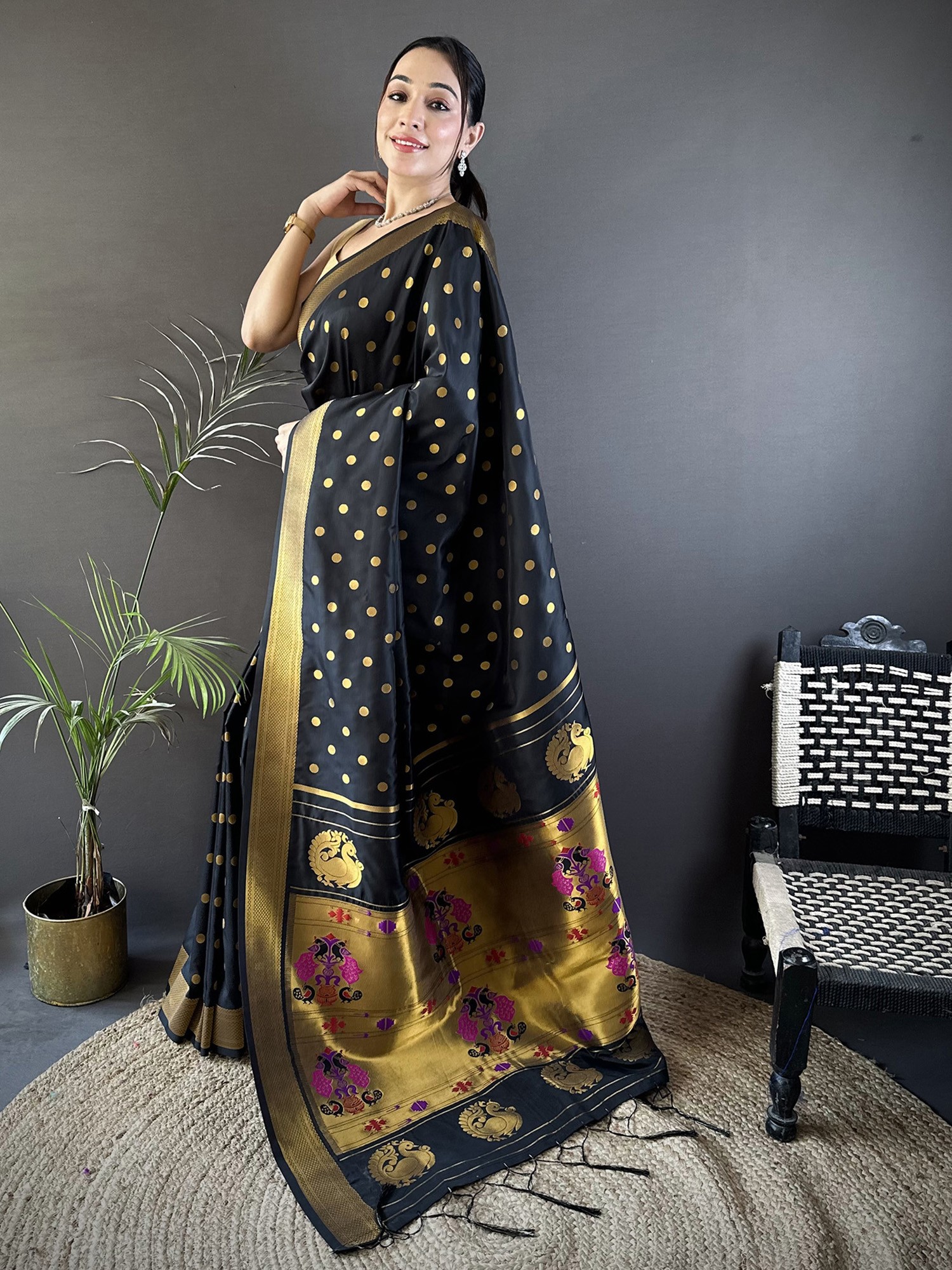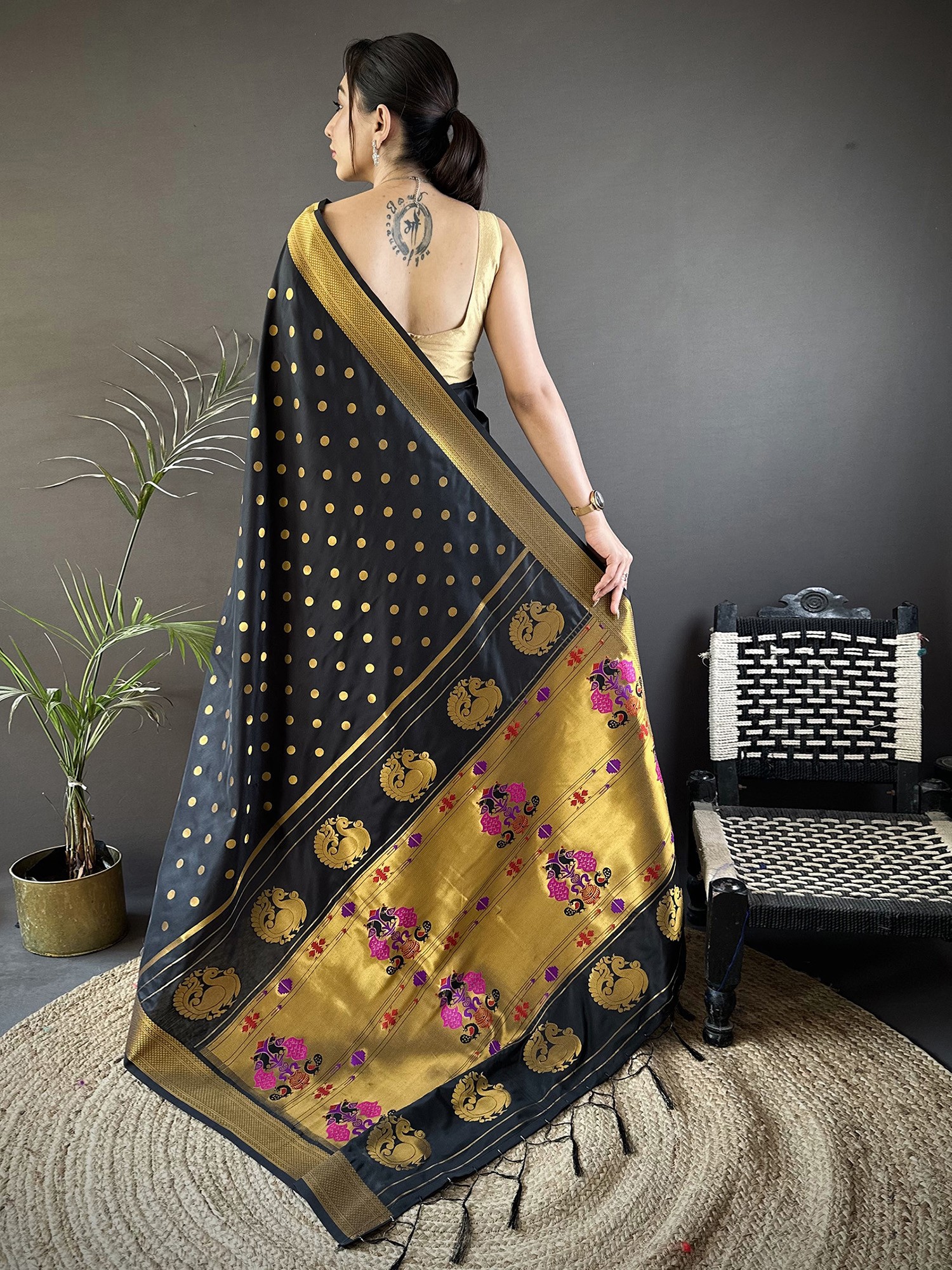 Adorned with a sophisticated polka dot motif, this piece offers a delicate yet striking visual appeal. The deep, lustrous black forms a perfect canvas for the shimmering gold dots, creating a classic contrast that never goes out of style. Accompanying these are broad borders, richly embellished with traditional motifs rendered in opulent gold, adding a regal flourish. You'll appreciate the stunning detail in the border's artistic depictions, adding depth and narrative to the overall design.