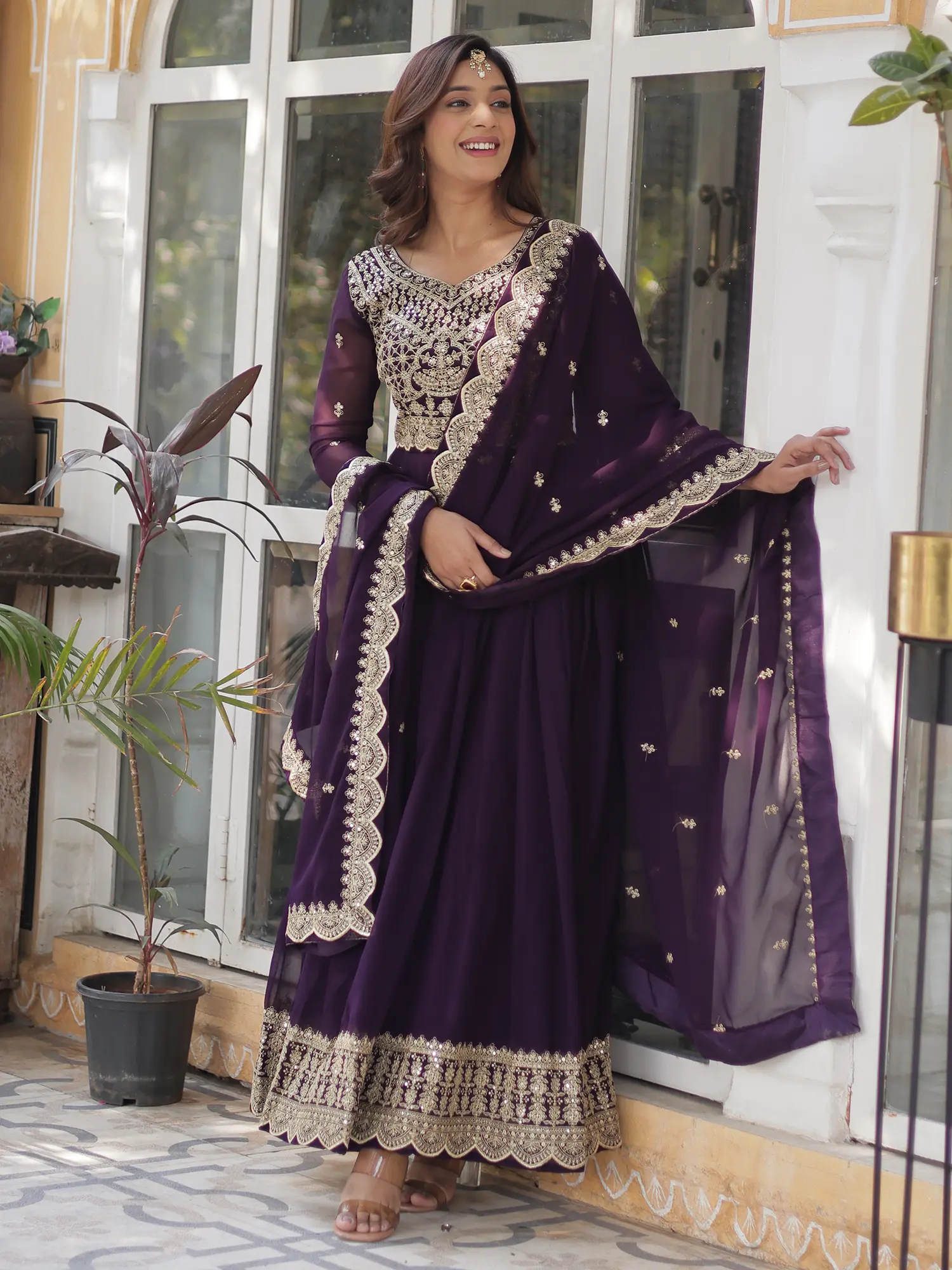 No ethnic ensemble is complete without its perfect companion, and this set includes a beautifully coordinated dupatta. Crafted from a sheer, lightweight fabric, the dupatta is designed to complement the richness of the gown without overpowering it. It features a delicate border of the same intricate zari and sequin embroidery found on the gown, creating a cohesive and polished look. Scattered throughout the dupatta are small, elegant sequin motifs that mirror the larger designs on the dress, adding subtle touches of sparkle and charm. This dupatta can be elegantly draped over the shoulders or styled in various ways to enhance the overall aesthetic.