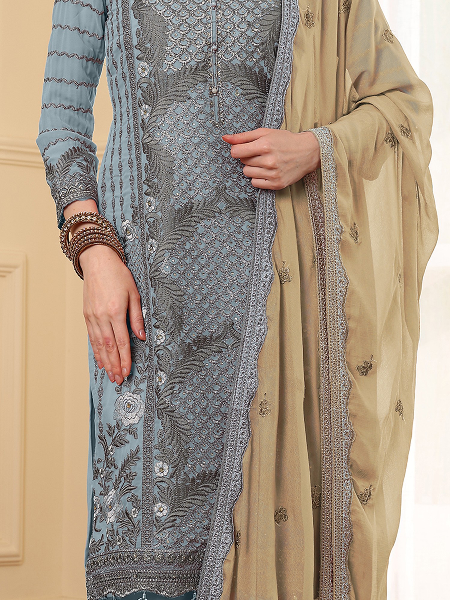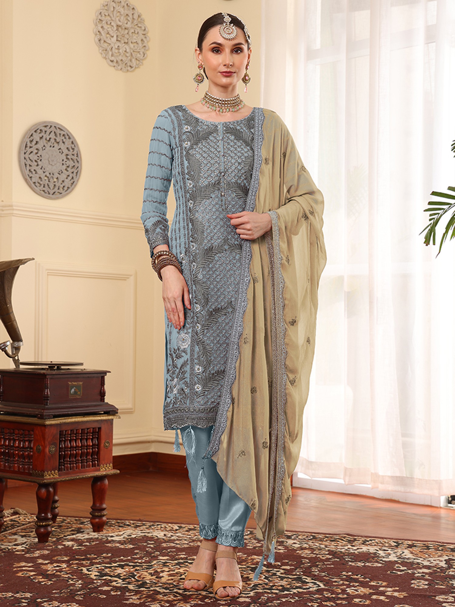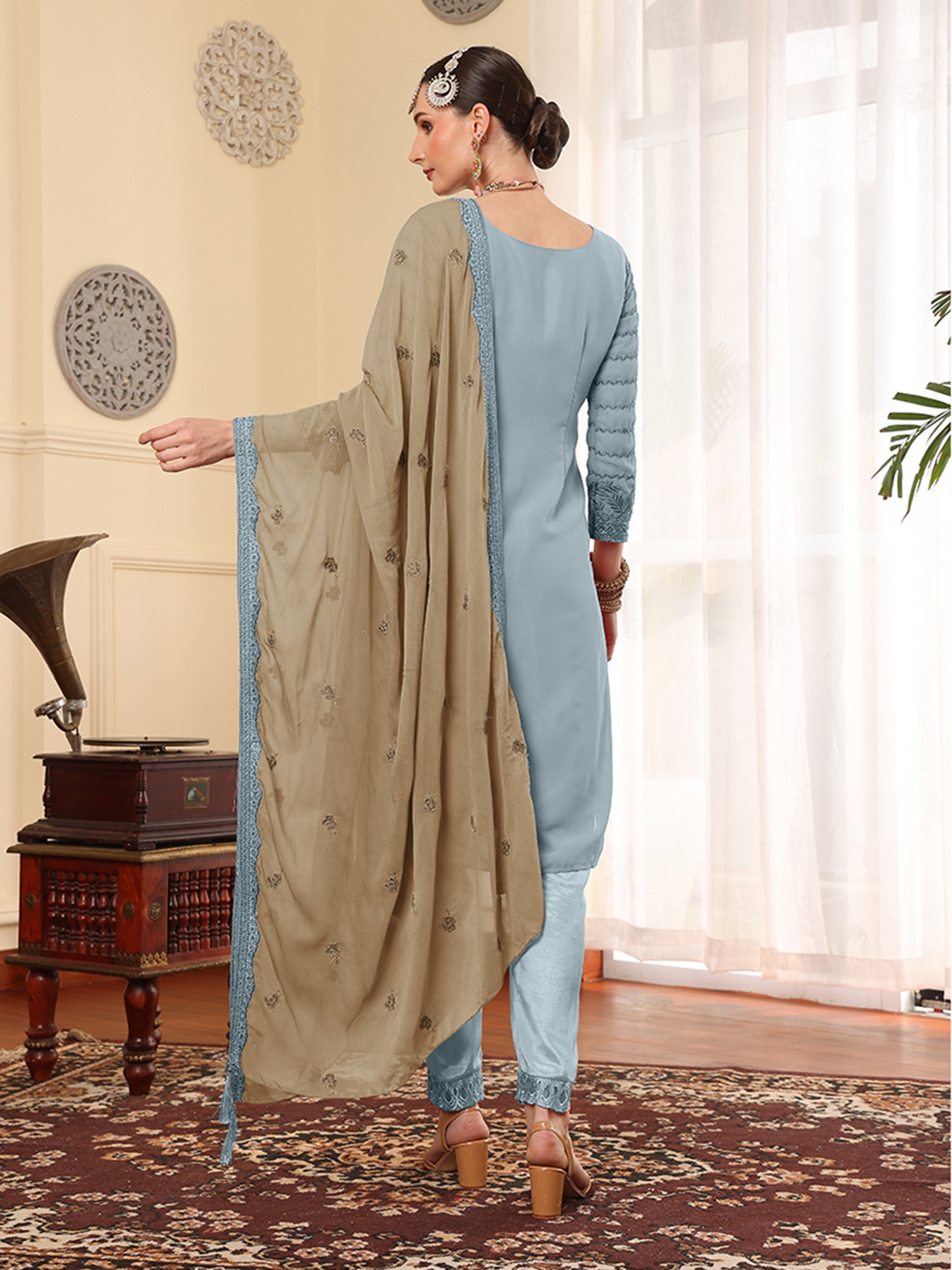This designer salwar suit is more than just an outfit; it's a statement of elegance and grace. Whether you are attending a wedding, a festive celebration, a formal gathering, or a special party, this ensemble is guaranteed to make you stand out. The sophisticated color palette and the rich embroidery make it a versatile piece that can be accessorized to suit various events. Pair it with statement jewelry and complementary footwear to create a look that is uniquely yours and undeniably chic. It’s an ideal choice for those who wish to embrace timeless fashion with a modern sensibility.