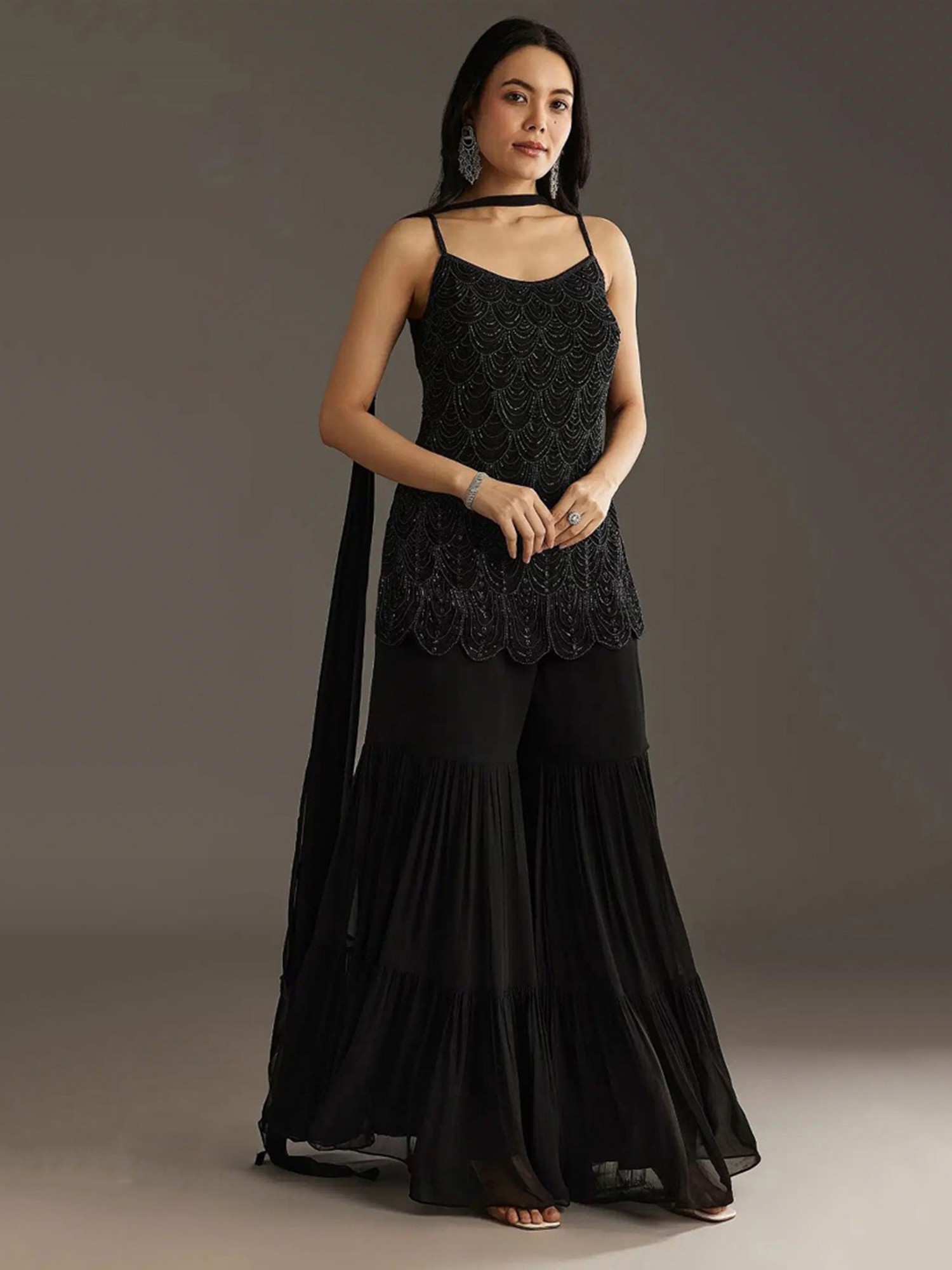 Make an unforgettable entrance in this stunning black faux georgette palazzo suit, meticulously crafted for those who appreciate refined elegance. The short, sleeveless kameez is the centerpiece of this ensemble, adorned with intricate bead embroidery that cascades in a mesmerizing pattern. Each bead is carefully placed, creating a textured and dimensional effect that catches the light beautifully, evoking a sense of luxury and sophistication. The neckline is subtly enhanced by a delicate black choker, adding a touch of modern allure. This piece is designed to be a true statement wear, perfect for festive occasions, parties, or any event where you want to shine.
