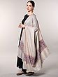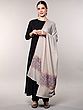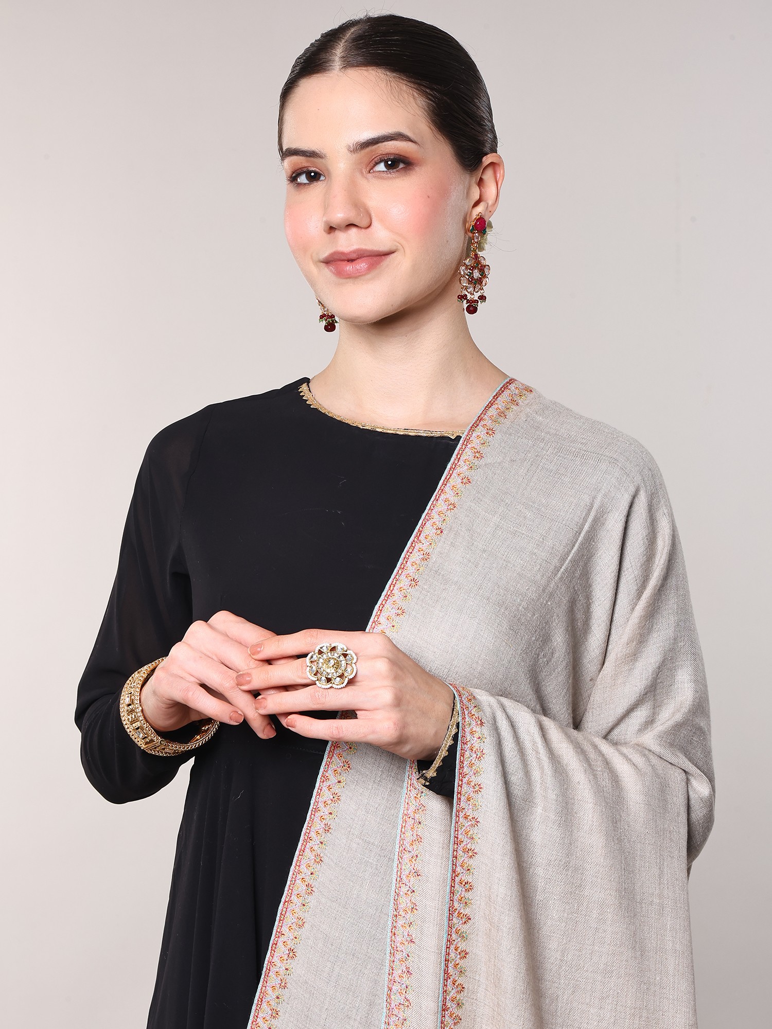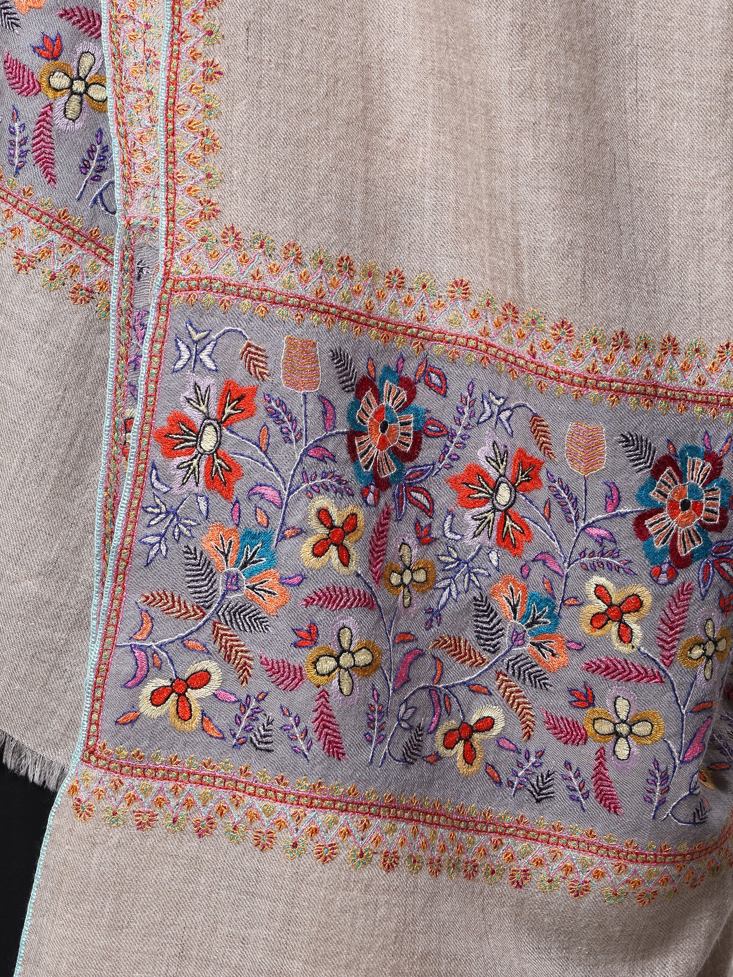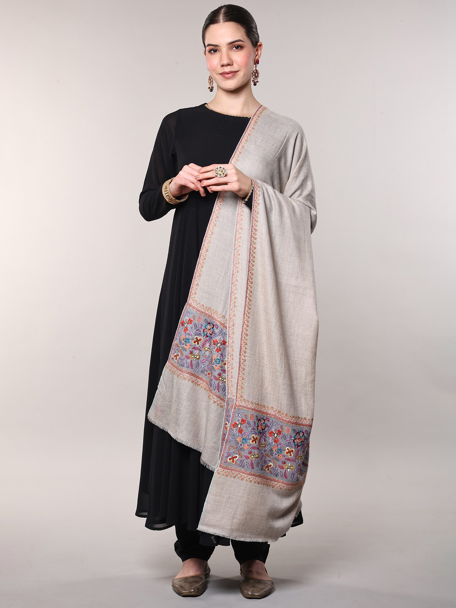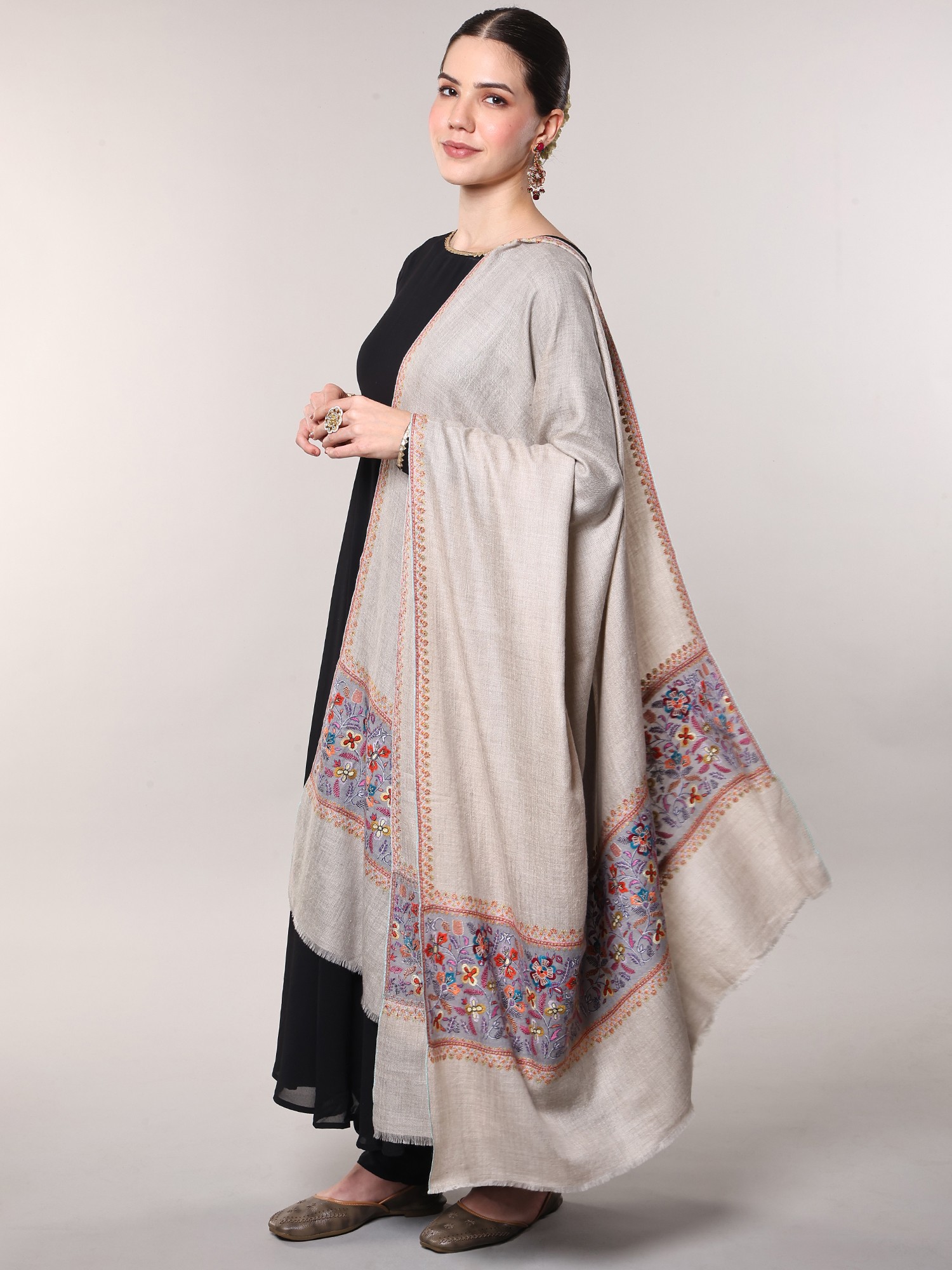 Feather-Gray Pure Pashmina Palladar Shawl with Floral Sozni Embroidery by Hand from Kashmir