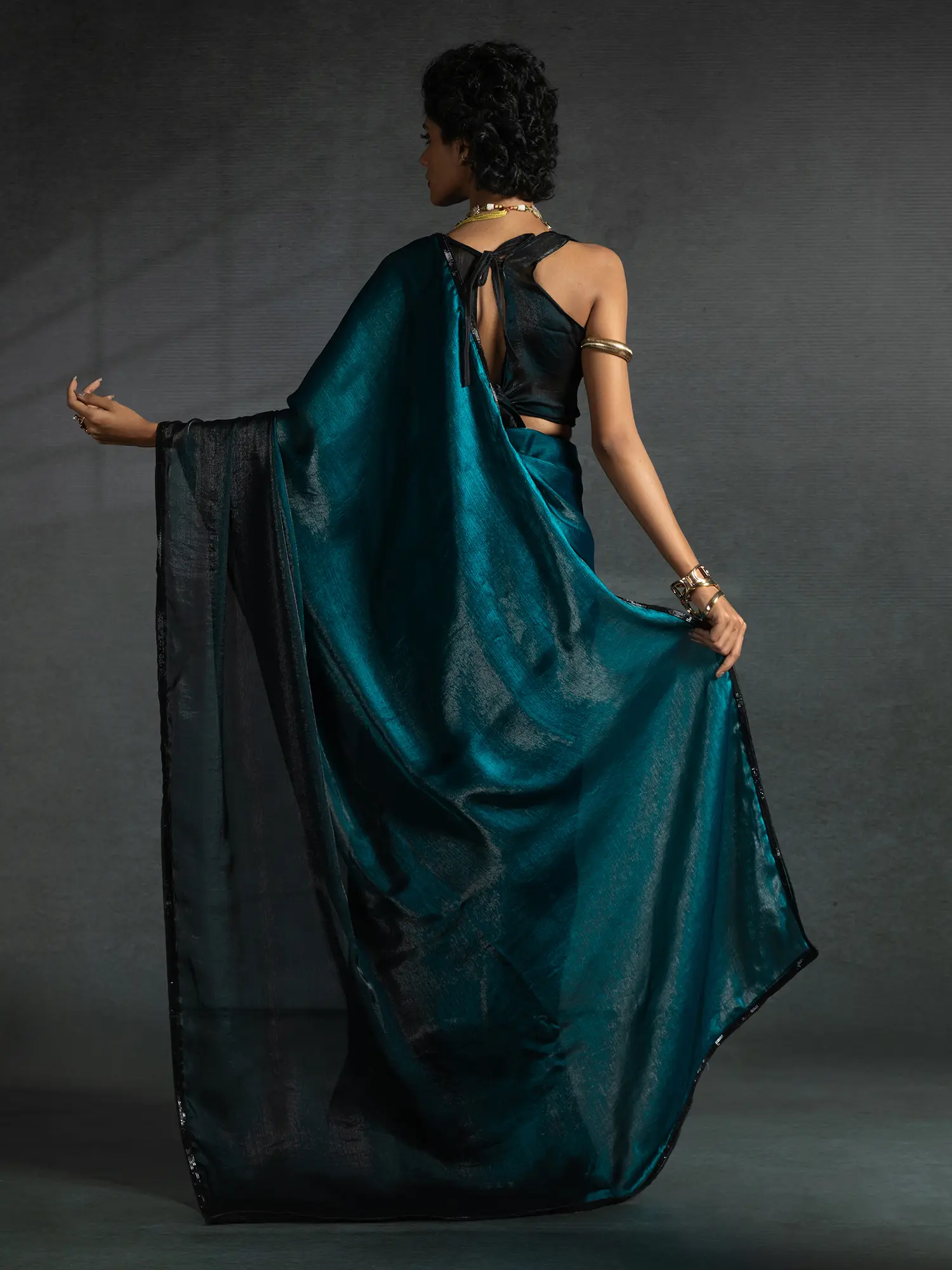 Premium Fendi Satin Silk Two Ton Shaded Saree Adorned With Heavy Hand Work Black Zircon Border Flexible Multiple Hooks