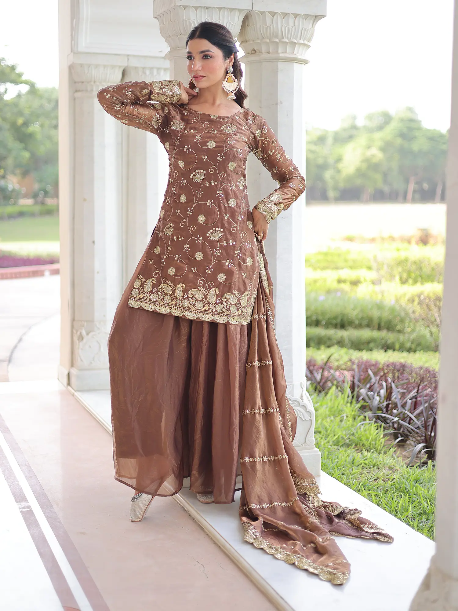 Step into a world of refined beauty and timeless sophistication with this exquisite Sharara suit. Designed to capture attention and radiate grace, this ensemble is a testament to exquisite craftsmanship and luxurious detailing. The rich, warm brown hue serves as a perfect canvas for the intricate embroidery, creating a look that is both opulent and understated.