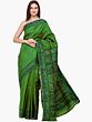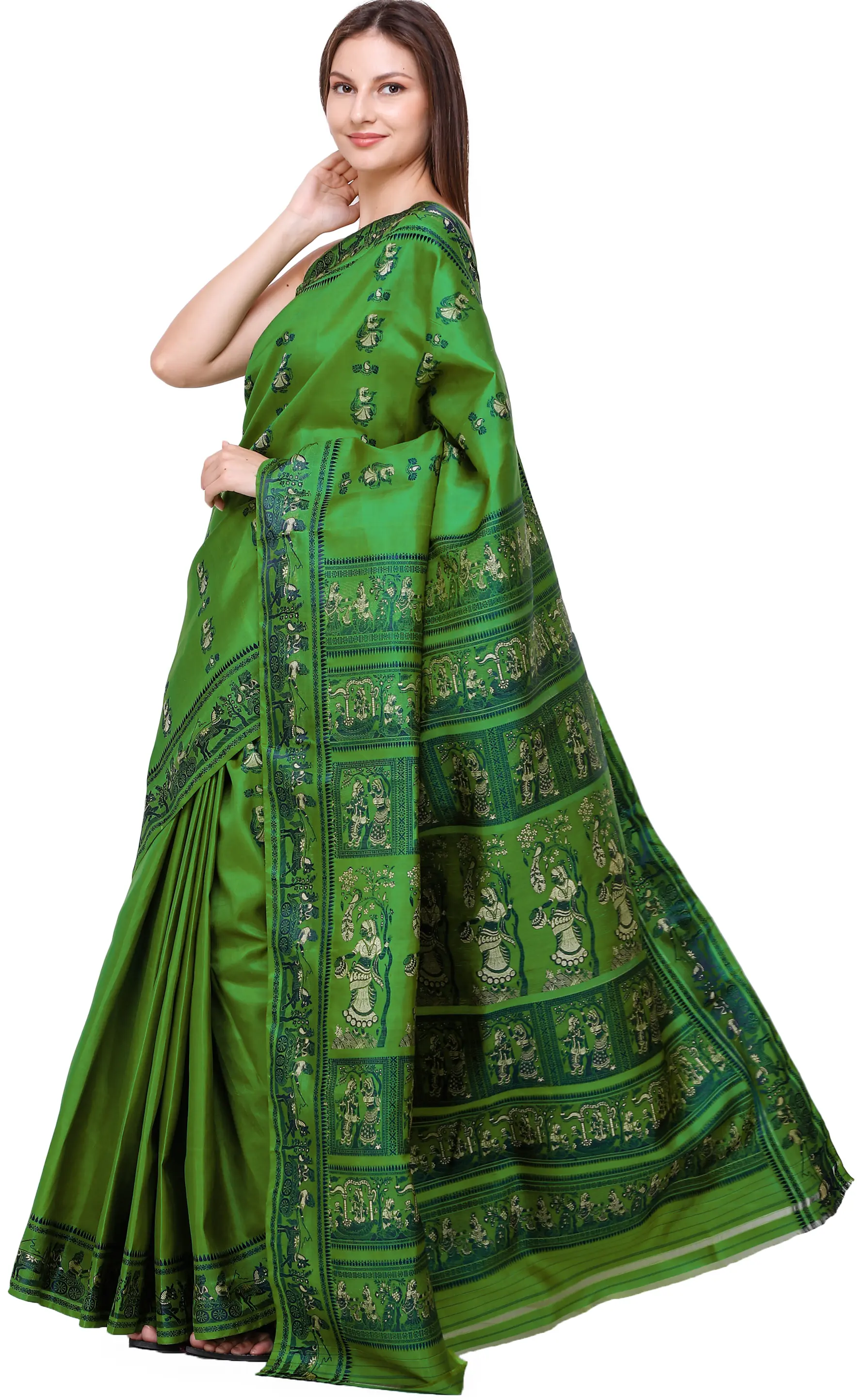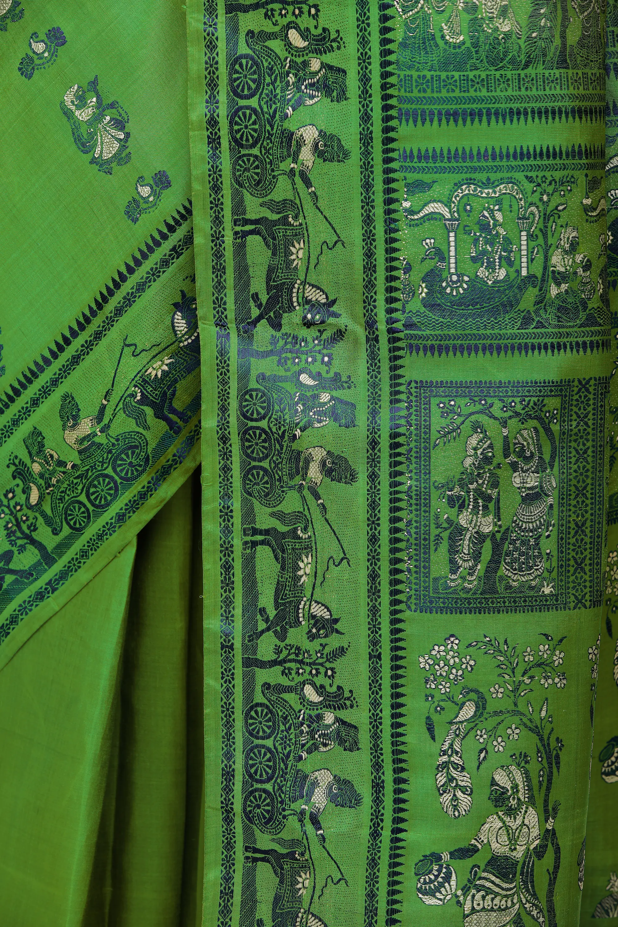 Fern-Green Baluchari Sari from Bengal with Woven Radha-Krishna