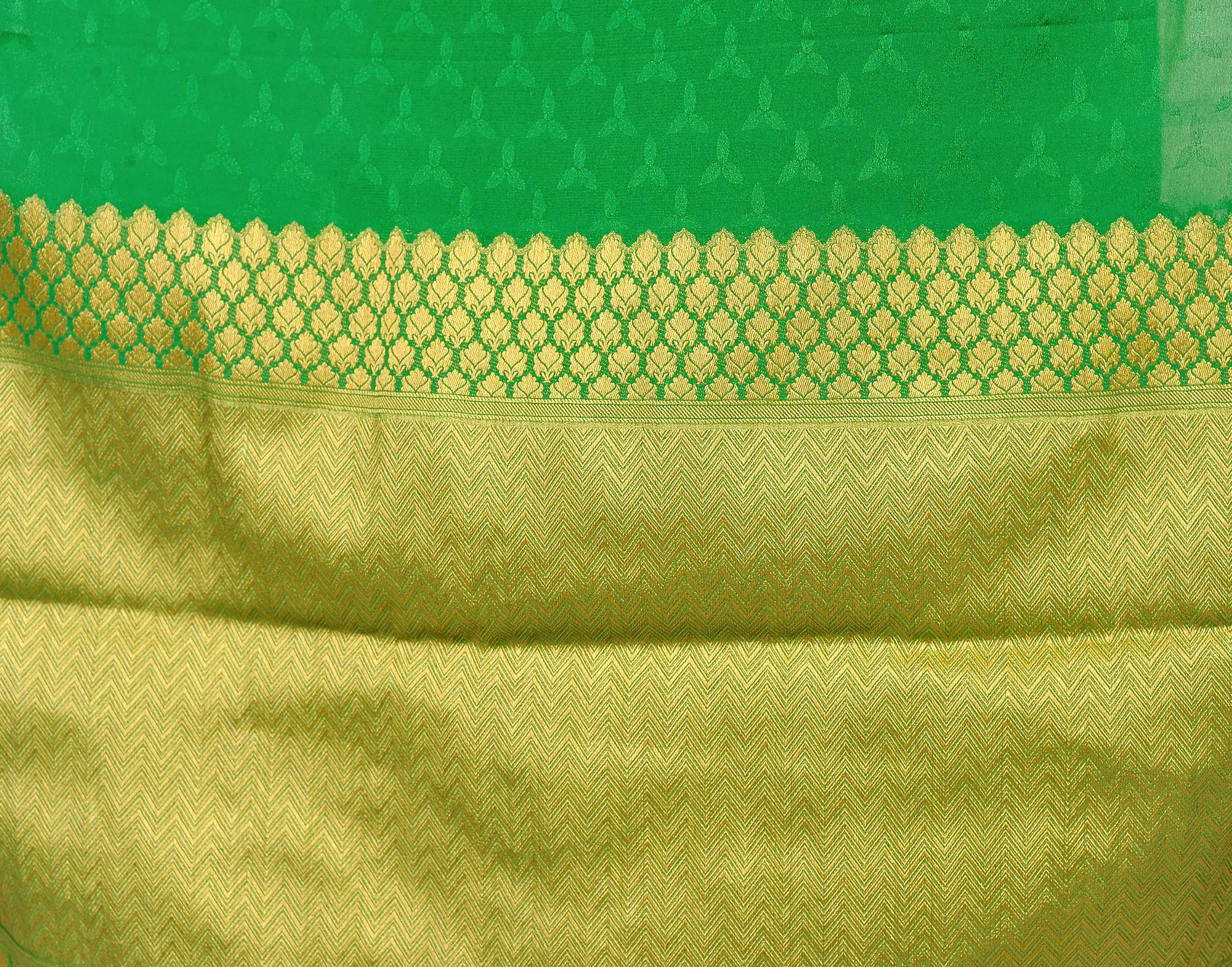 The Fern-Green Handloom Sari from Bangalore is a symbol of auspiciousness with its bright green hue. Adorned with lovely hints of golden on the border and pallu, it radiates an air of elegance and sophistication. Crafted from crepe silk, this saree strikes the perfect balance between richness and affordability, catering to modern buyers seeking both quality and style. With its self-weave and exquisite detailing, it's not just a drape but a piece of art that captures the essence of tradition and contemporary grace.