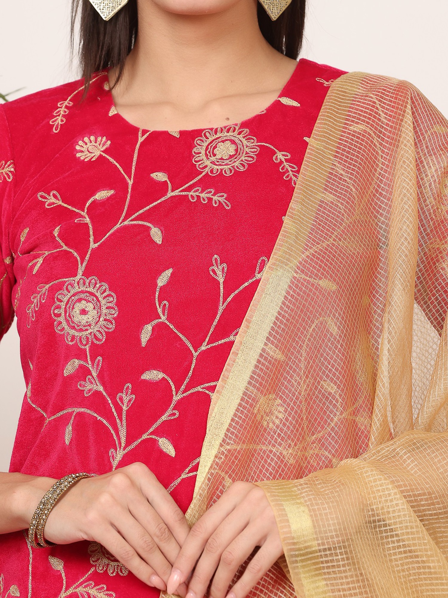 Step into a realm of sophisticated style and undeniable charm with this exquisite pink velvet kurti and sharara set. Crafted from sumptuously soft velvet, this ensemble promises not only a visually stunning appearance but also unparalleled comfort. The rich hue of the velvet provides a perfect canvas for the intricate floral embroidery that adorns the kurti. Delicate gold threads are meticulously stitched to create a mesmerizing pattern of blooming flowers and trailing vines, adding a touch of opulence and traditional artistry. The kurti features a flattering silhouette, designed to drape beautifully and accentuate your figure with grace. Its three-quarter sleeves offer a balanced coverage, making it suitable for a variety of festive occasions.