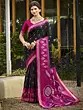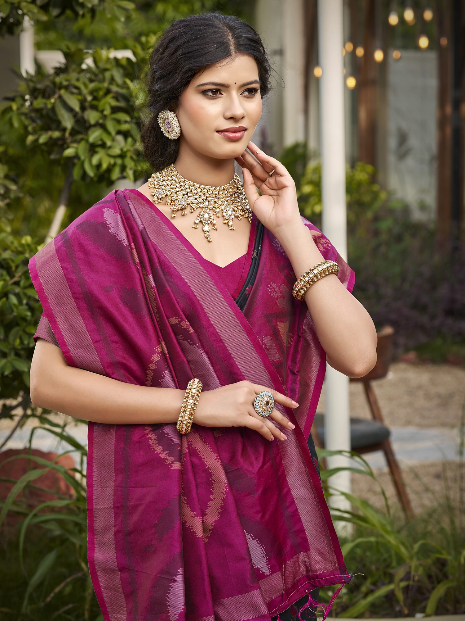 The defining feature of this captivating saree is its striking border, inspired by the intricate art of Ikat weaving. This bold, eye-catching design adds a contemporary flair to the classic silk drape, creating a harmonious blend of heritage and modern aesthetics. The vibrant pink border, adorned with detailed motifs, stands in elegant contrast to the deep black base of the saree, drawing all eyes to its intricate craftsmanship. Small, delicate motifs scattered across the black expanse further enhance the visual appeal, ensuring that every inch of this saree tells a story of meticulous artistry.